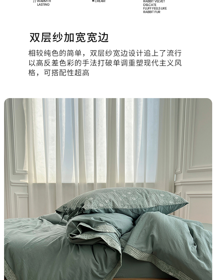 商品名称:安莱生活 2023新款全棉色织水洗棉宽边拼角蝴蝶结款四件套-缤纷花研 缤纷华妍-灰绿