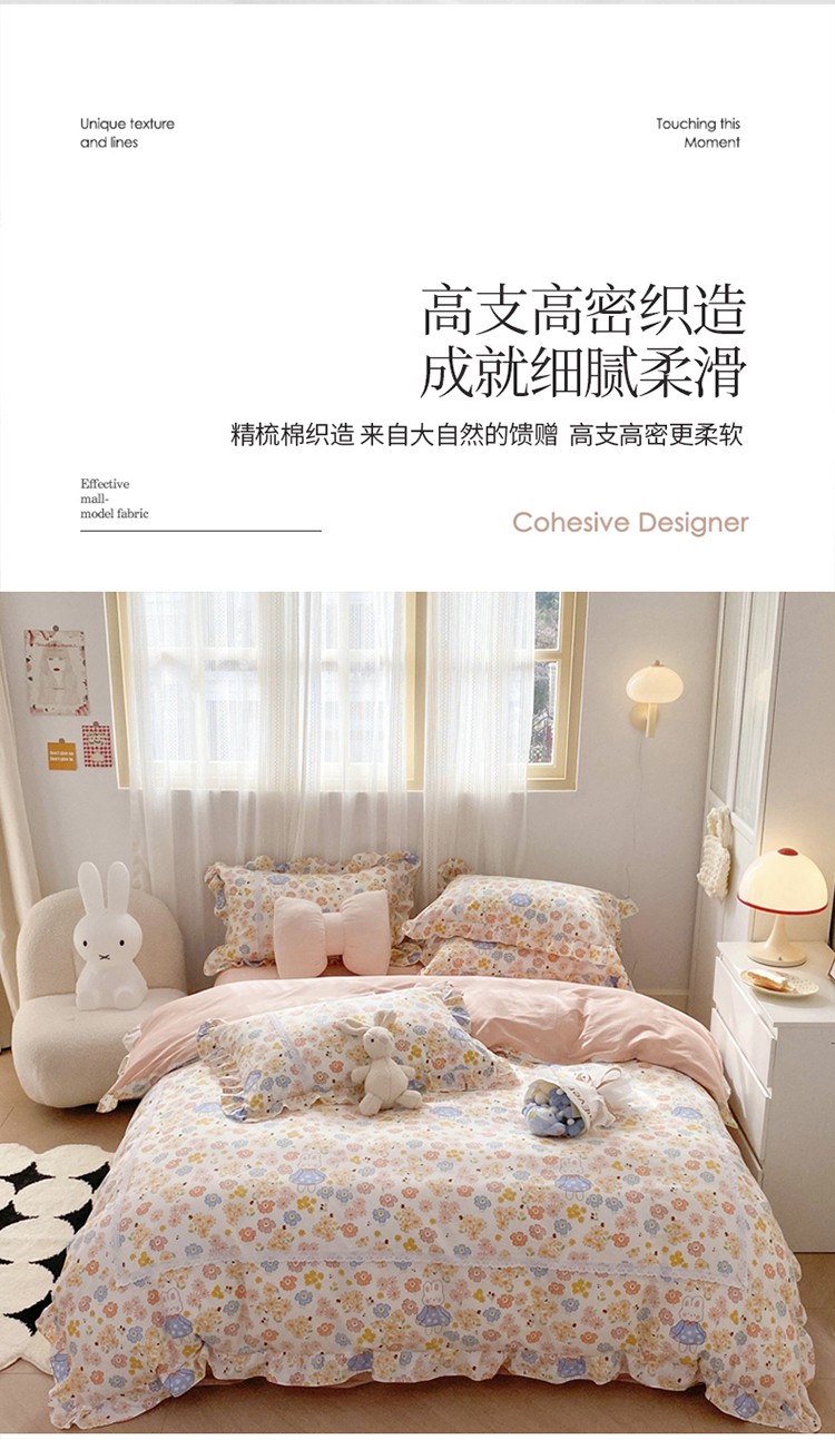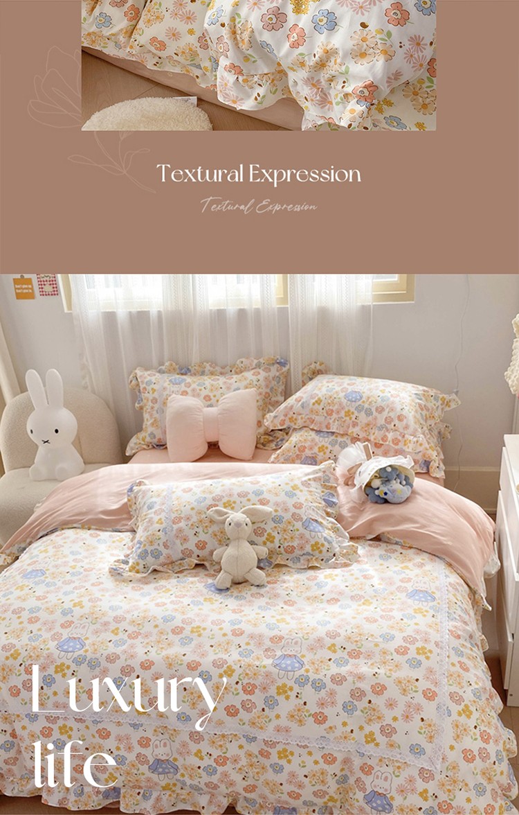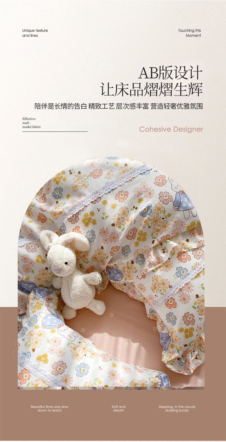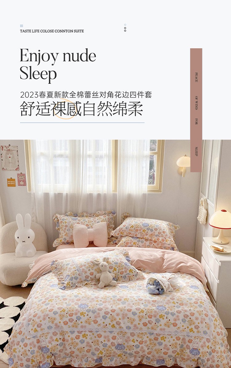 眠屿 2023春夏新款全棉蕾丝对角花边四件套 花仙兔