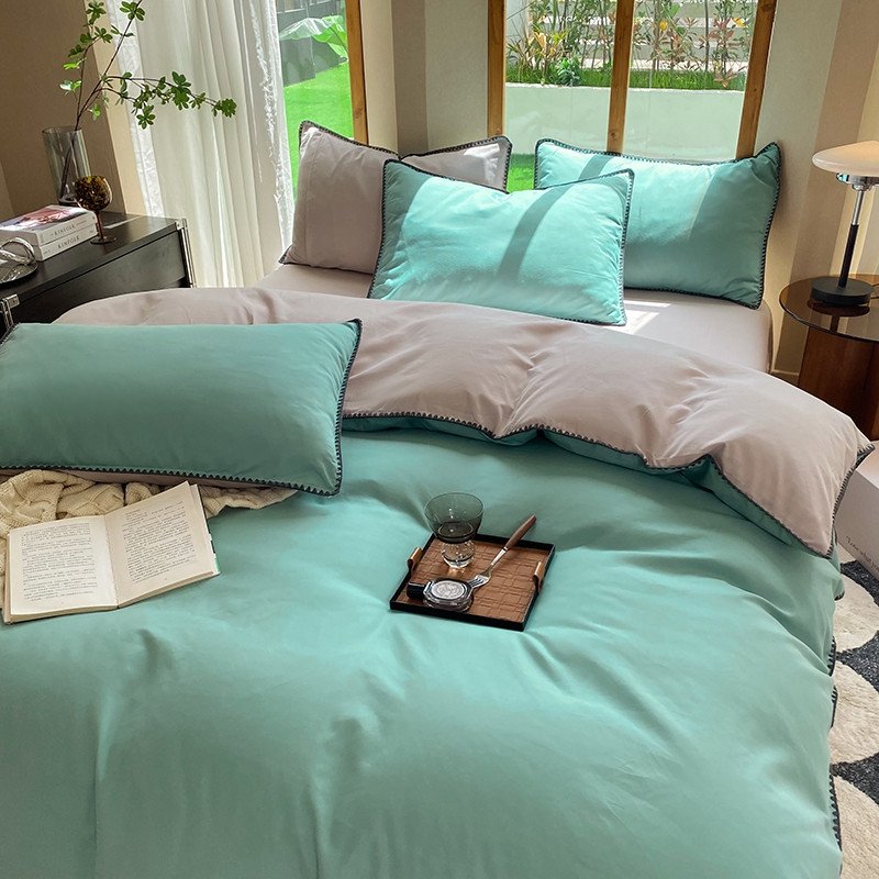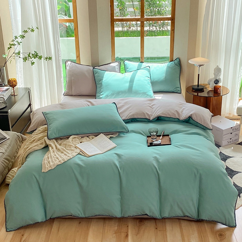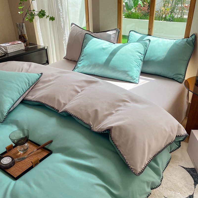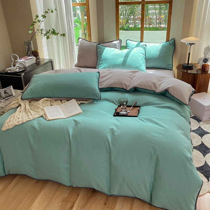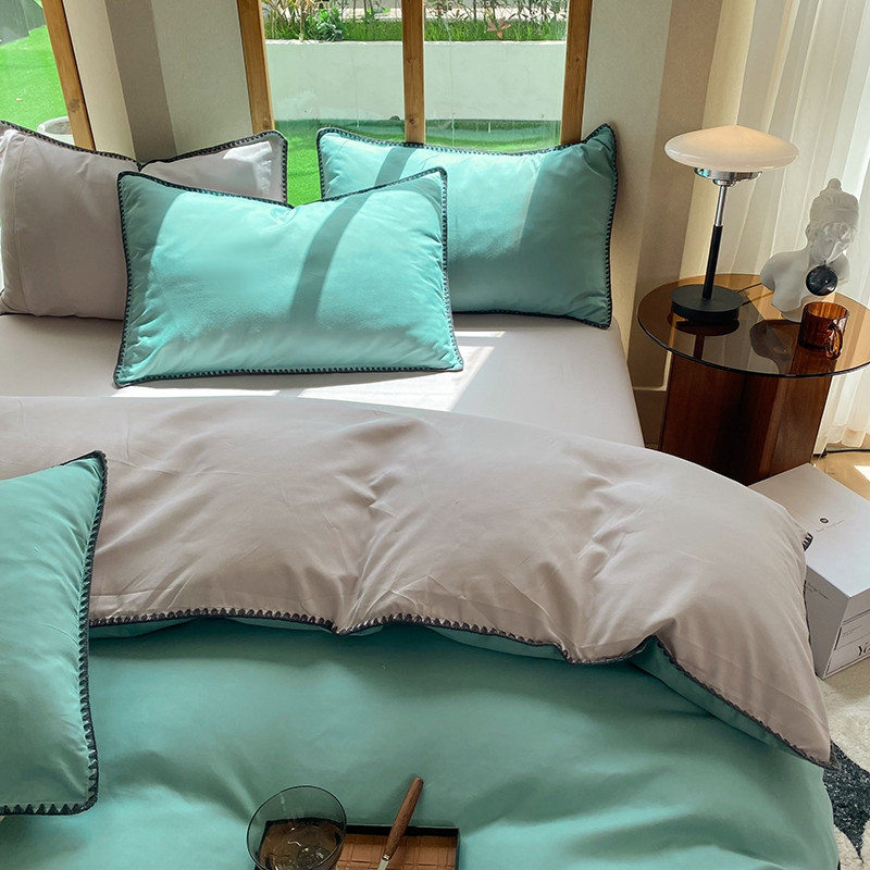 商品名称:妖妖家纺 2023新款水洗棉贝壳边纯色三角针四件套 湖蓝+浅灰