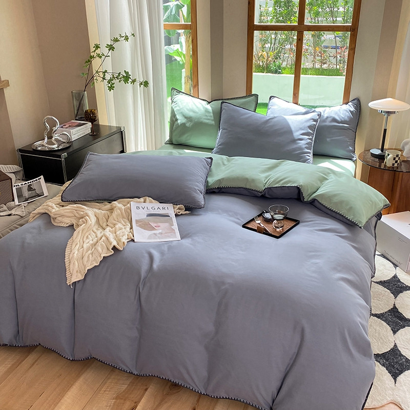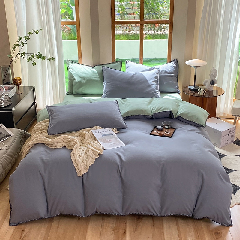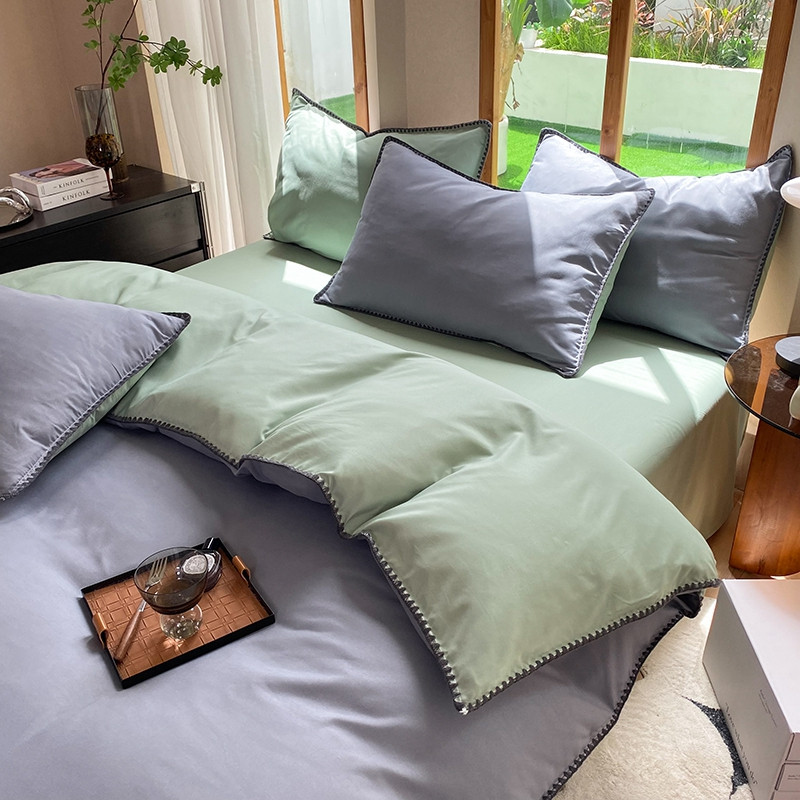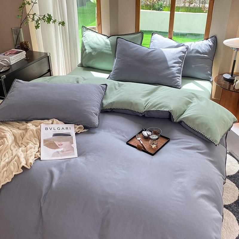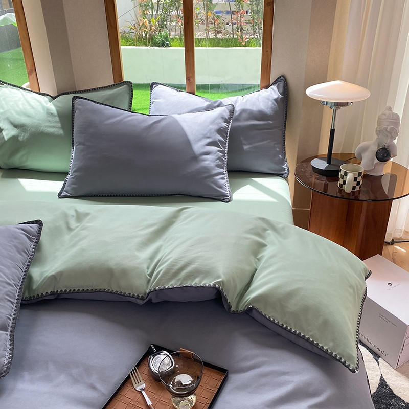 商品名称:妖妖家纺 2023新款水洗棉贝壳边纯色三角针四件套 浅紫+豆绿