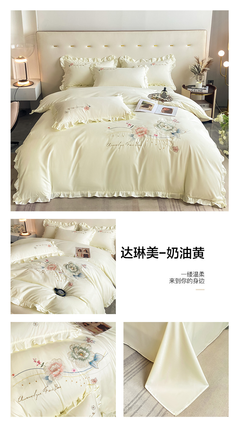 当前位置: 91家纺网 > 商品网购 > 床品套件 > 四件套 > 普通磨毛四件套 > 2023新款韩版亲肤磨毛刺绣蕾丝床裙床单如意系列四件套 达琳美-奶油黄