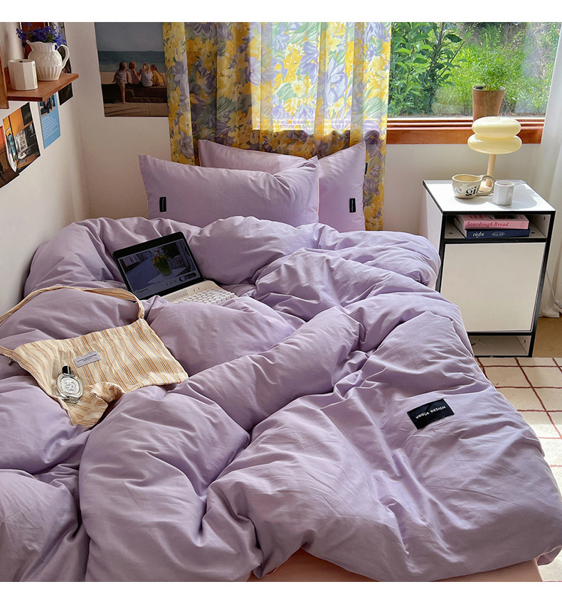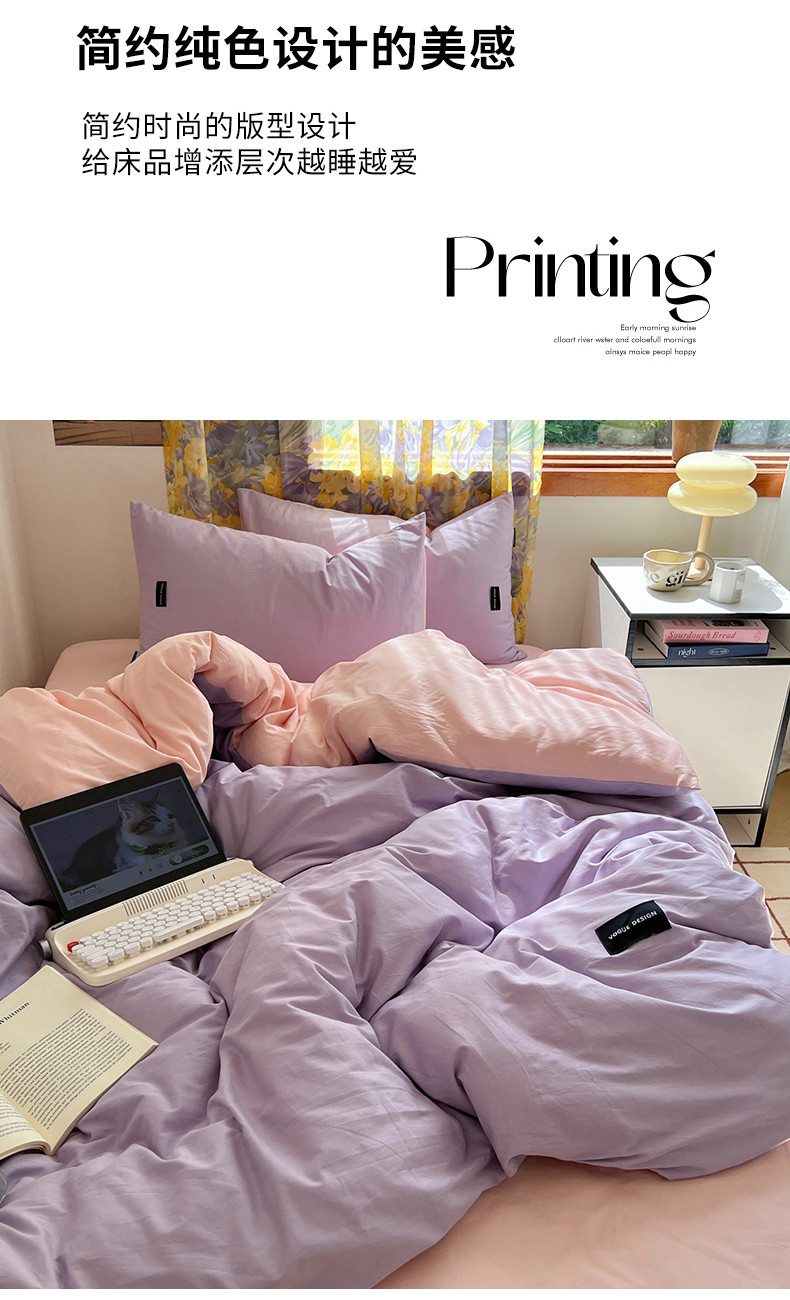 百亿莱 2024新款全棉无印风水洗棉学生宿舍三件套四件套 格调紫+仙女粉