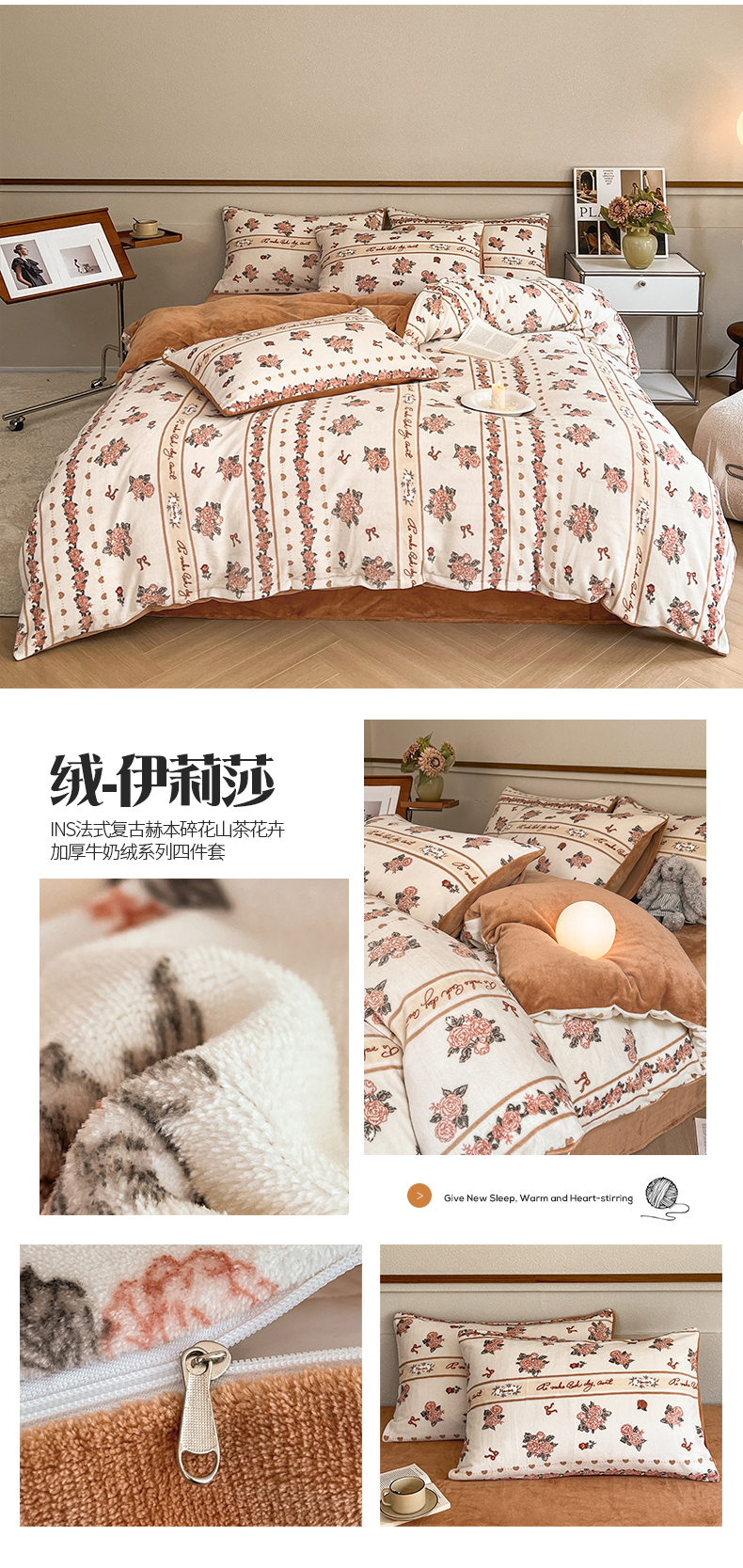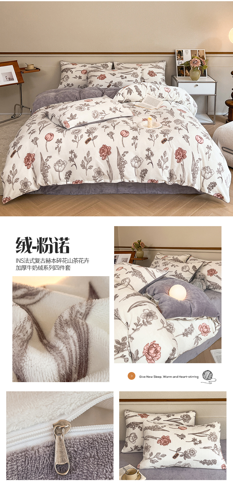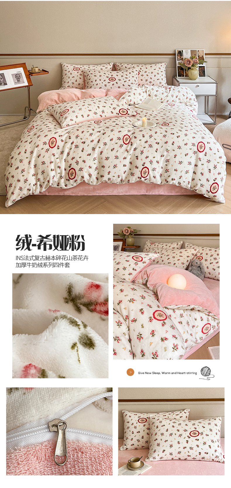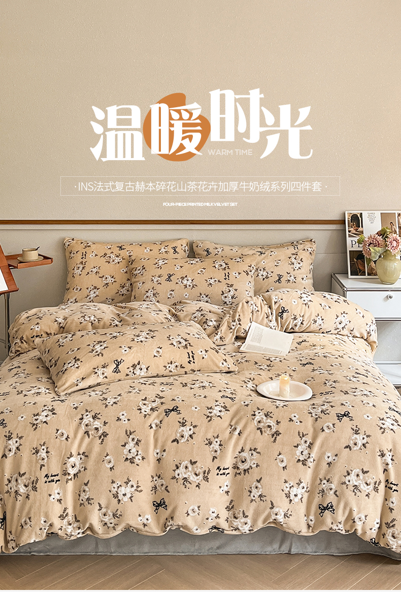 (总)桃子家居 2023新款ins法式复古赫本碎花山茶花卉加厚牛奶绒系列四件套