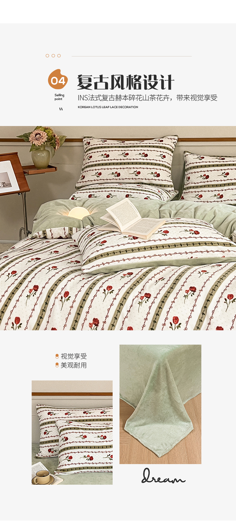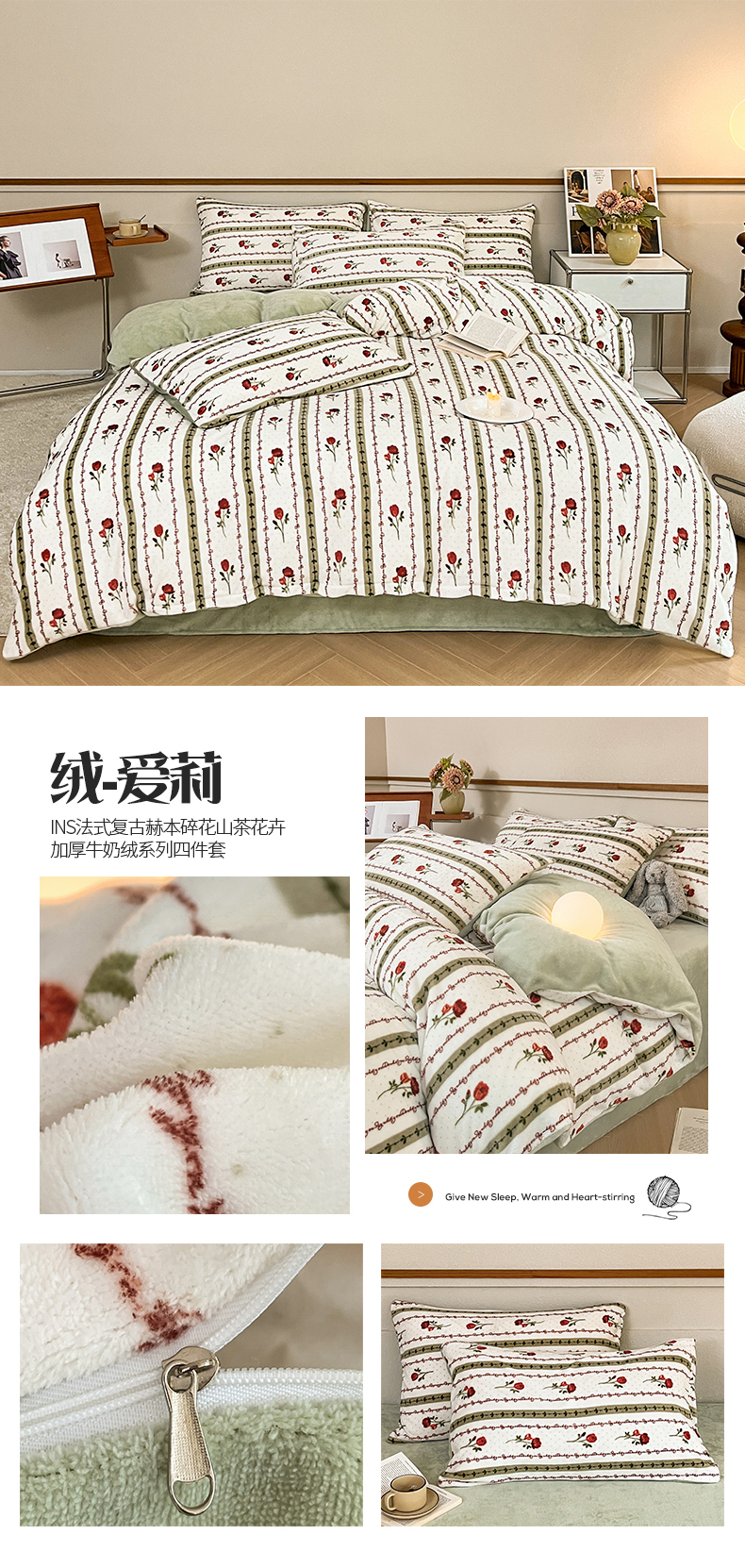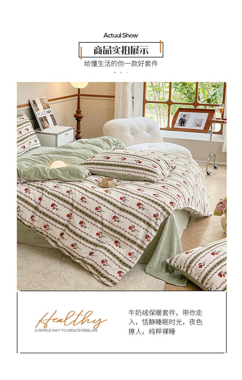 商品名称:桃子家居 2023新款ins法式复古赫本碎花山茶花卉加厚牛奶绒系列四件套 绒-爱莉
