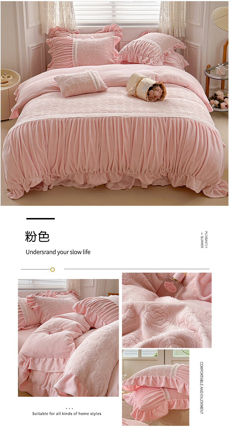 亲亲公主 2025新款牛奶绒法式玫瑰四件套 粉色