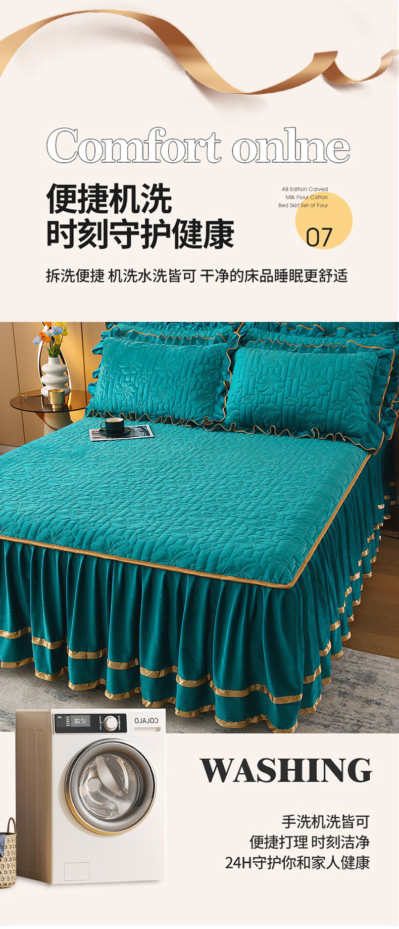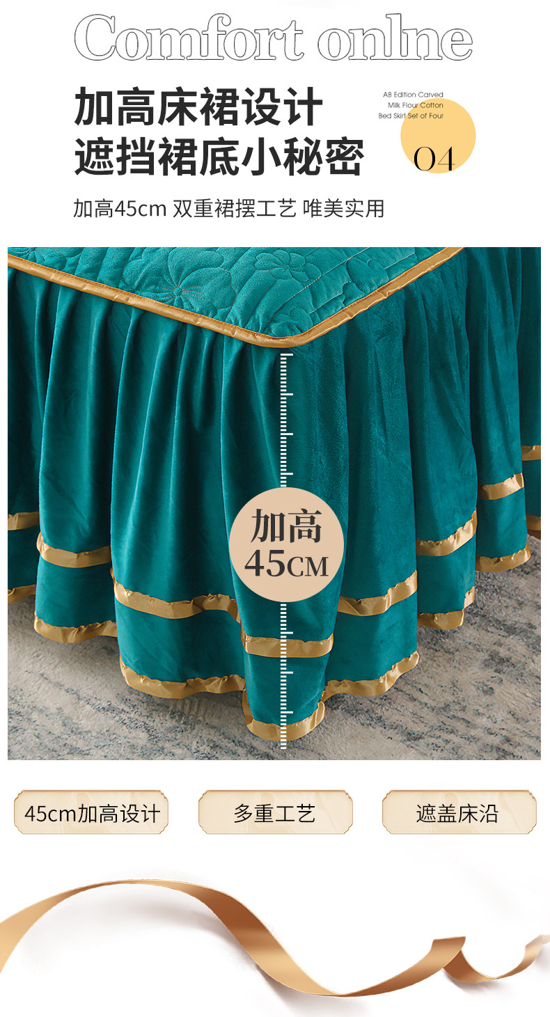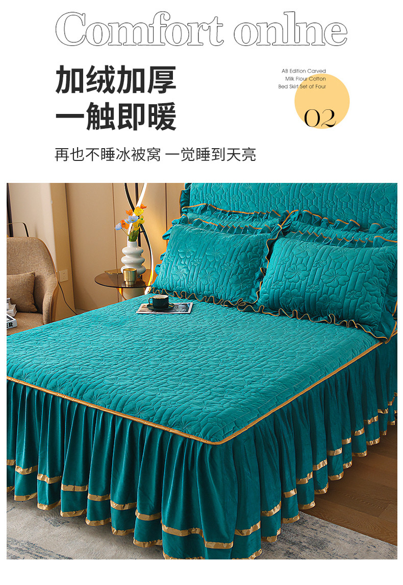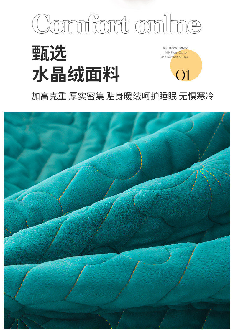 (总)屹成家纺2025新款水晶绒夹棉绗缝床裙四件套(塞纳河畔)四件套起售价不低于230元,大红,豆沙,翡翠绿,粉玉,橄榄绿,蔚蓝,银灰