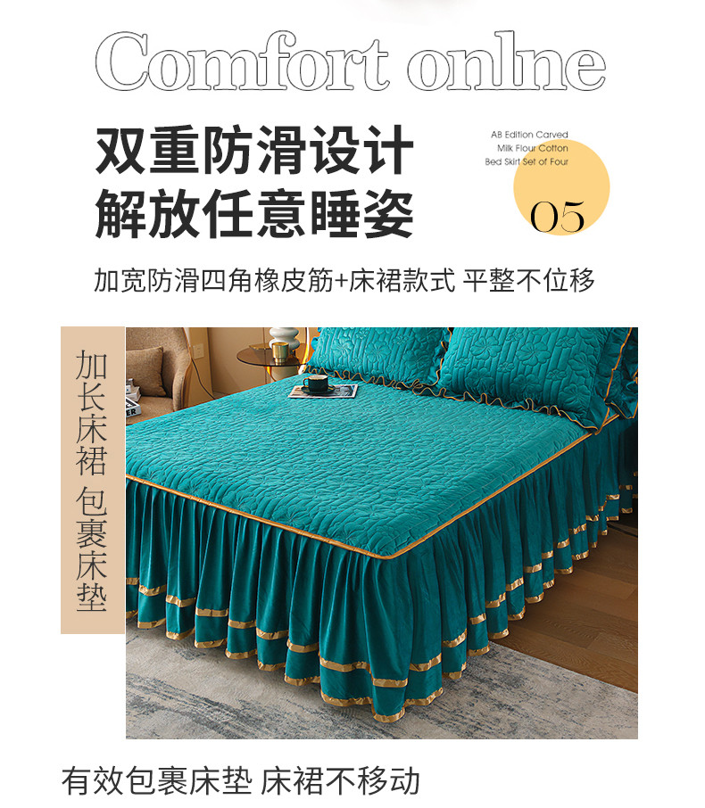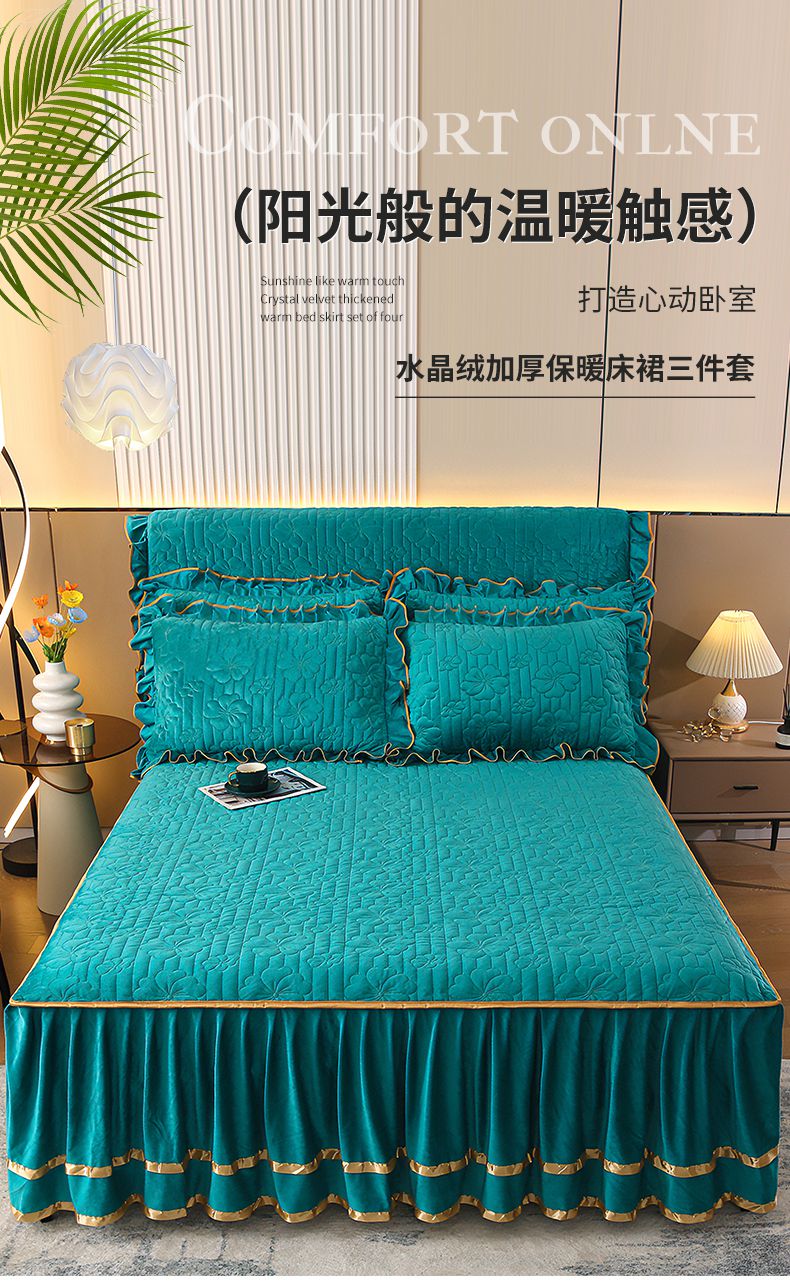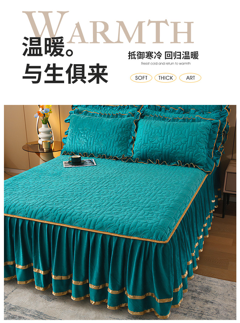 (总)屹成家纺2025新款水晶绒夹棉绗缝蕾丝床裙三件套(塞纳河畔)床裙单件起售价不低于105元,大红,豆沙,翡翠绿,粉玉,橄榄绿,蔚蓝,银灰