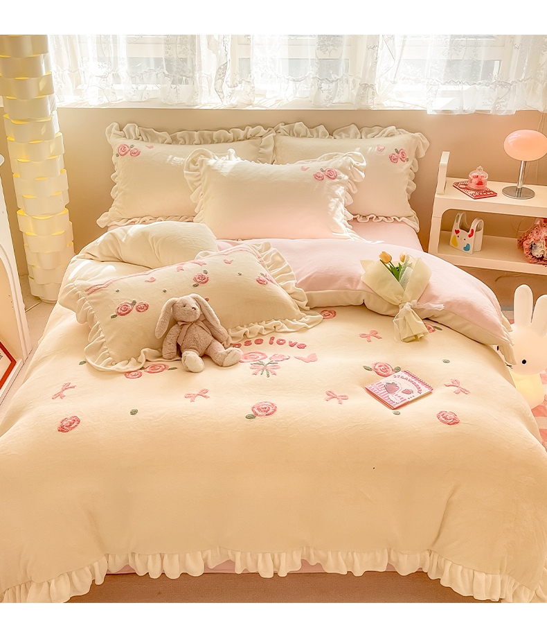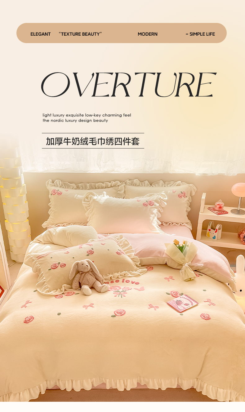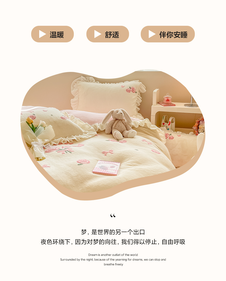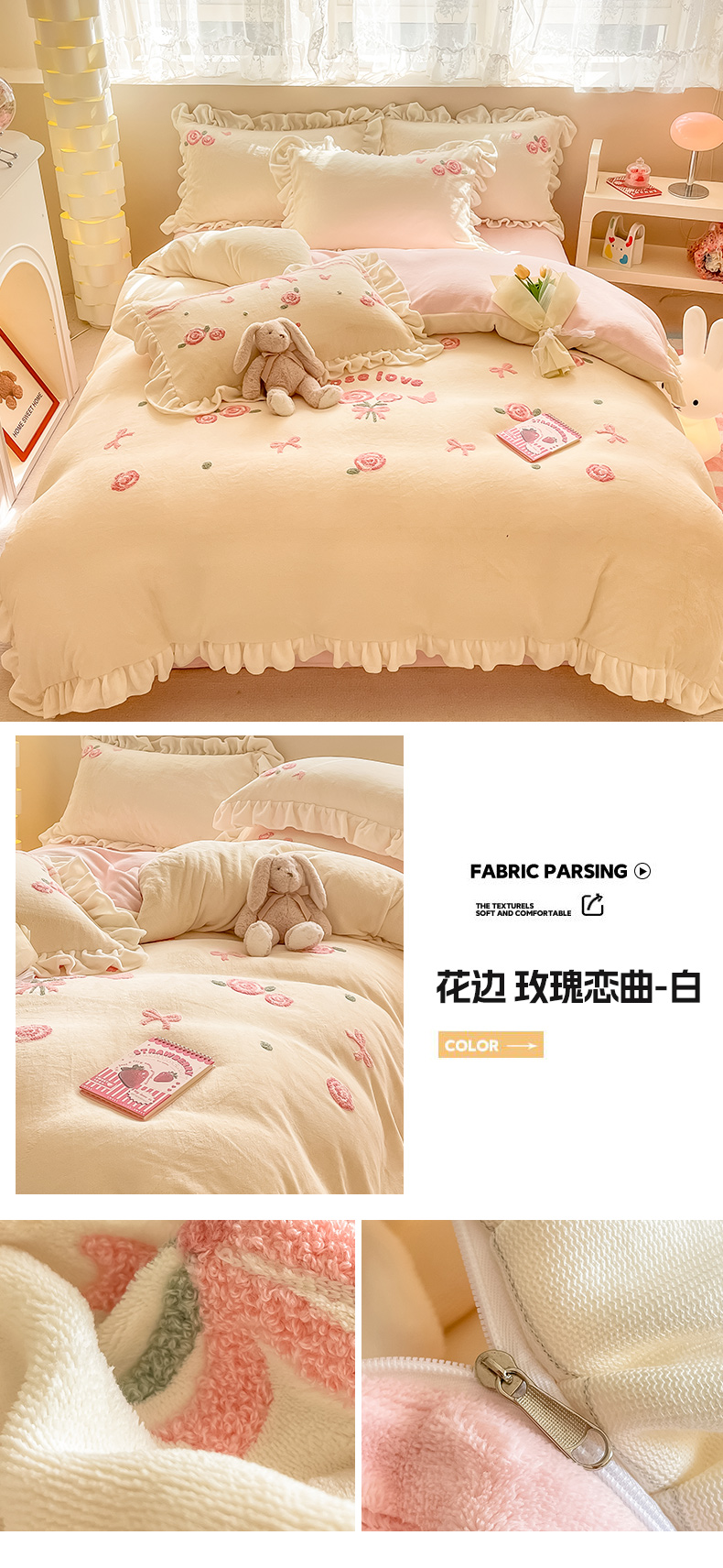 当前位置: 91家纺网 > 商品网购 > 床品套件 > 四件套 > 牛奶绒四件套 > 眠屿家纺2023新款花边款毛巾绣牛奶绒四件套(温馨版)花边玫瑰恋曲-白