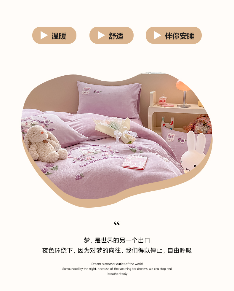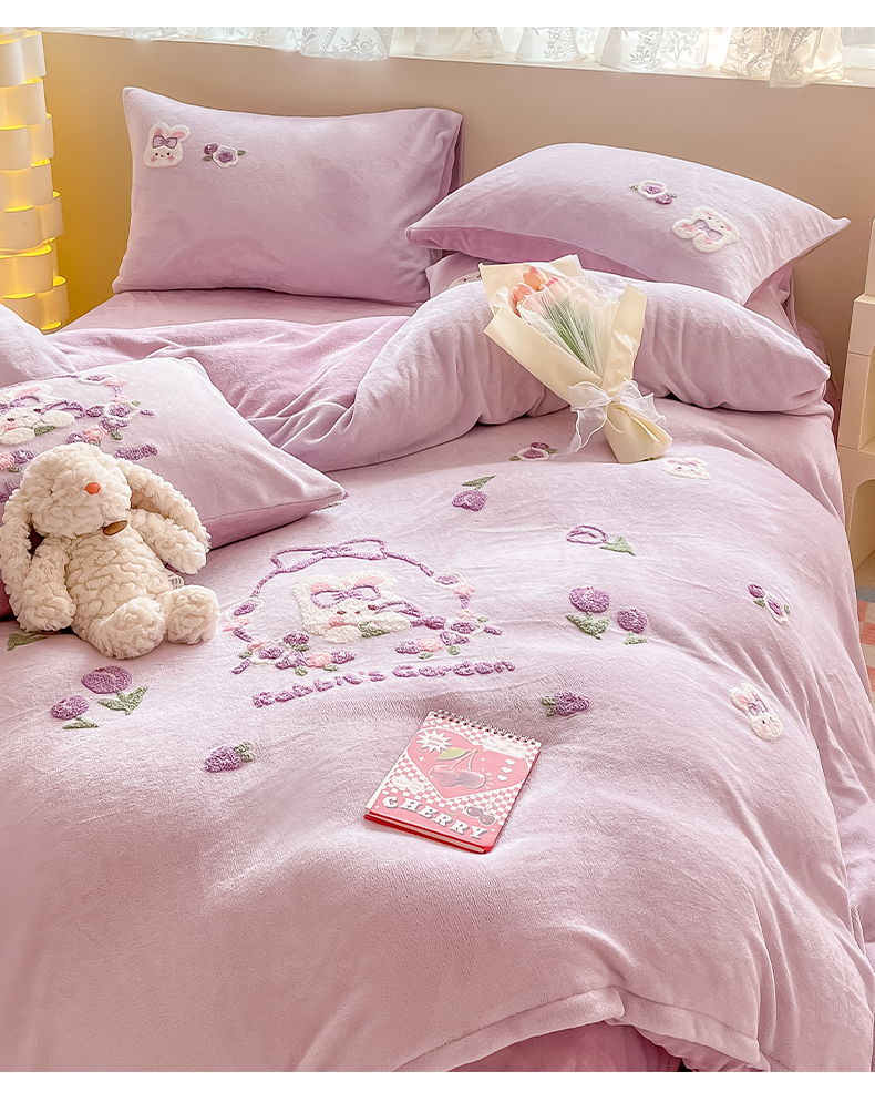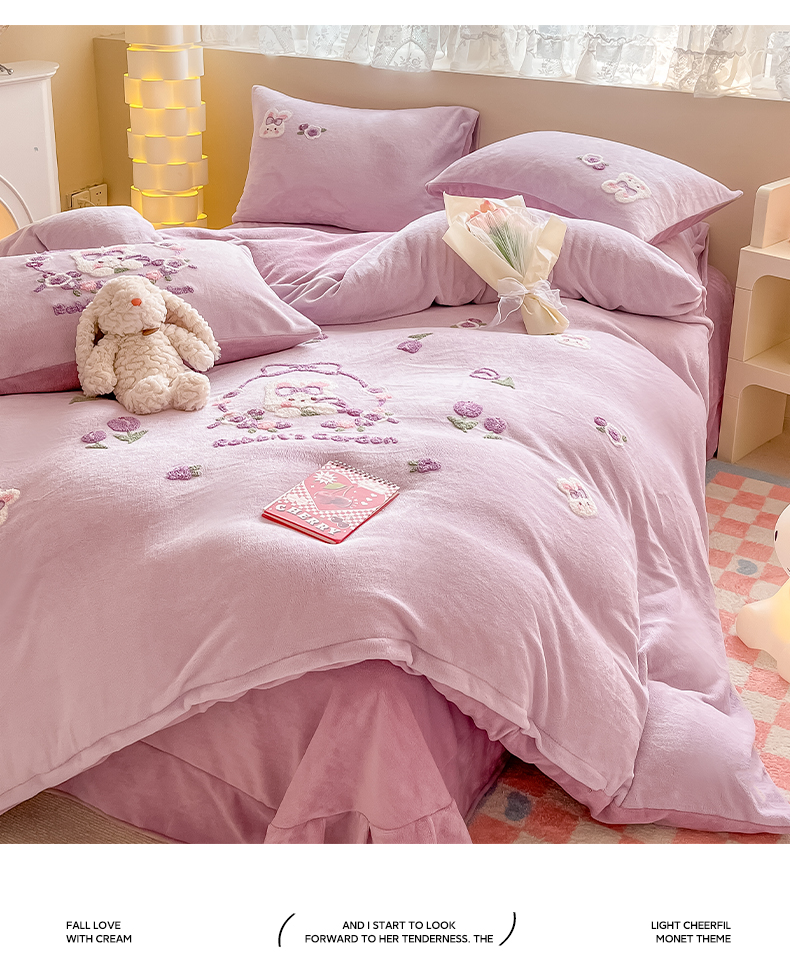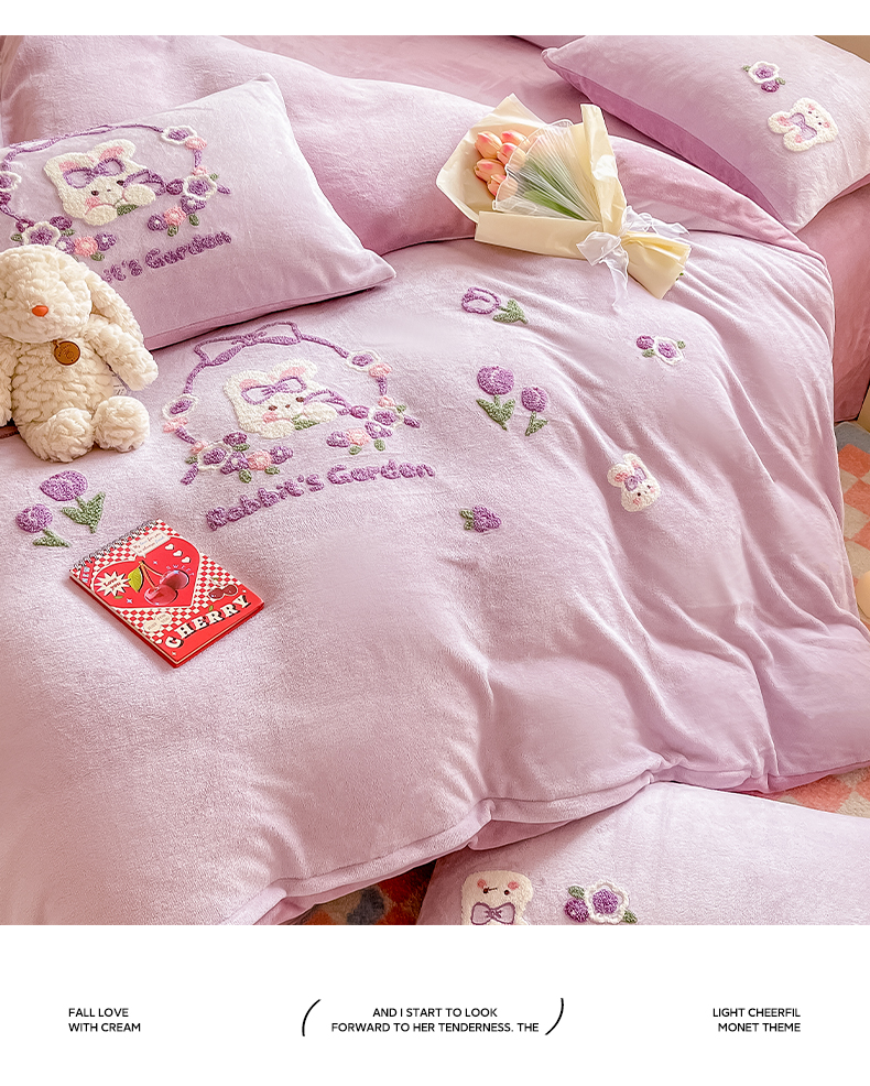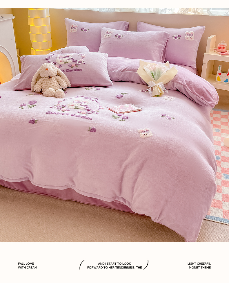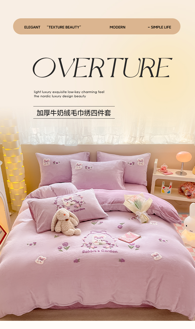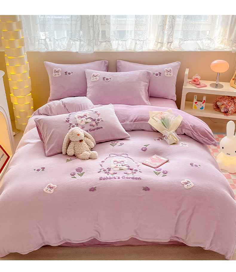 当前位置: 91家纺网 > 商品网购 > 床品套件 > 四件套 > 牛奶绒四件套 > 眠屿家纺 2023新款牛奶绒毛巾绣四件套(温馨版) 兔子花园-紫