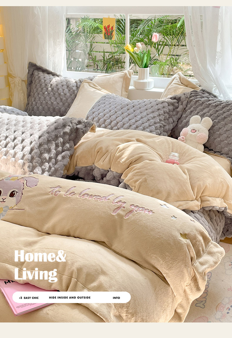 (总)爱上家居 2024新款AB版兔兔绒牛奶绒四件套,粉色,灰色,绿色,驼色,紫色