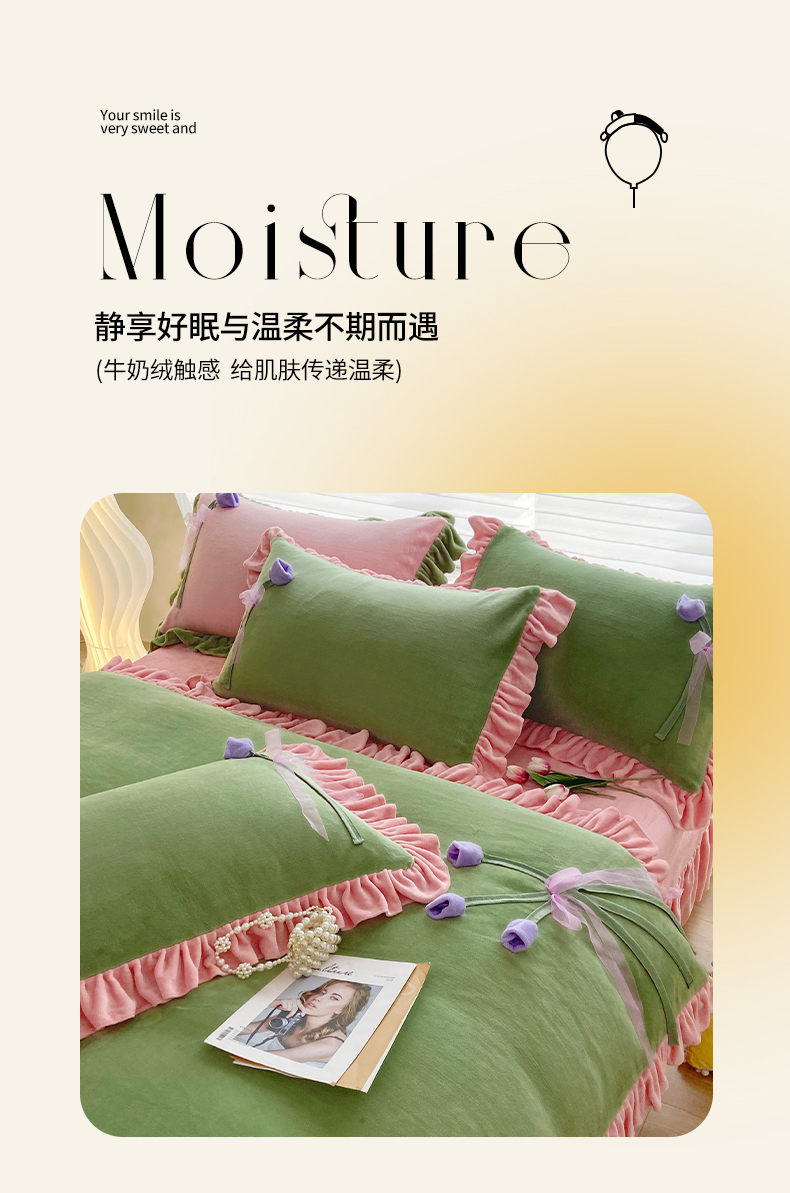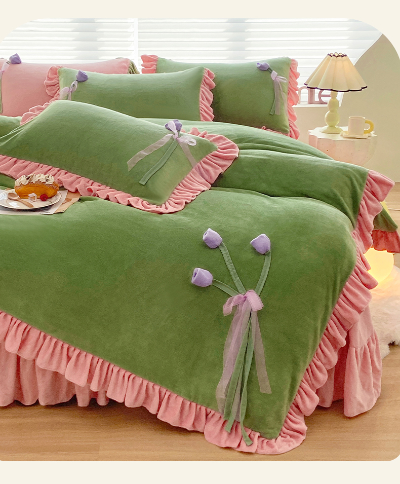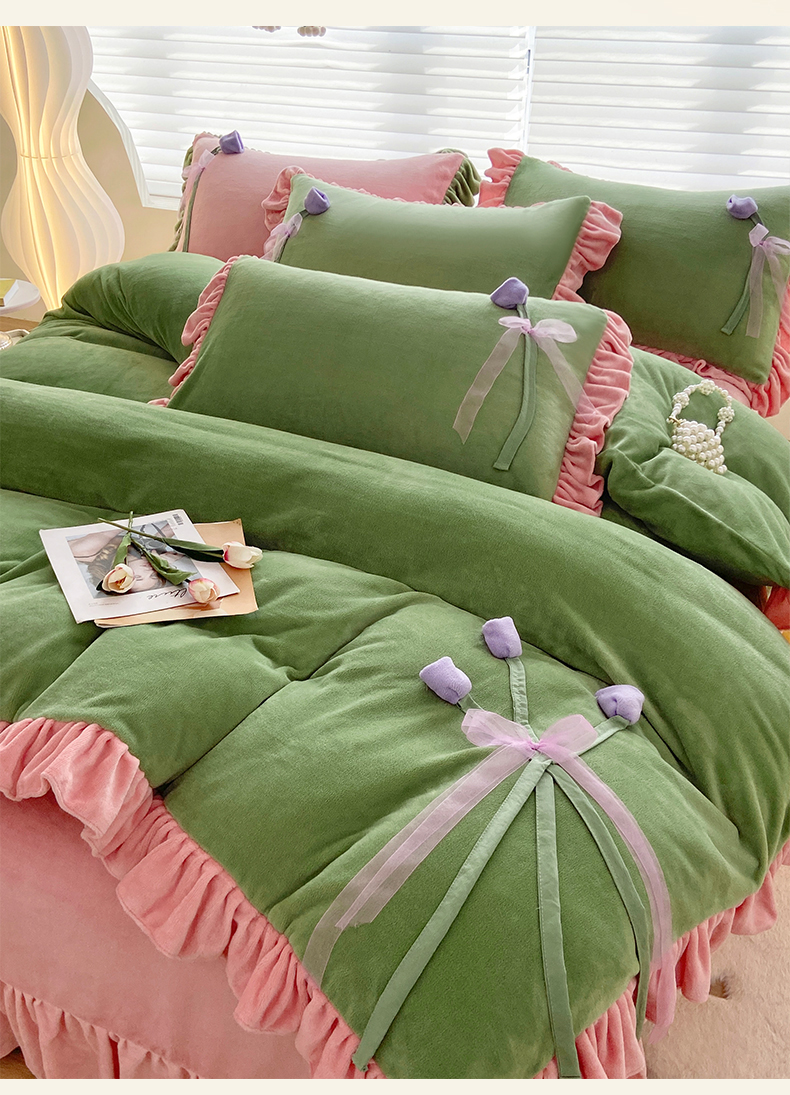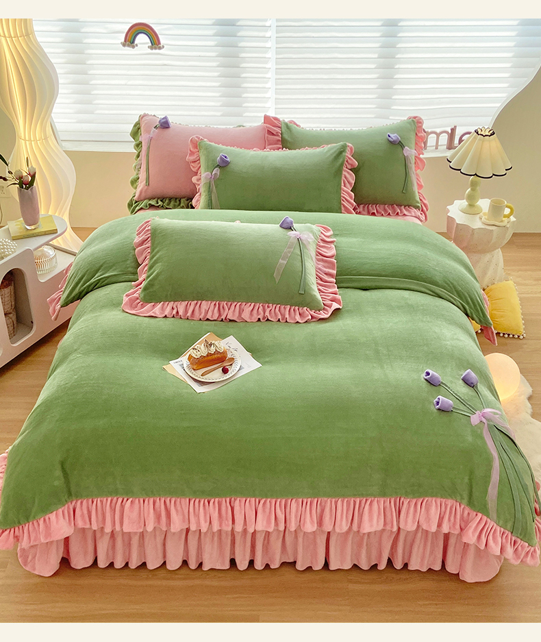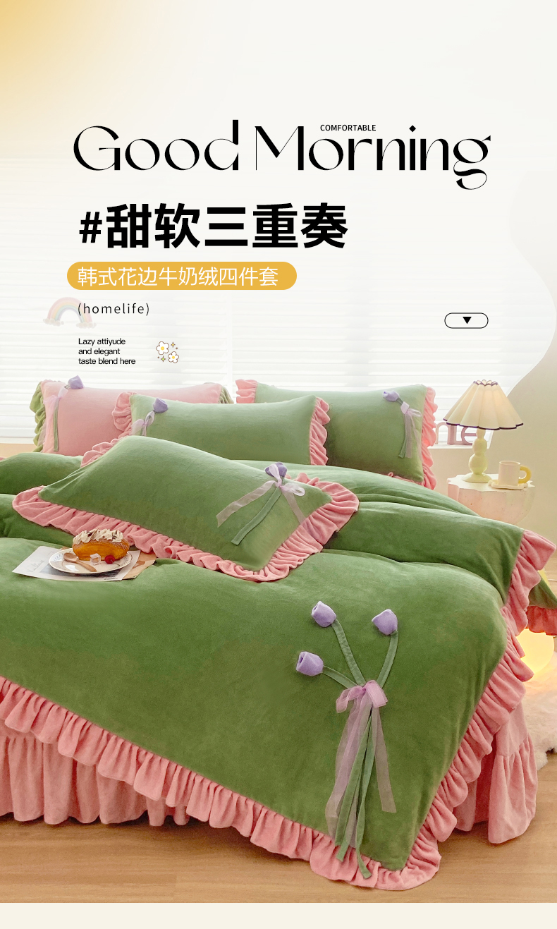 言熙居 2024新款法莱绒牛奶绒高克重郁金香系列韩版四件套 郁金香绿