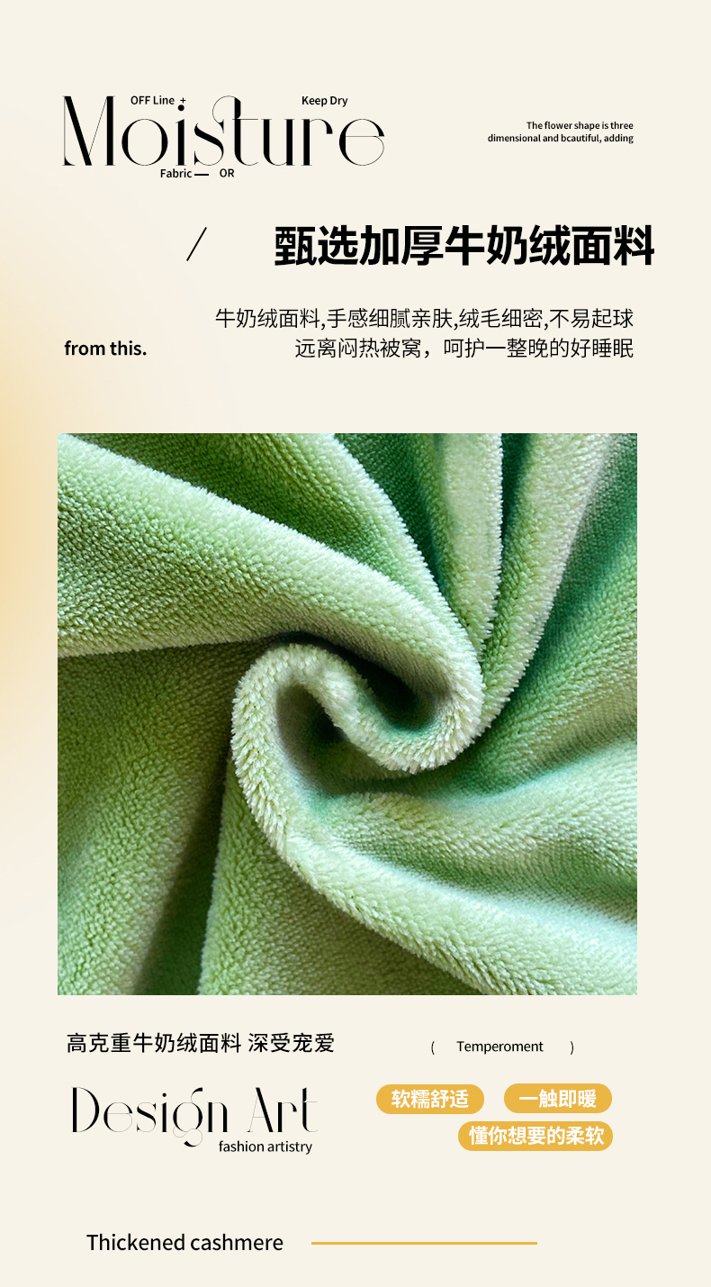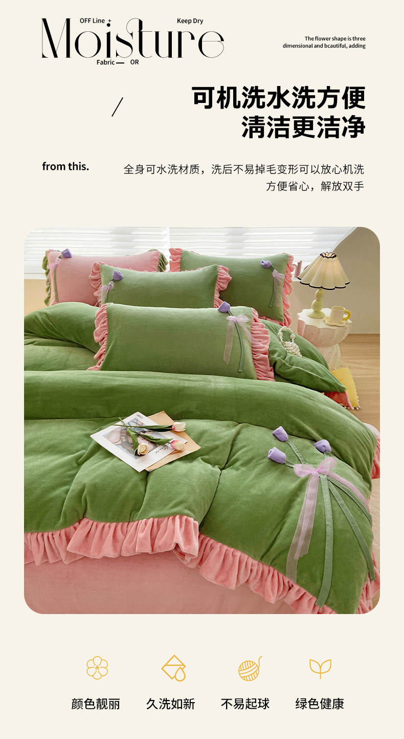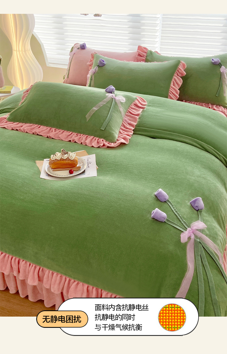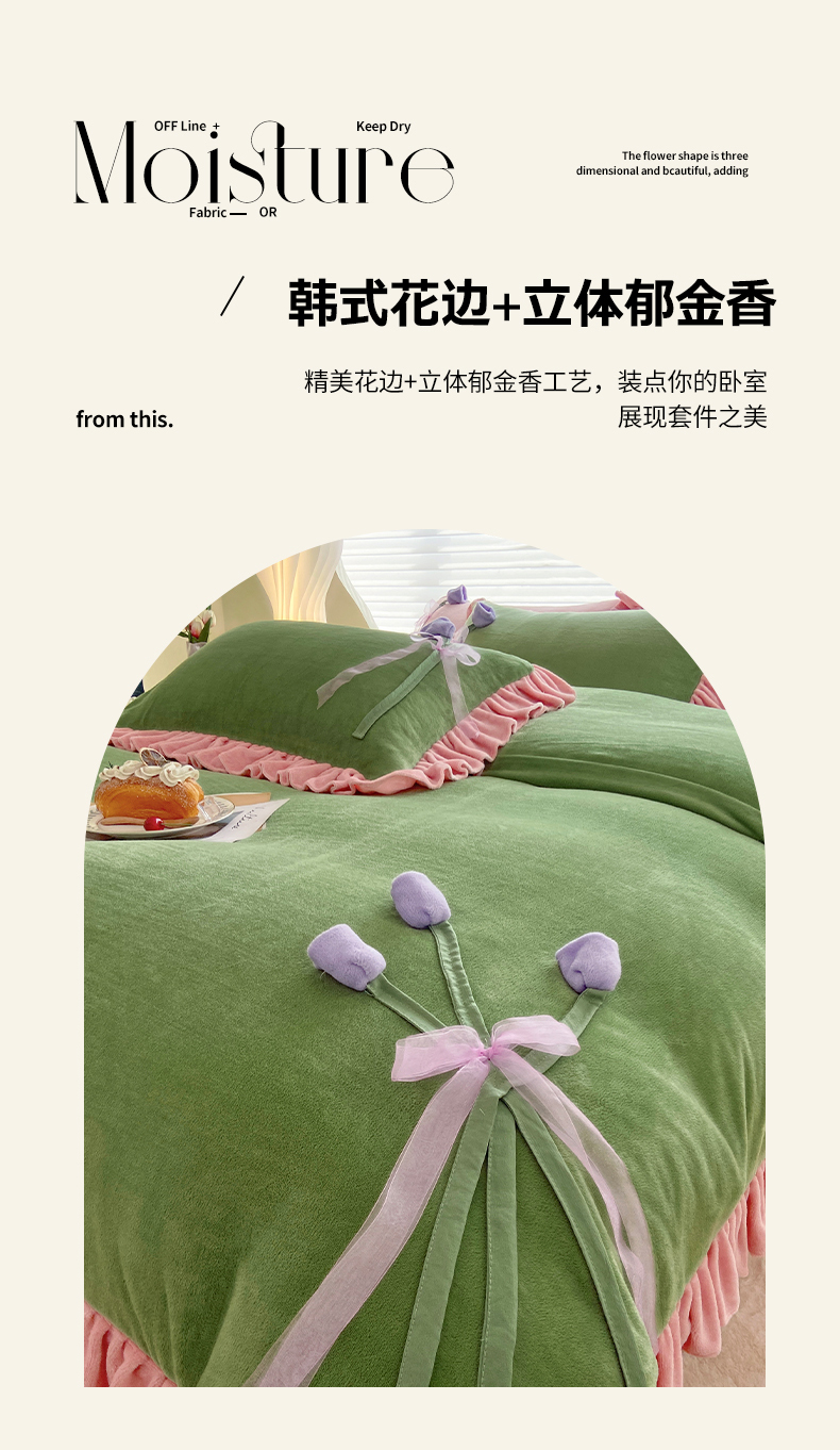 商品名称:言熙居 2024新款法莱绒牛奶绒高克重郁金香系列韩版四件套 郁金香绿