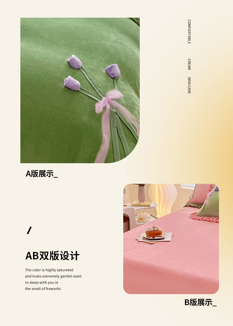 (总)言熙居 2024新款法莱绒牛奶绒高克重韩版四件套-郁金香系列,郁金香黄,郁金香粉,郁金香蓝,郁金香绿