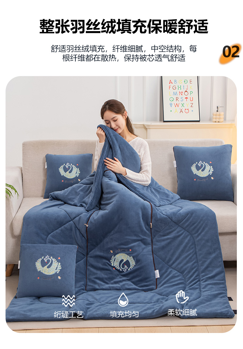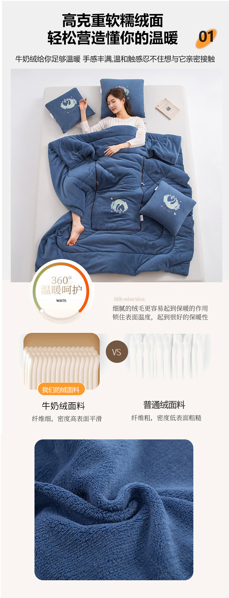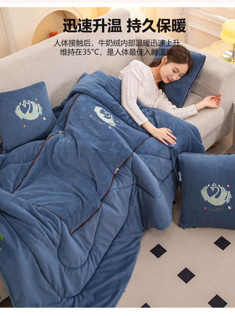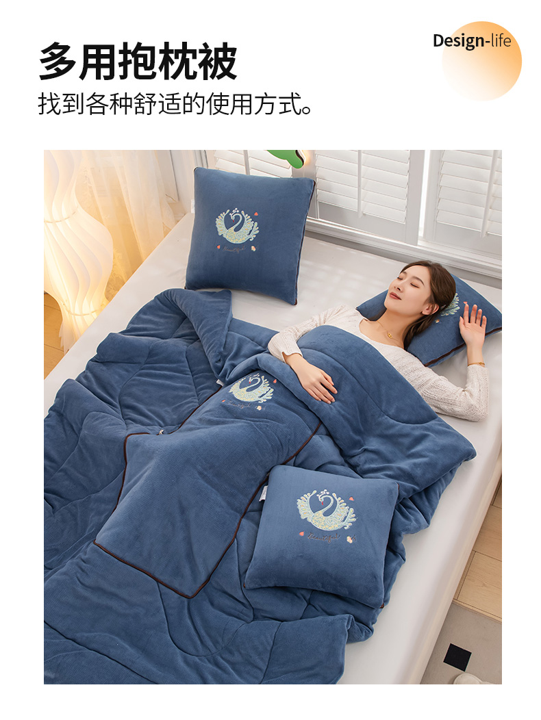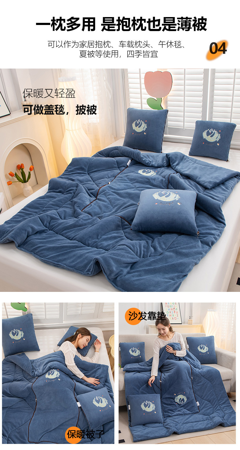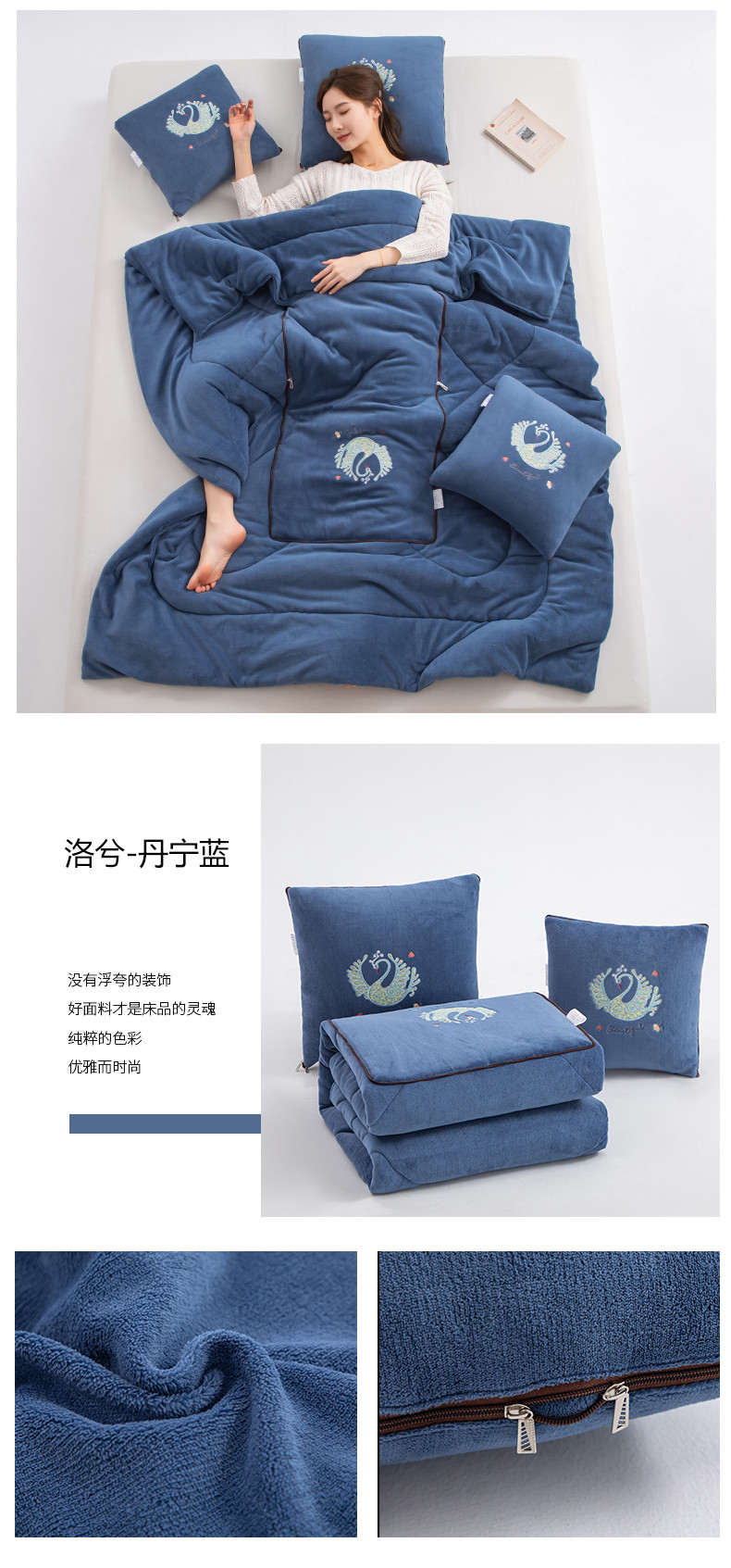 商品名称:翰轩家居 2023新款牛奶绒轻奢大牌风刺绣抱枕被 洛兮-丹宁蓝