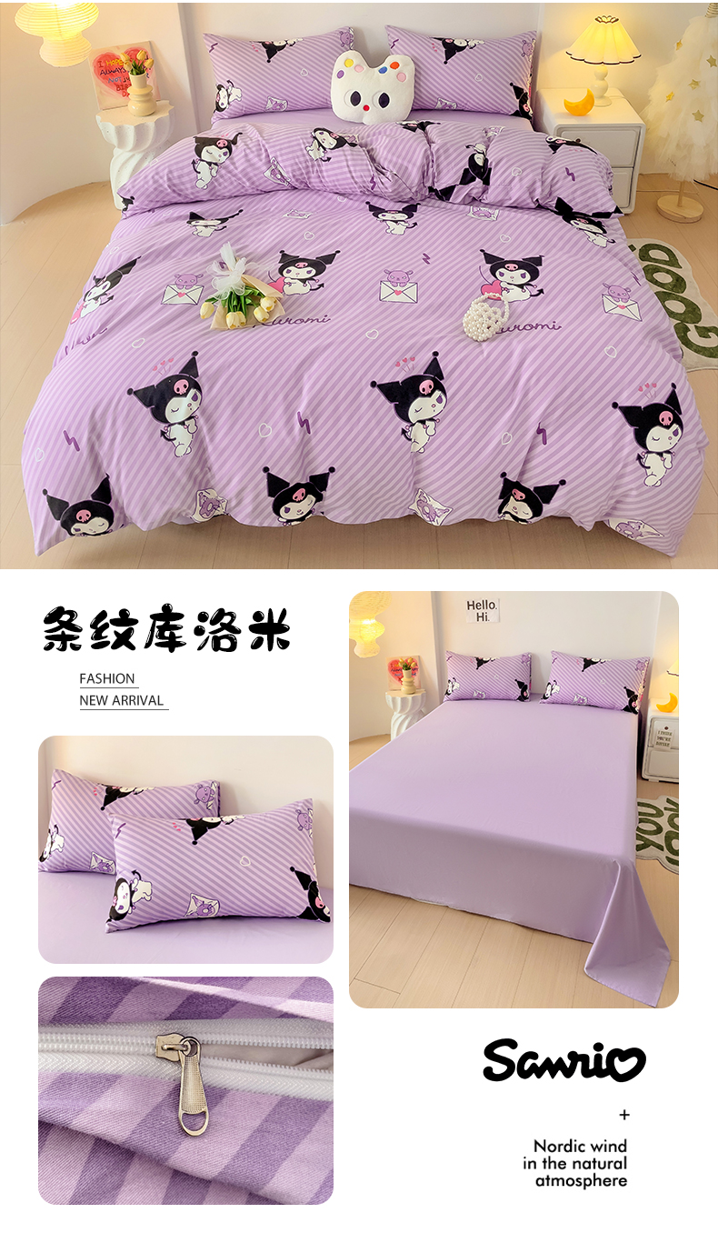 珺柔家纺 2024新款13070全棉三丽鸥系列四件套 条纹库洛米