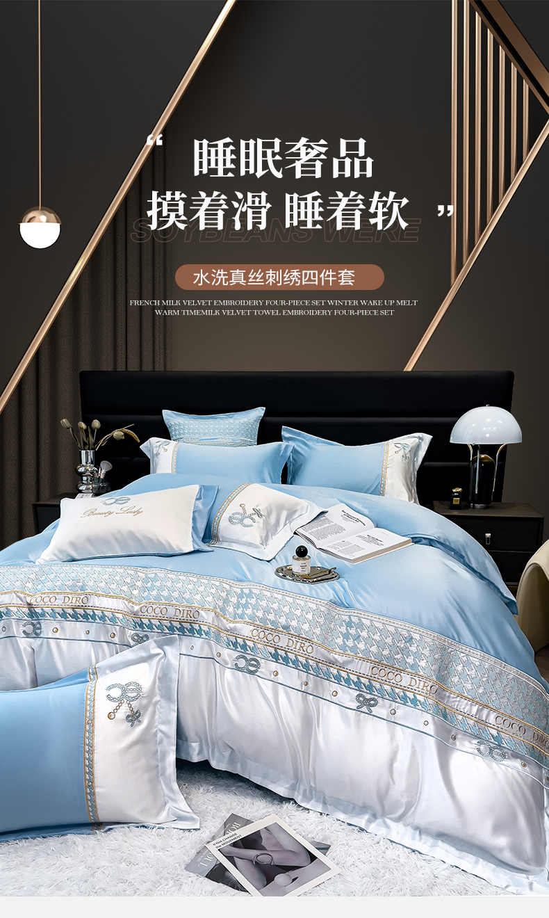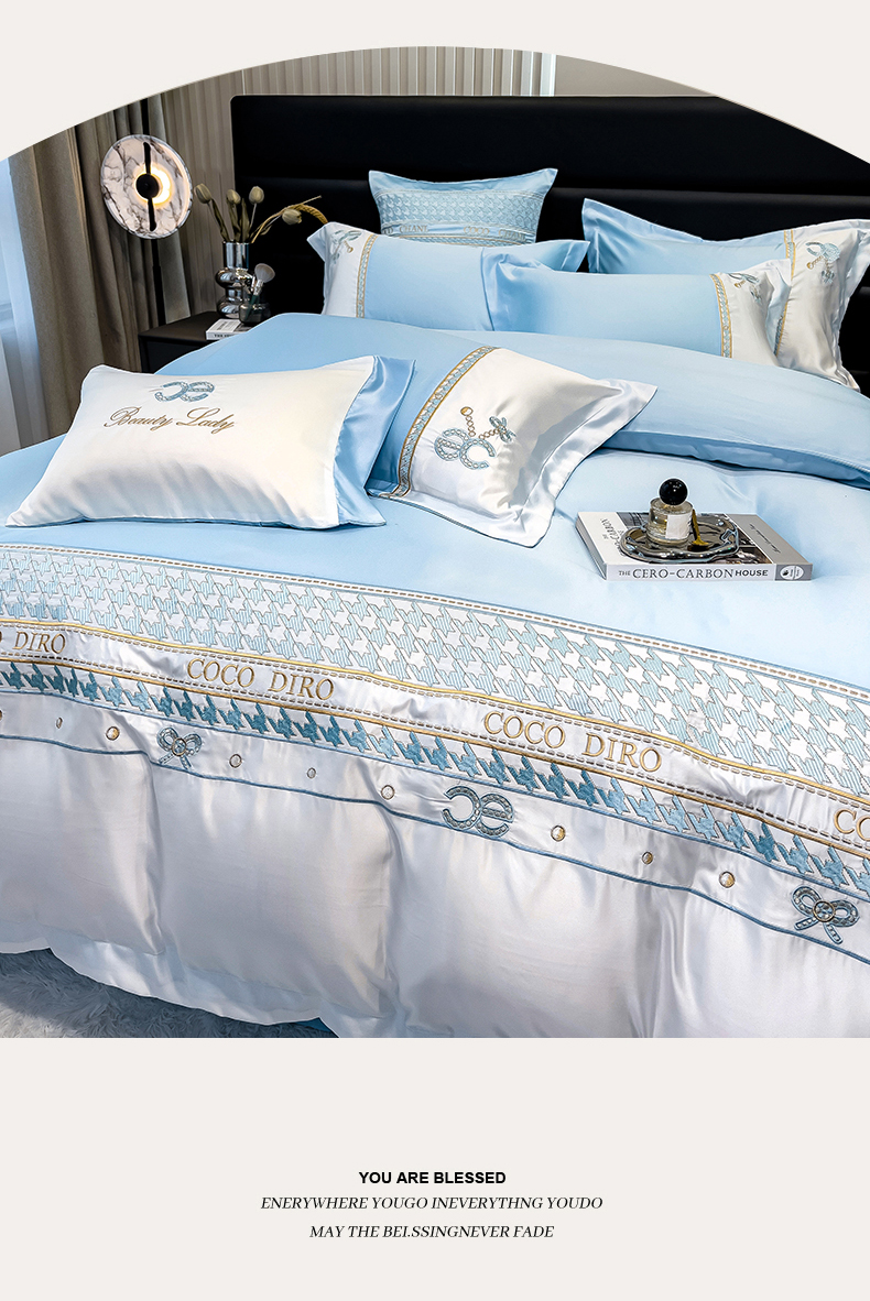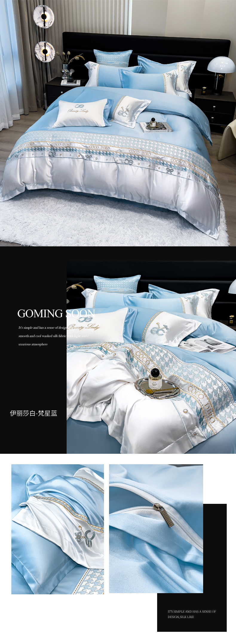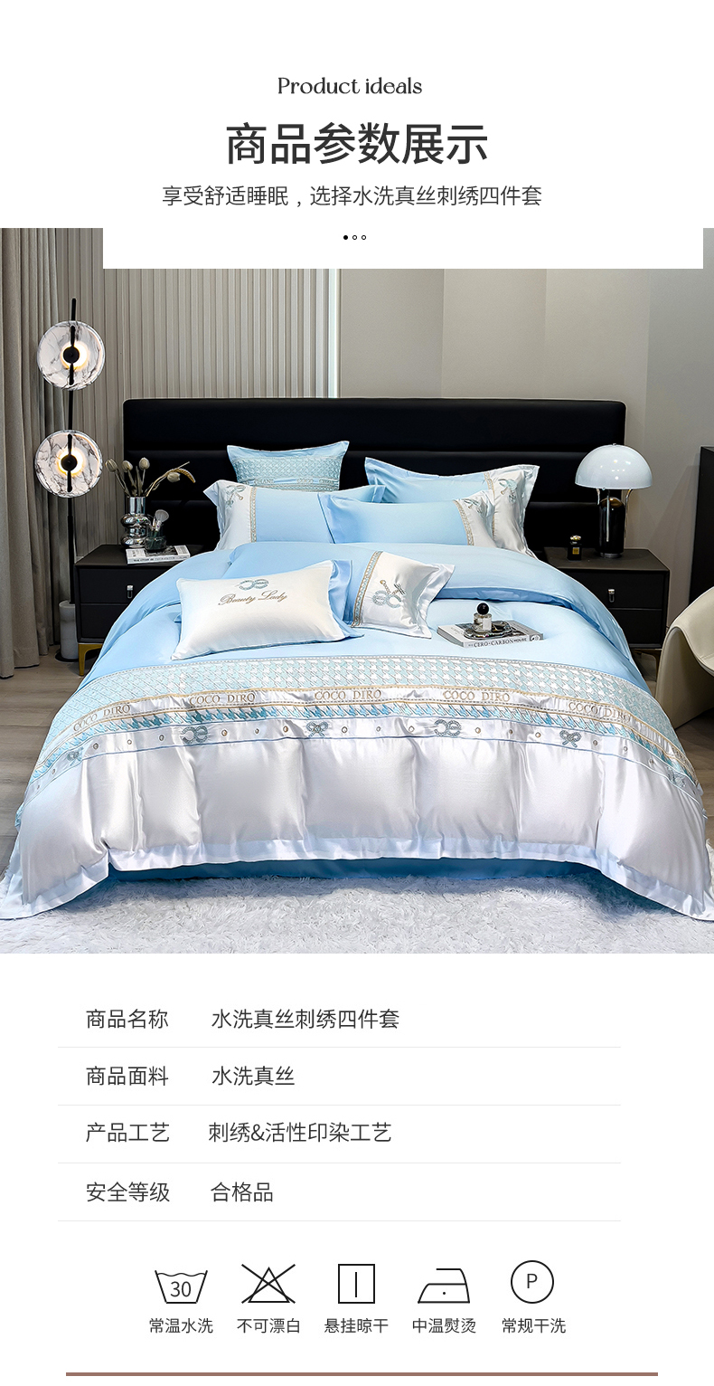 欧冠家纺 2024新款绣花水洗真丝伊丽莎白四件套 伊丽莎白-梵星蓝