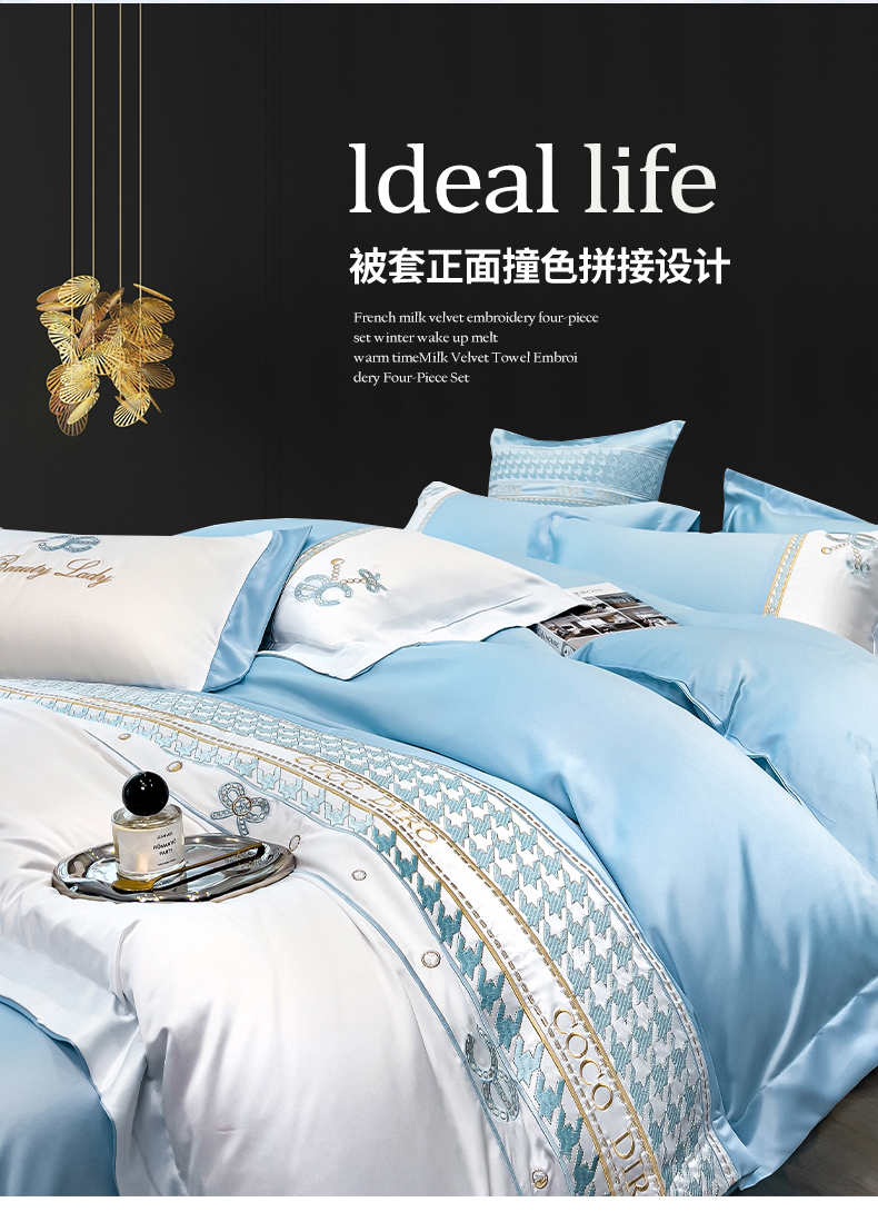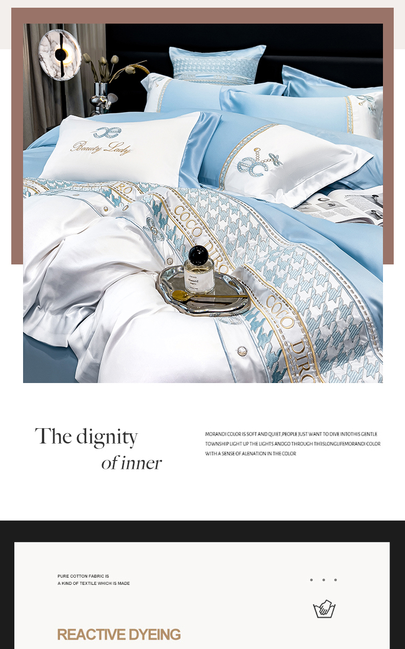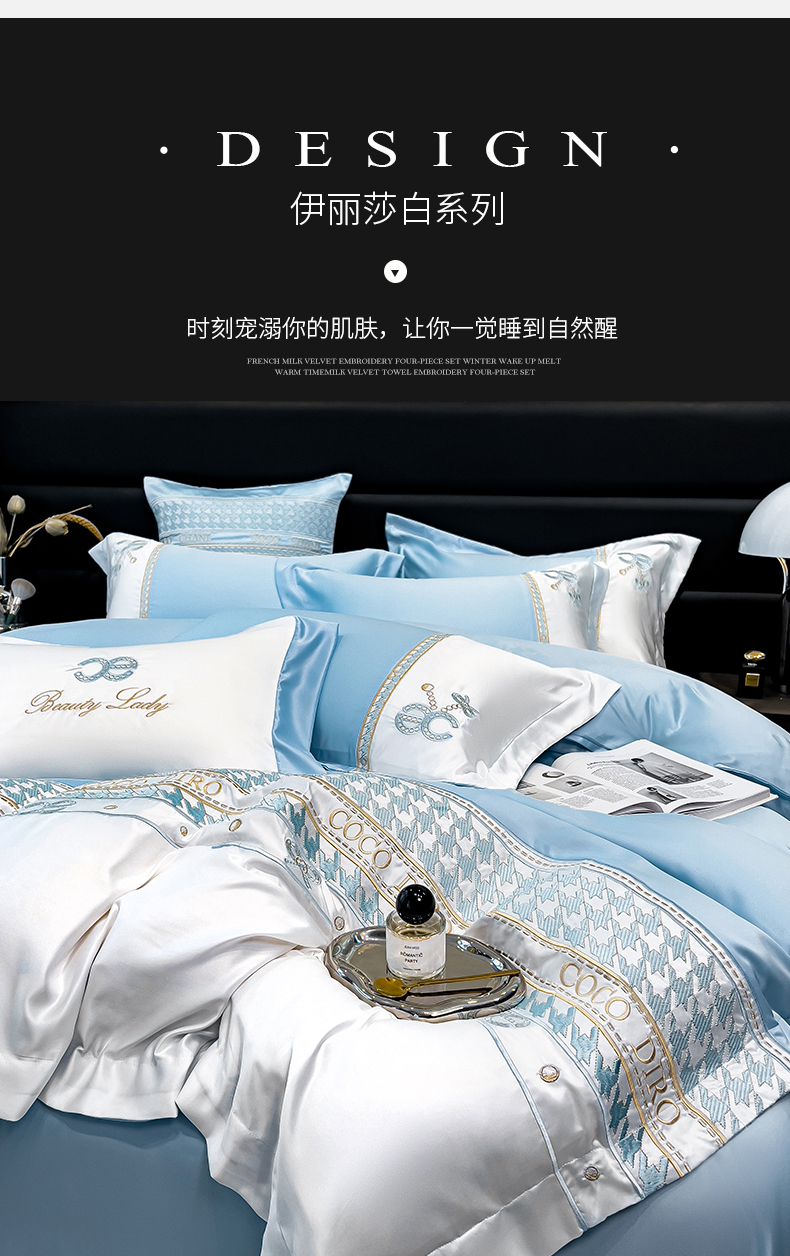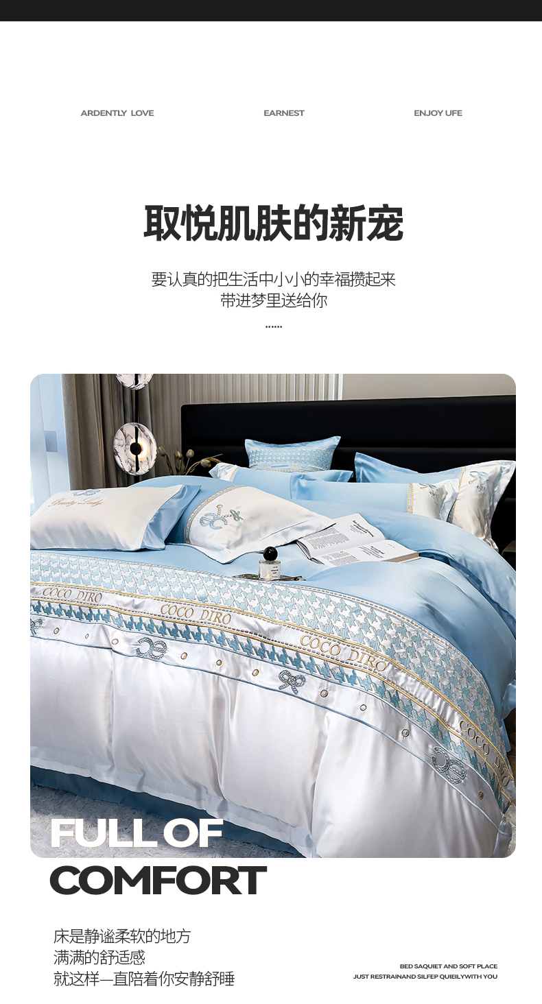 欧冠家纺 2024新款绣花水洗真丝伊丽莎白四件套 伊丽莎白-梵星蓝