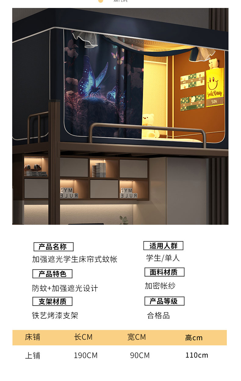 80上下铺通用(带靠墙帘):80宽*190长*90-120高(高度伸缩) | ¥105.00 |