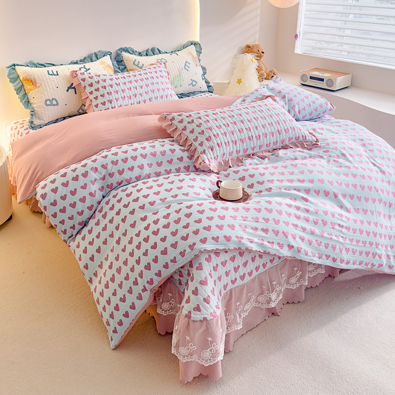 (总)雅眠居 2025爆款针织棉双层纱印花床盖四件套,爱心粉,爱心绿,半夏,蝶恋,粉格蝴蝶结,灰韵,蓝格蝴蝶结,玫瑰庄园,蔷薇,甜心,香草绿,幽幽花香,郁金香,蝴蝶印记,奶油波点,五叶花