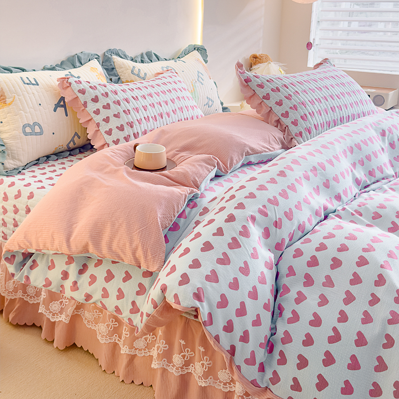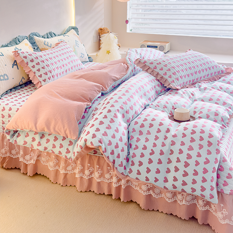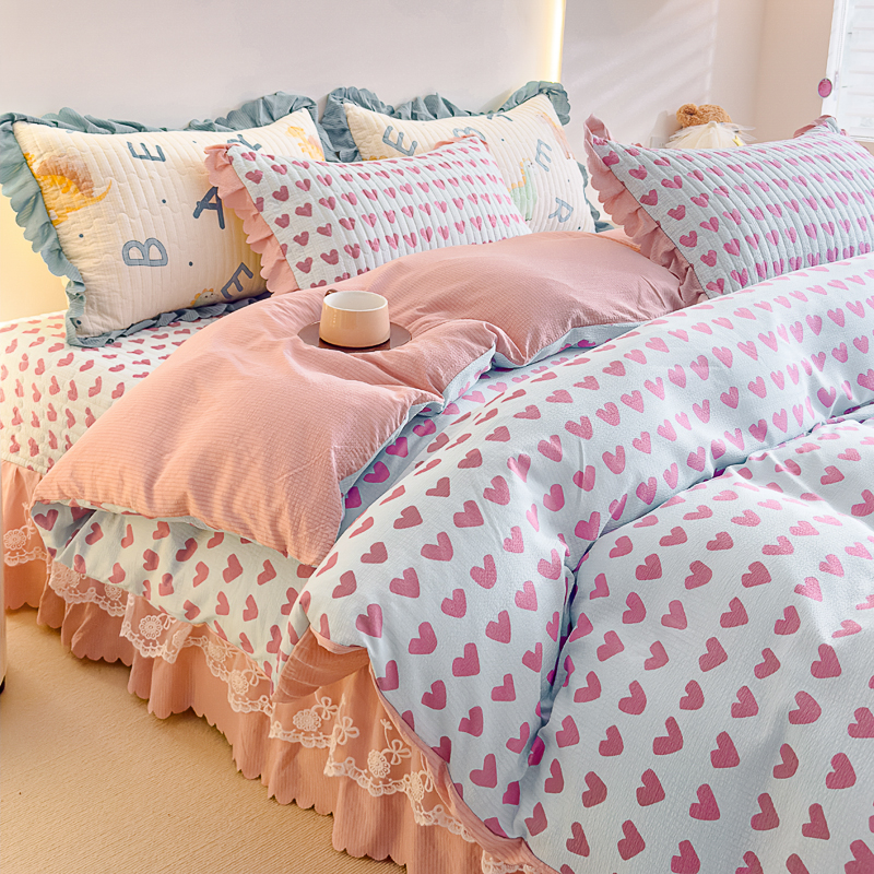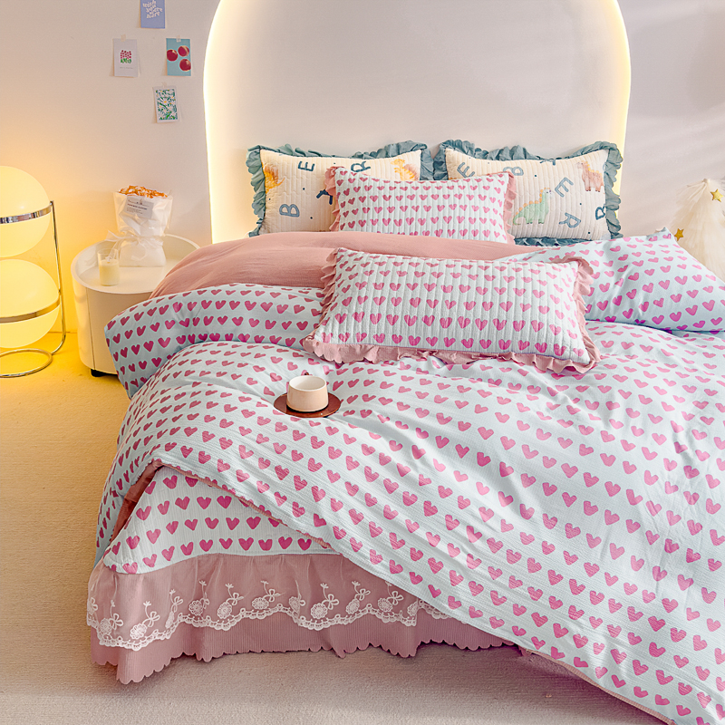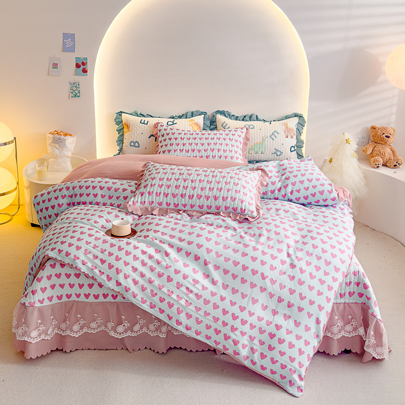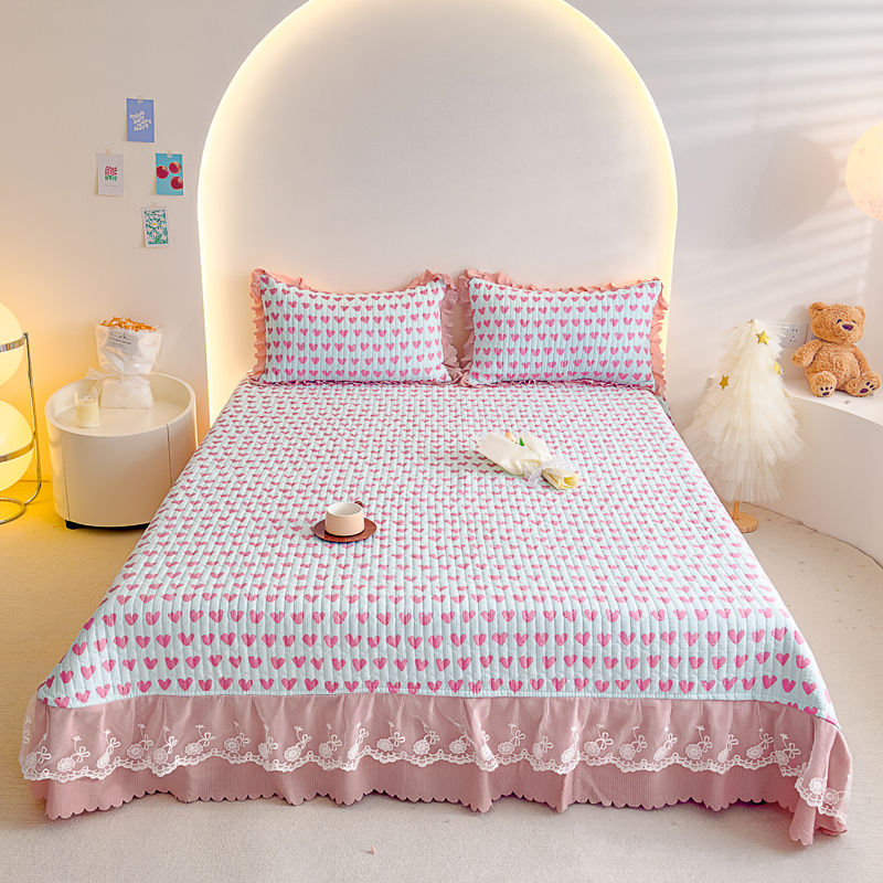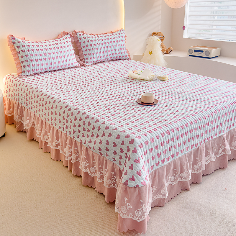 2024直播爆款泡泡棉床盖款四件套双层蕾丝花边夹棉床裙款三件套 甜心粉
