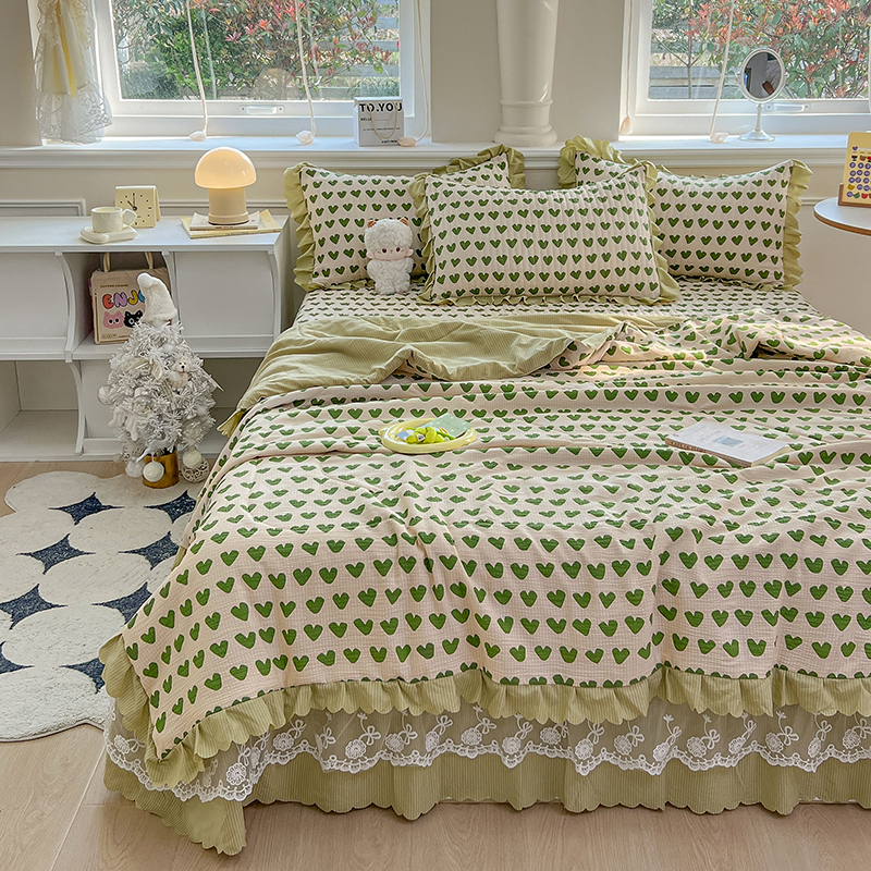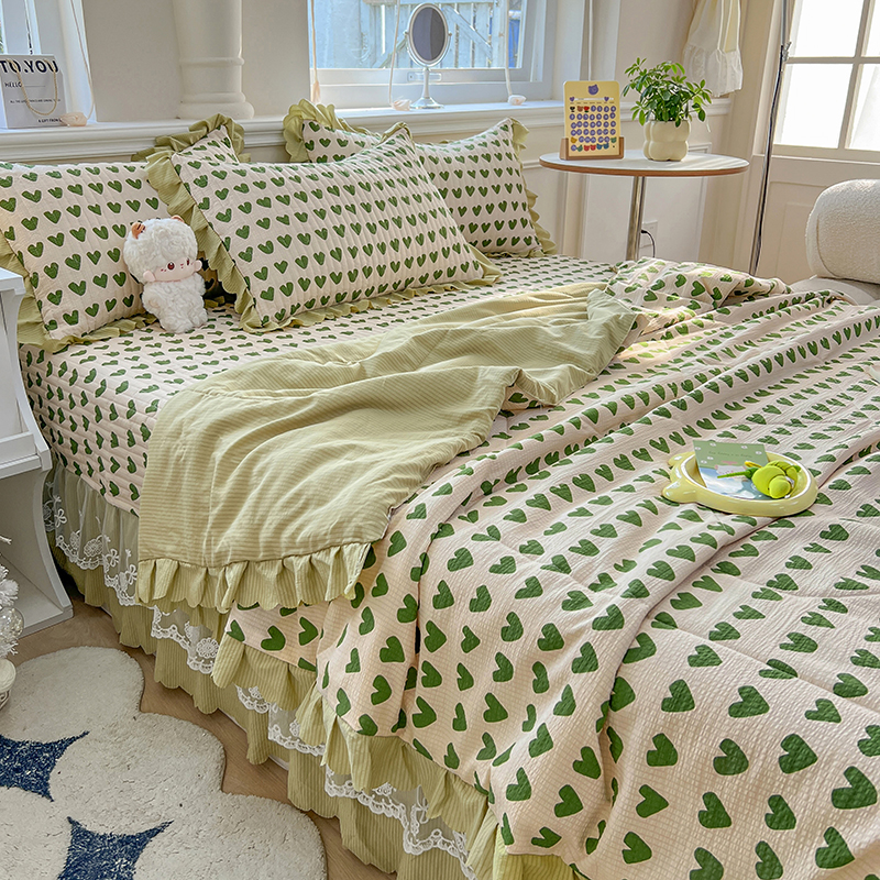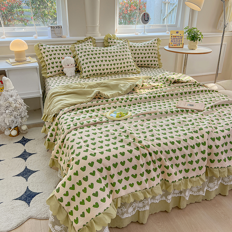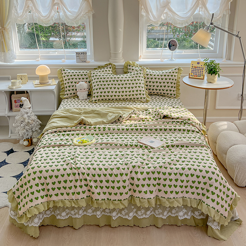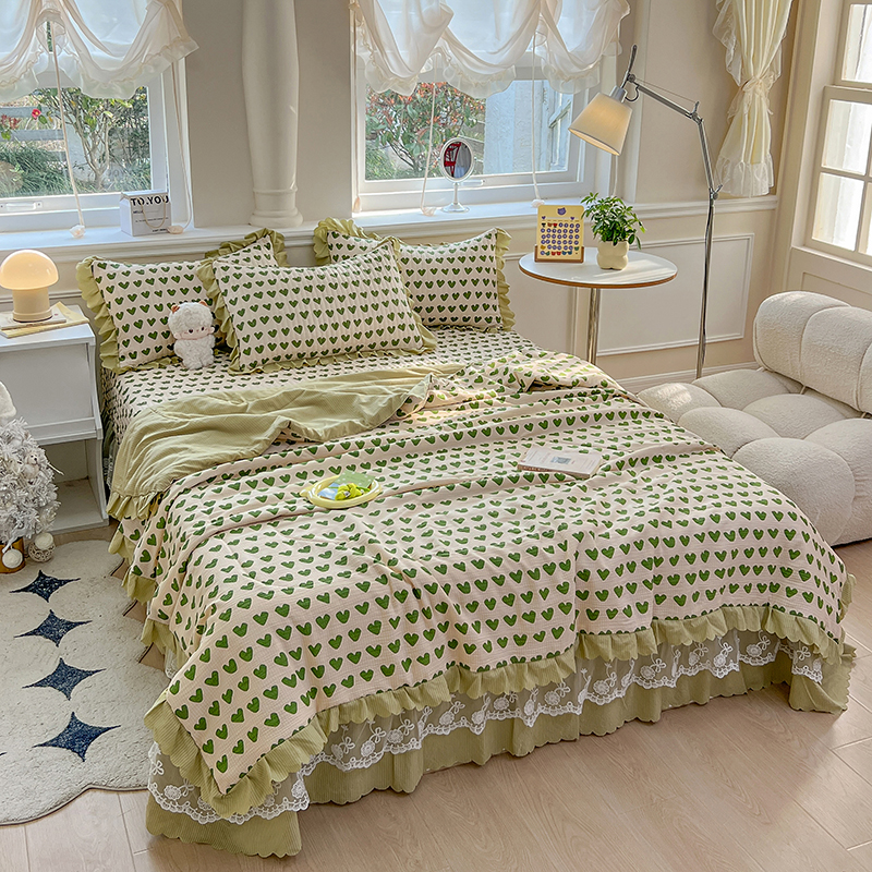 当前位置: 91家纺网 > 商品网购 > 床品套件 > 四件套 > 夏被四件套 > 雅眠居 2024直播爆款泡泡棉床盖款夏被四件套双层蕾丝花边夹棉床裙款三件套 甜心绿