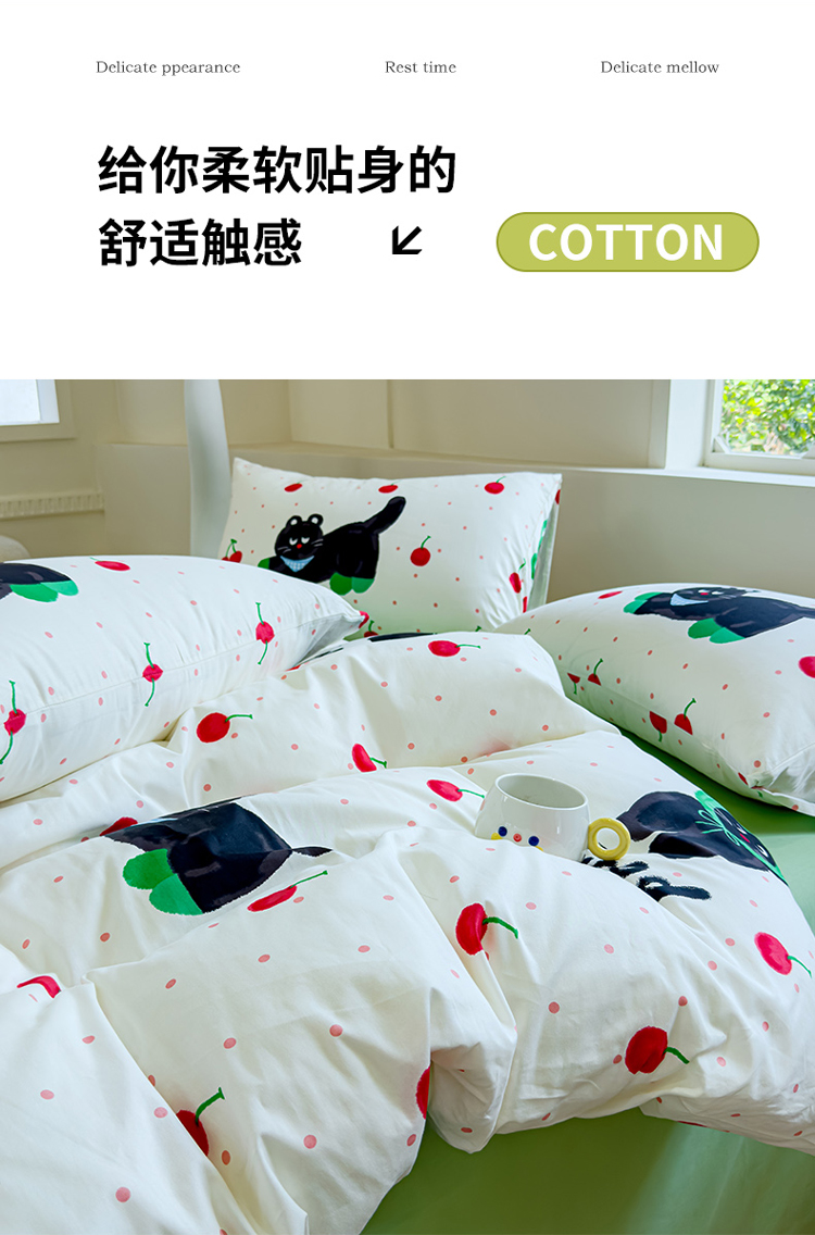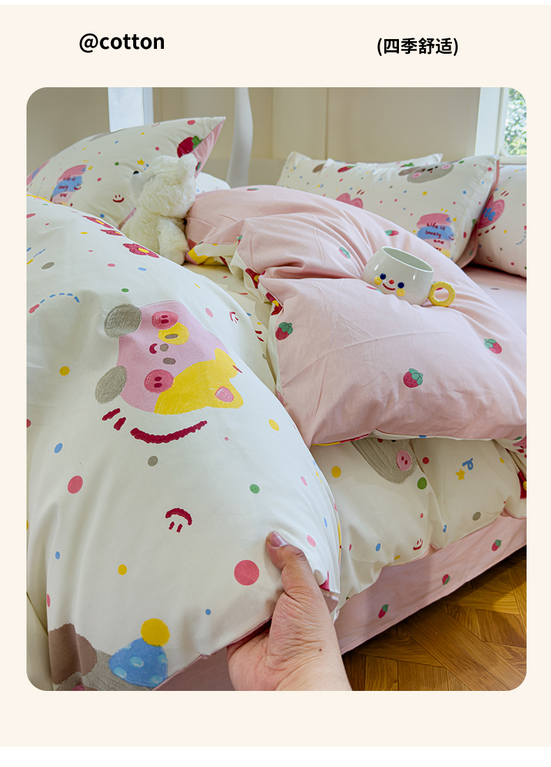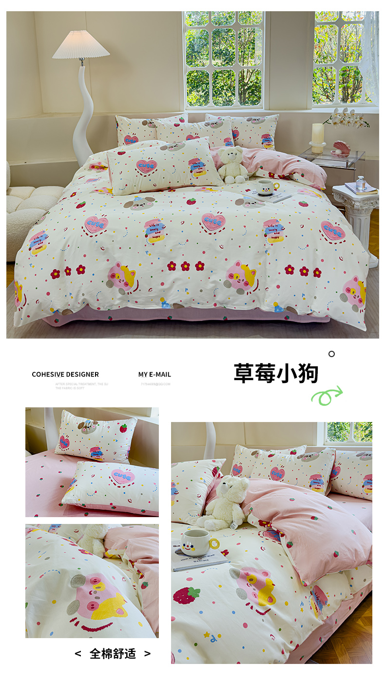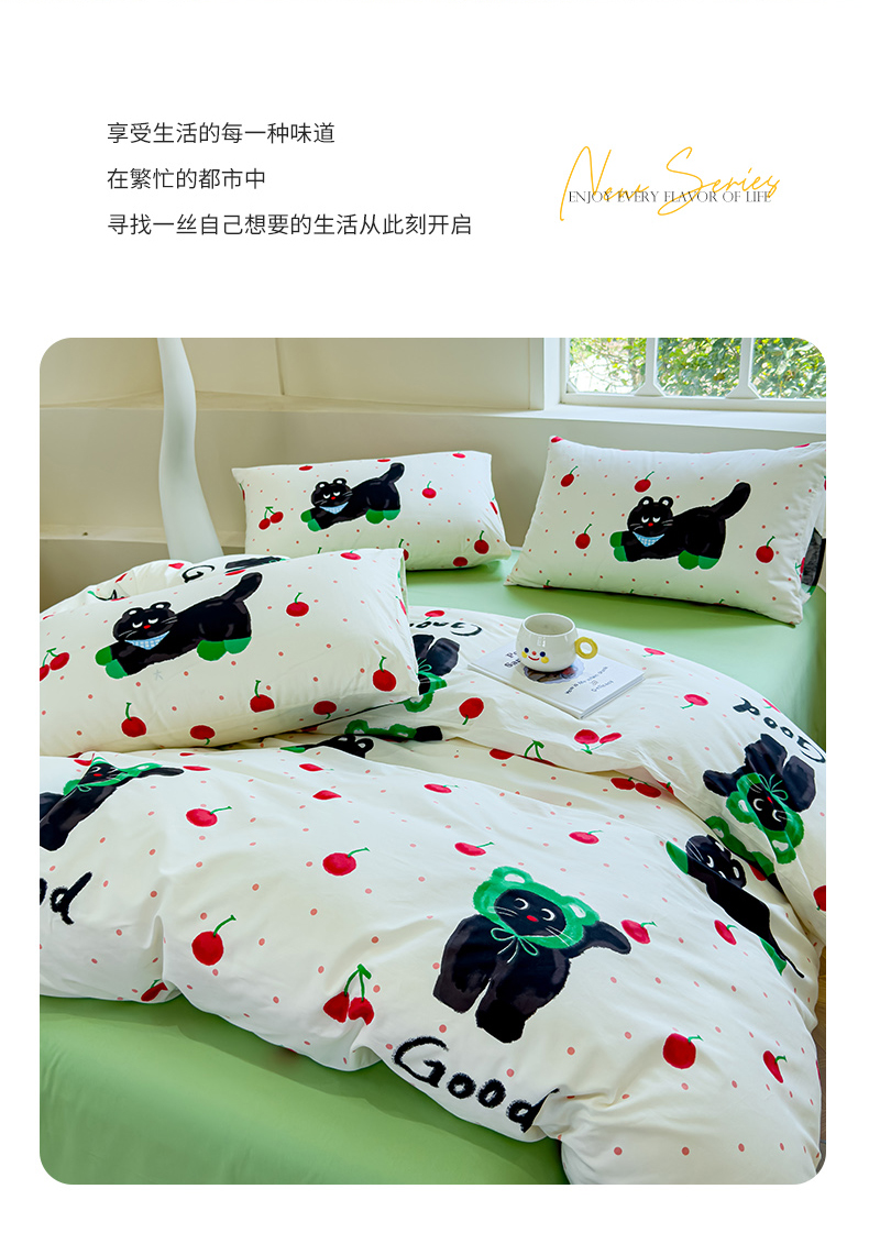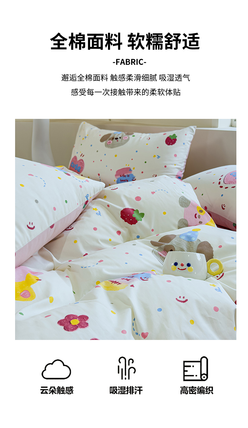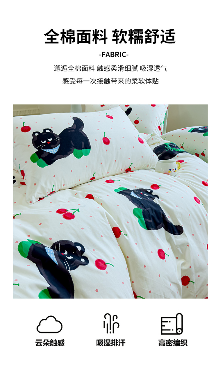 (总)感遇家纺 2025新款小清新甜系全棉四件套,百丽兔,波点小女孩,点点小狗,复古樱桃,格子草莓,格子樱桃,花间牧歌,灰条猫咪,奶绿,宁夏,森林小熊猫,甜心波点