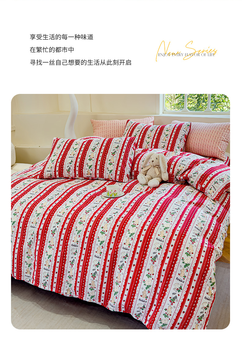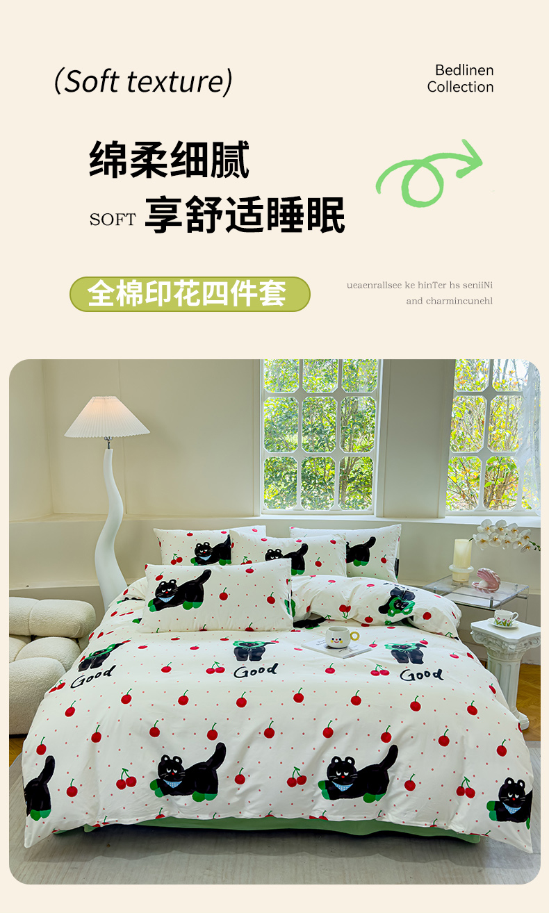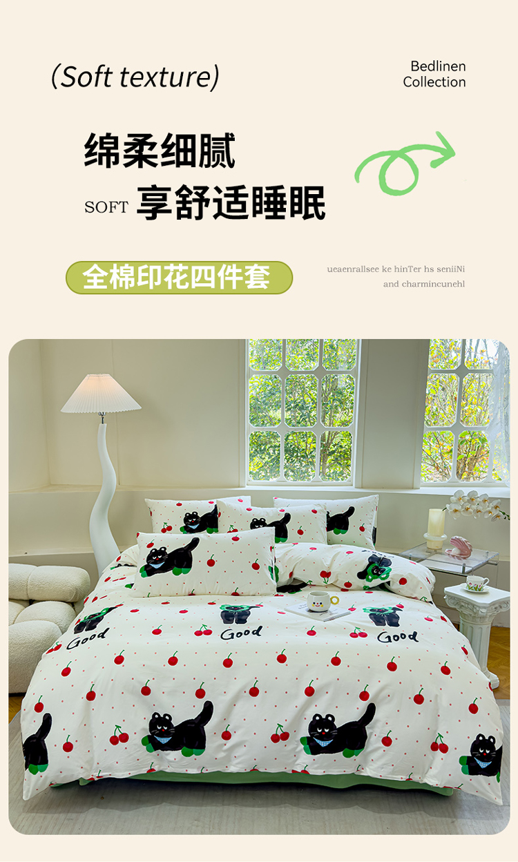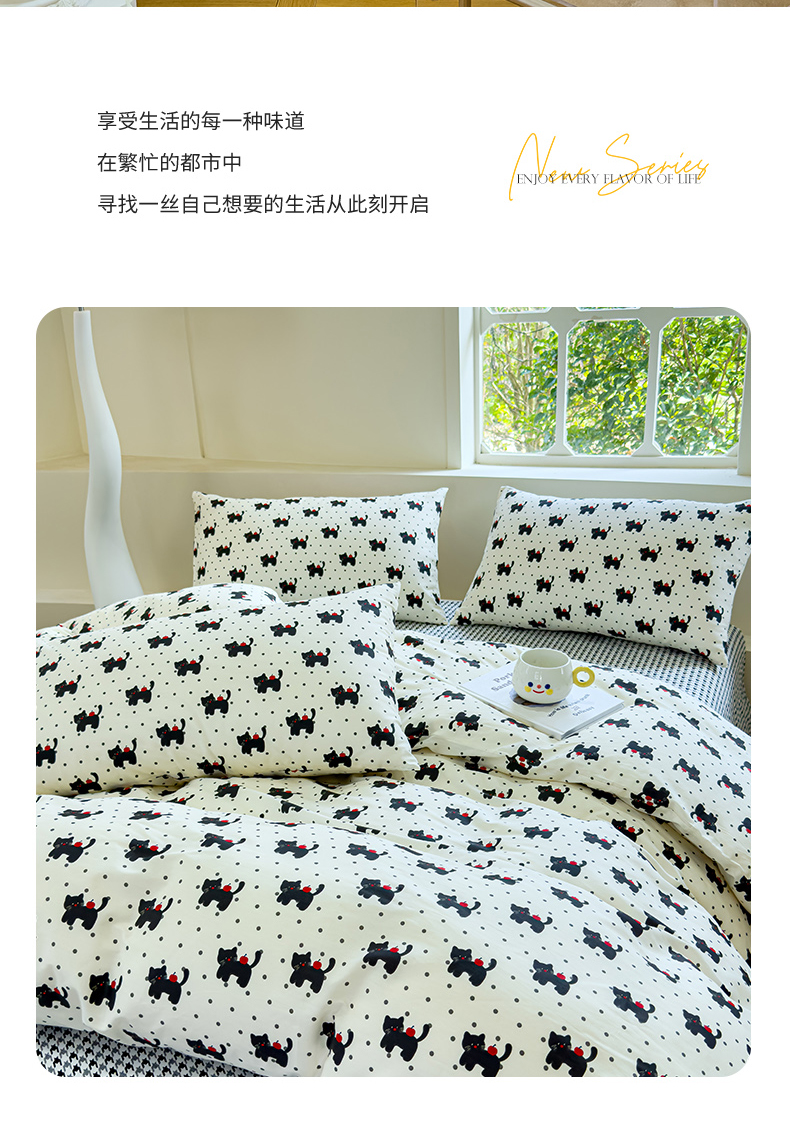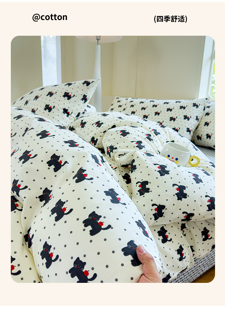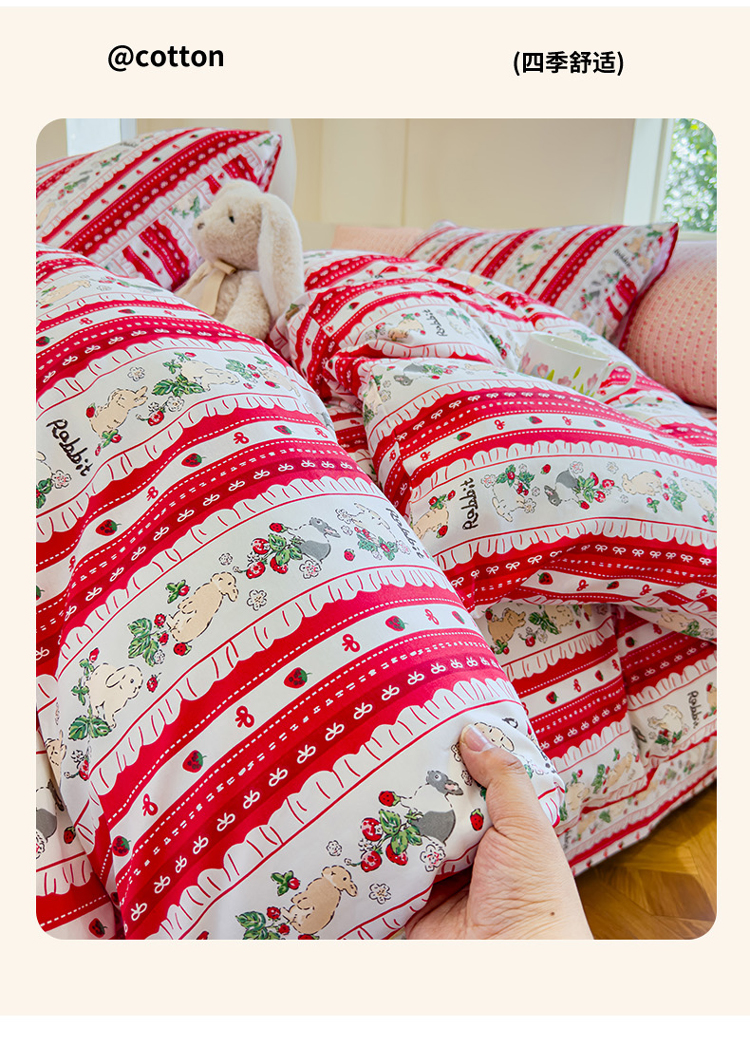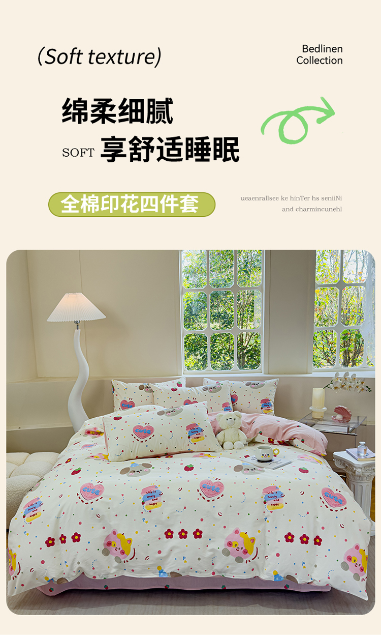 (总)感遇家纺 2025新款小清新甜系全棉四件套,百丽兔,波点小女孩,点点小狗,复古樱桃,格子草莓,格子樱桃,花间牧歌,灰条猫咪,奶绿,宁夏,森林小熊猫,甜心波点