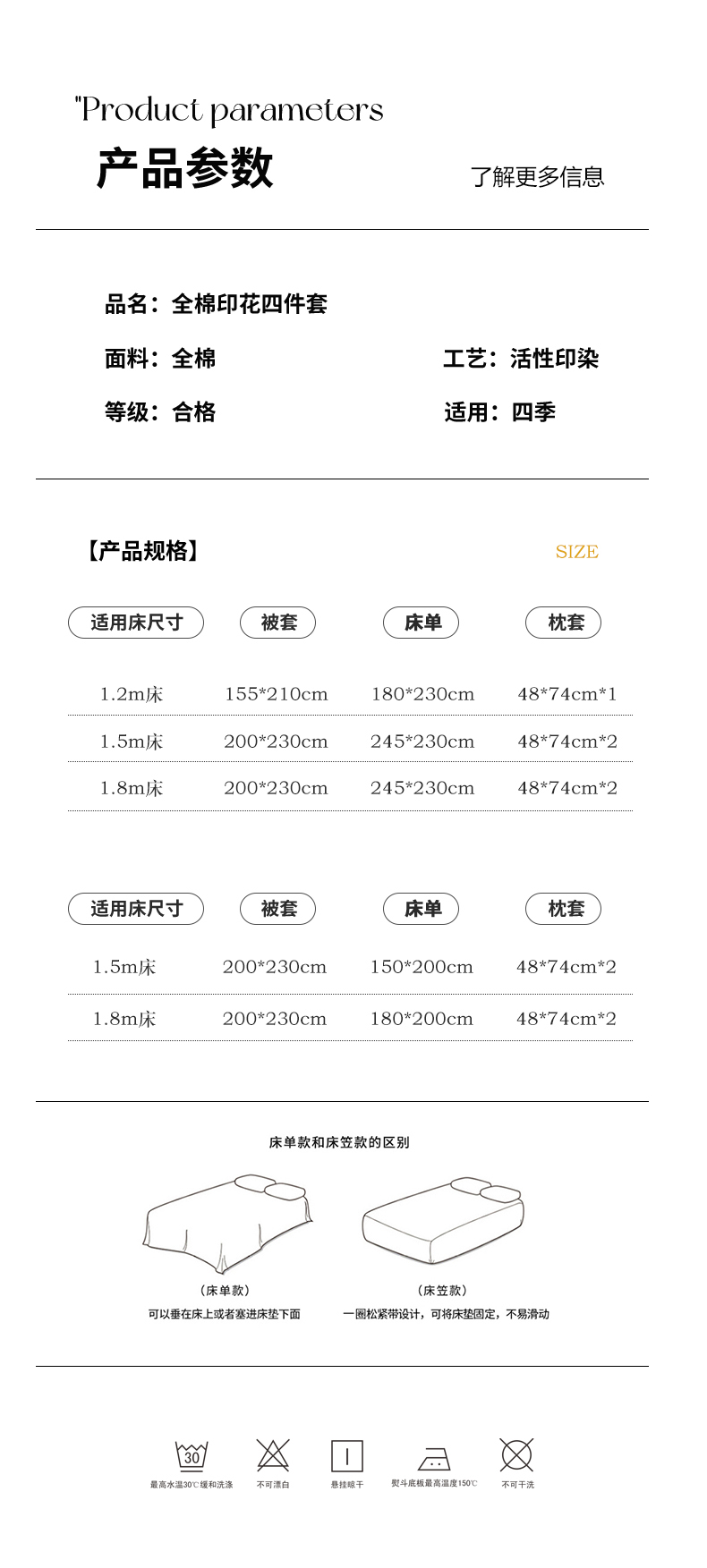 1.5m床笠款四件套 被套尺寸 200*230cm 床笠150*200cm 枕套48*74cm两只