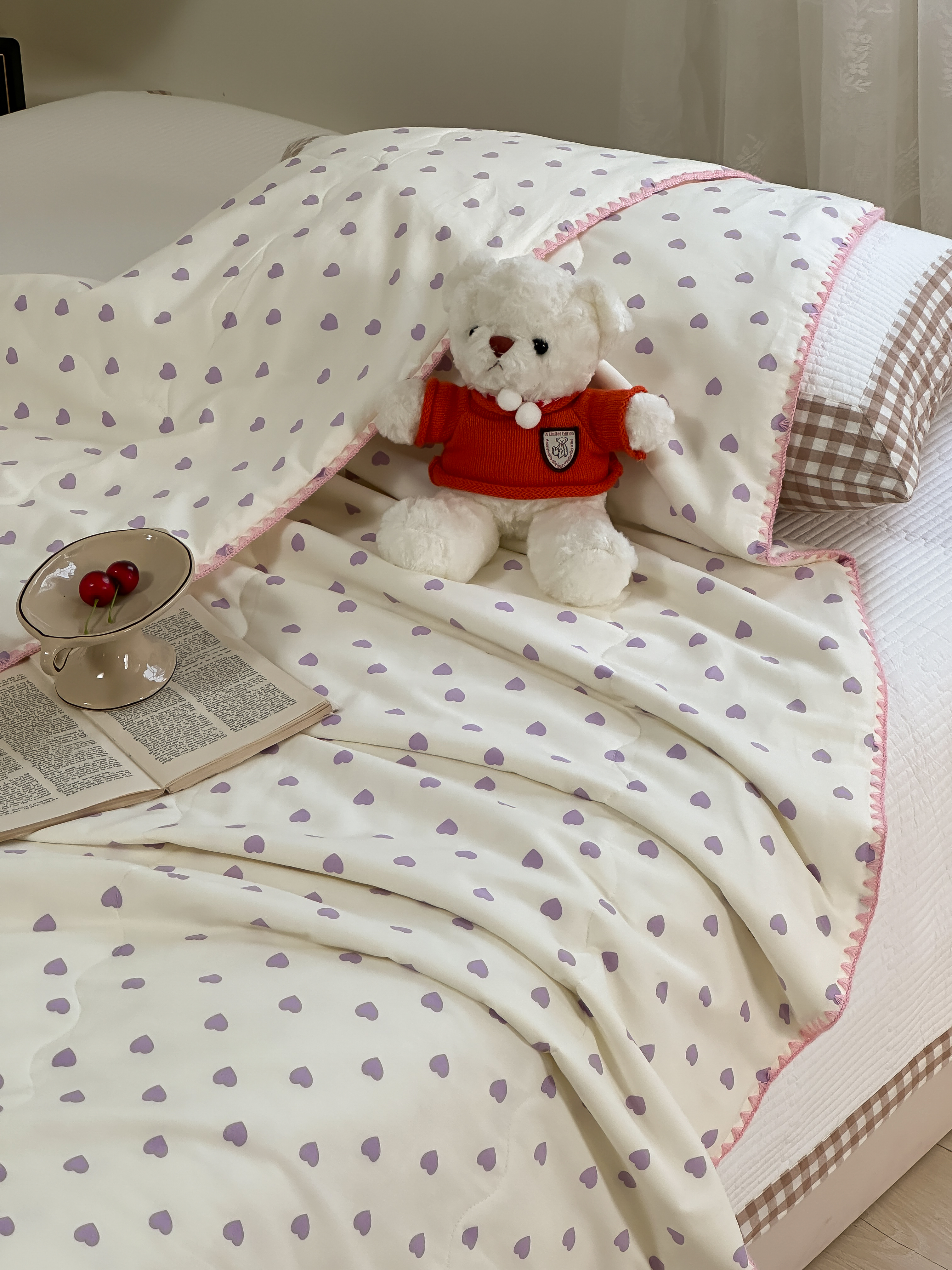 商品名称:洋铭区 2024新款贝壳边全棉印花夏被 紫色小心心