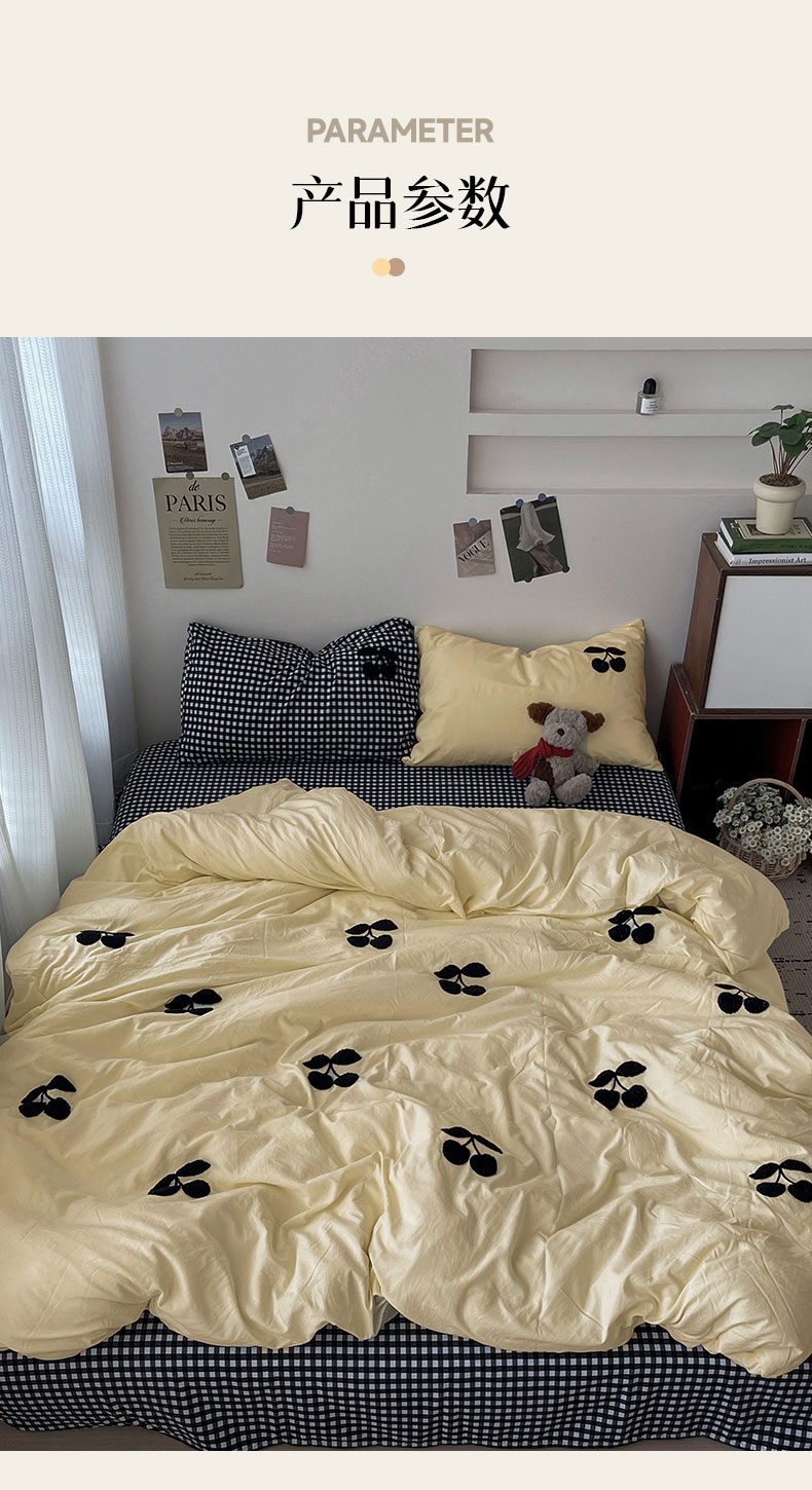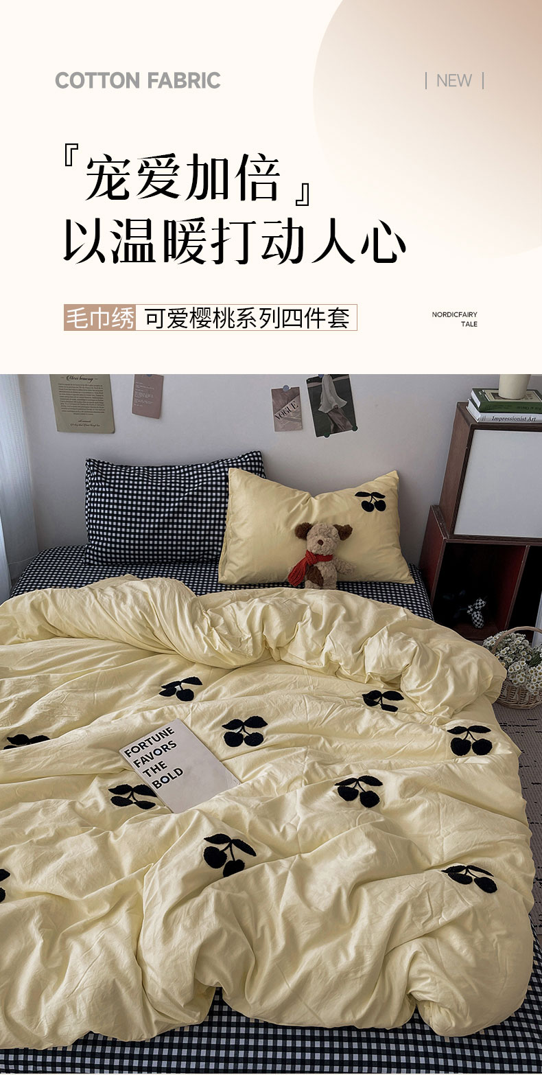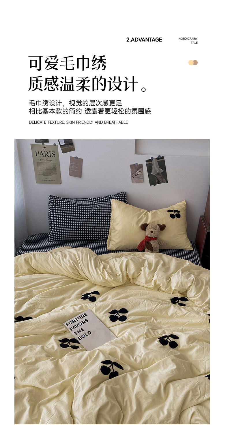 当前位置: 91家纺网 > 商品网购 > 床品套件 > 四件套 > 水洗棉四件套 > 尤米 2024新款可爱樱桃系列水洗棉毛巾绣四件套 樱桃-黄格