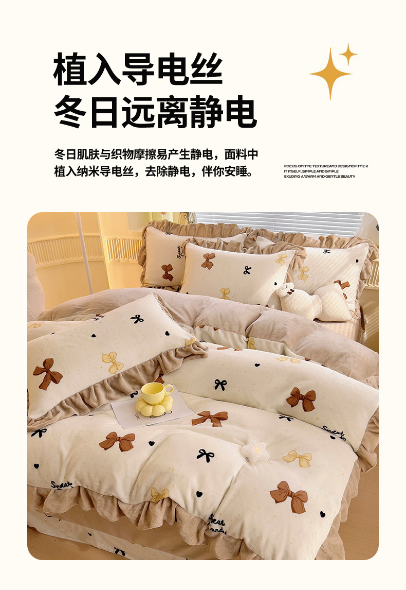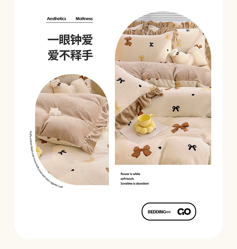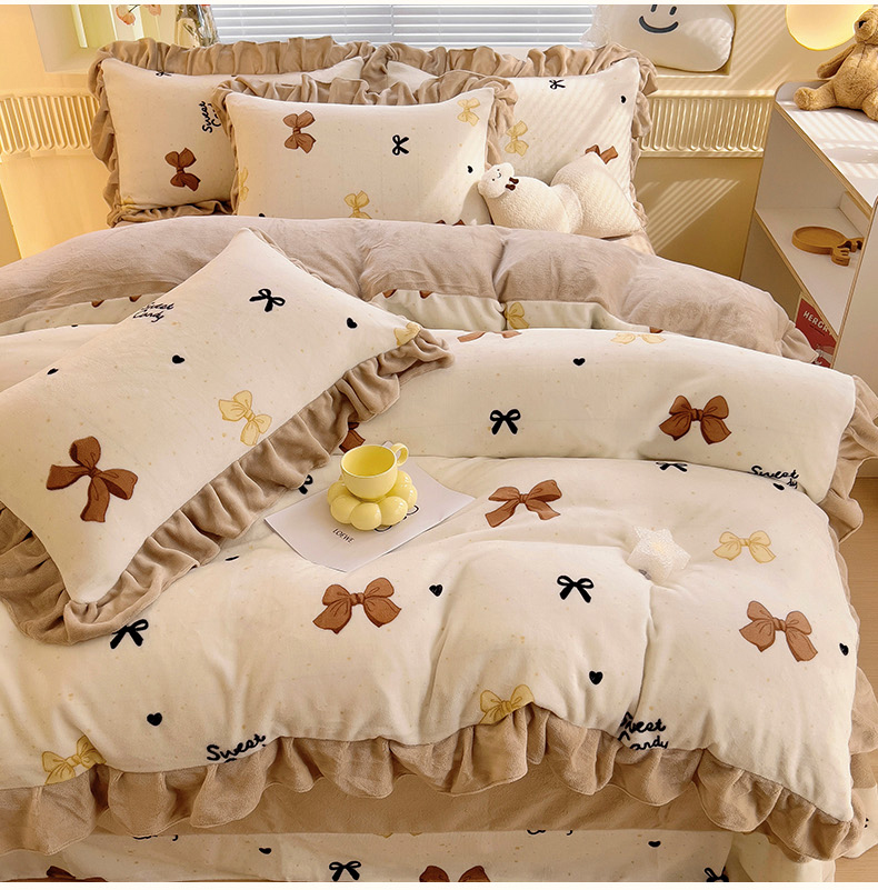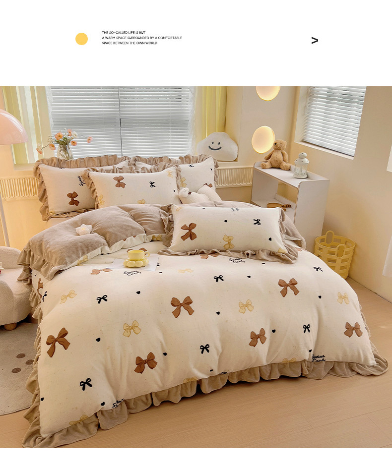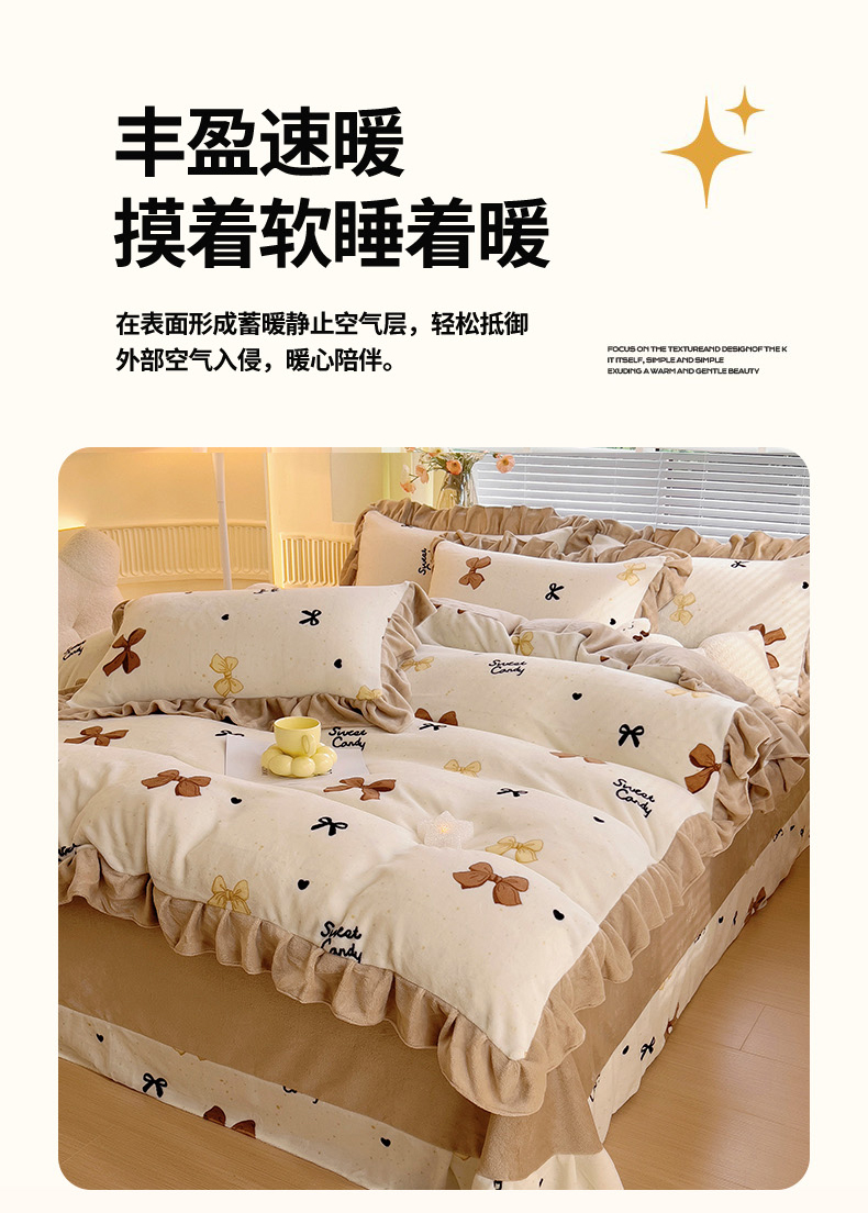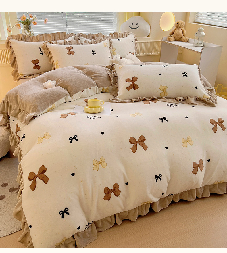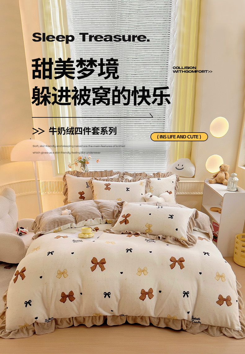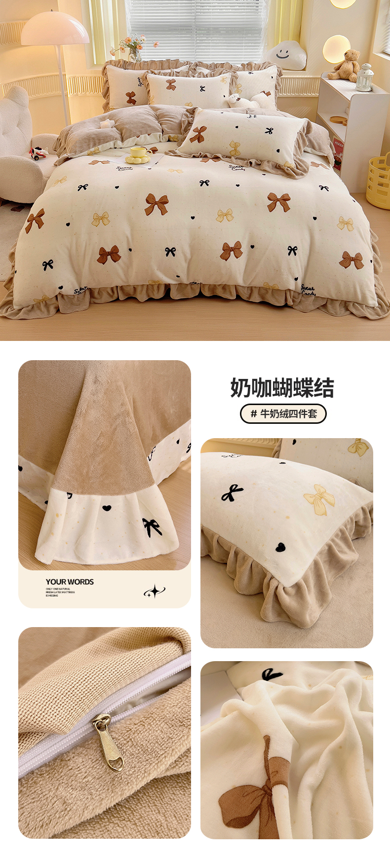 找底底家纺 2024新款牛奶绒印花四件套 奶咖蝴蝶结