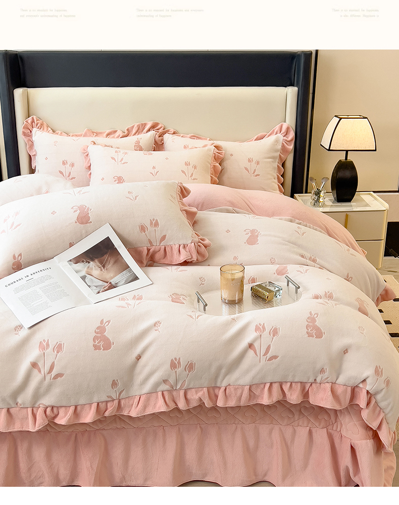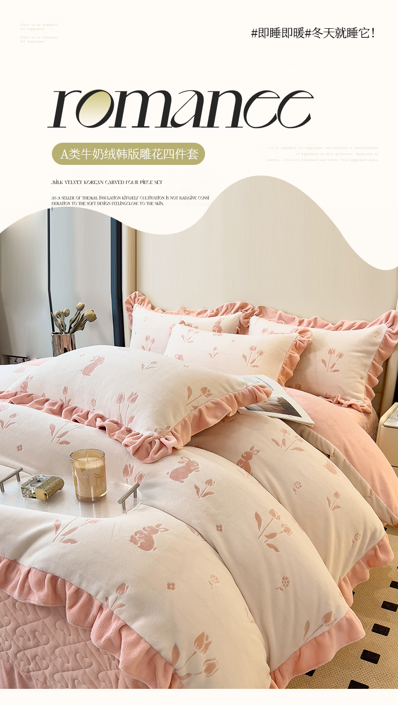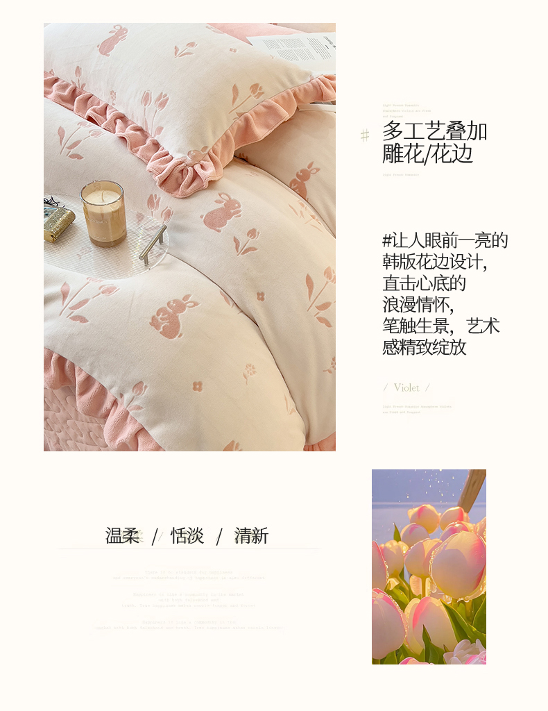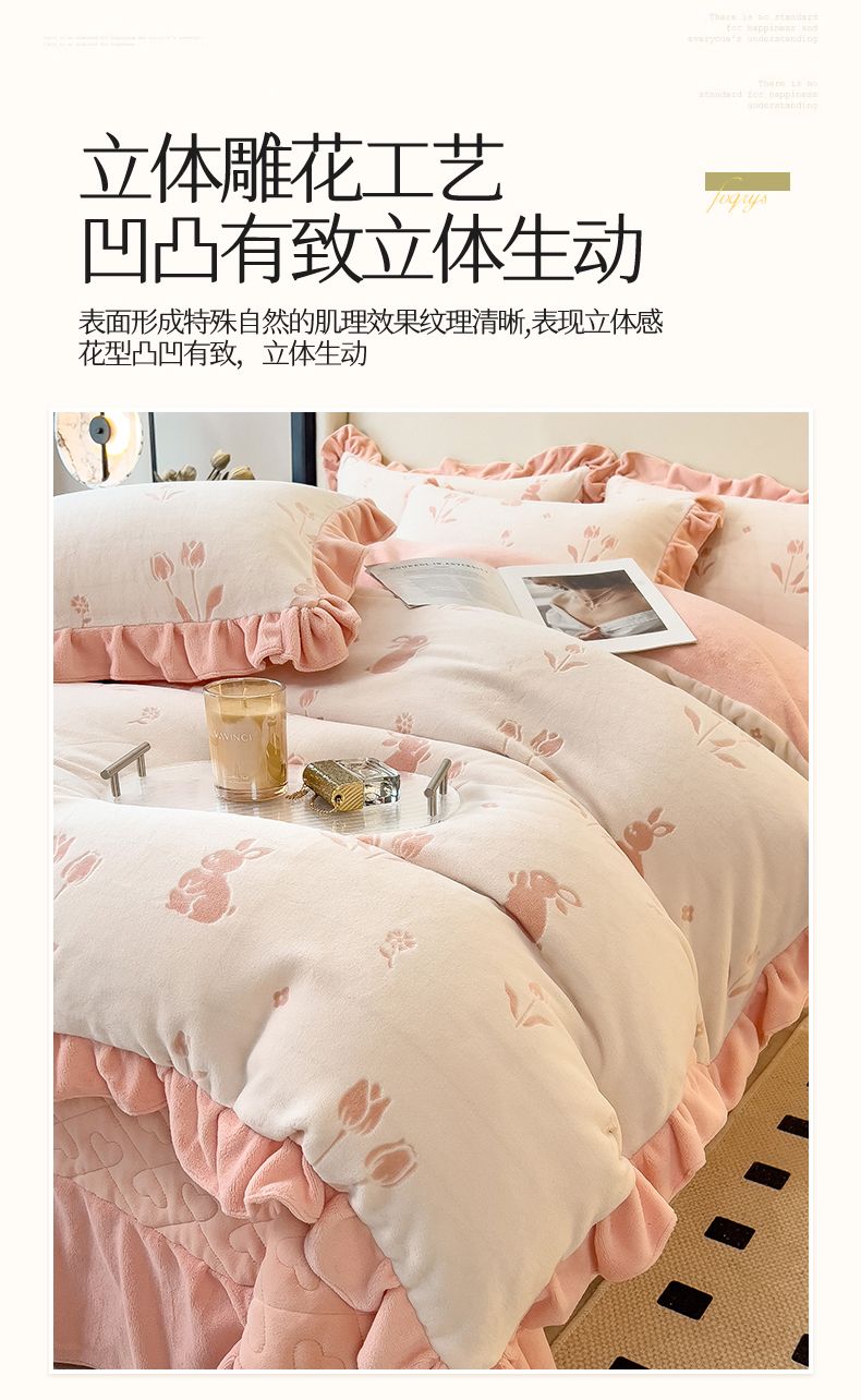 2024新品A类牛奶绒韩版雕花四件套 恋爱兔-白