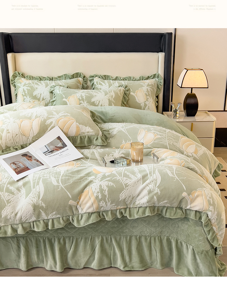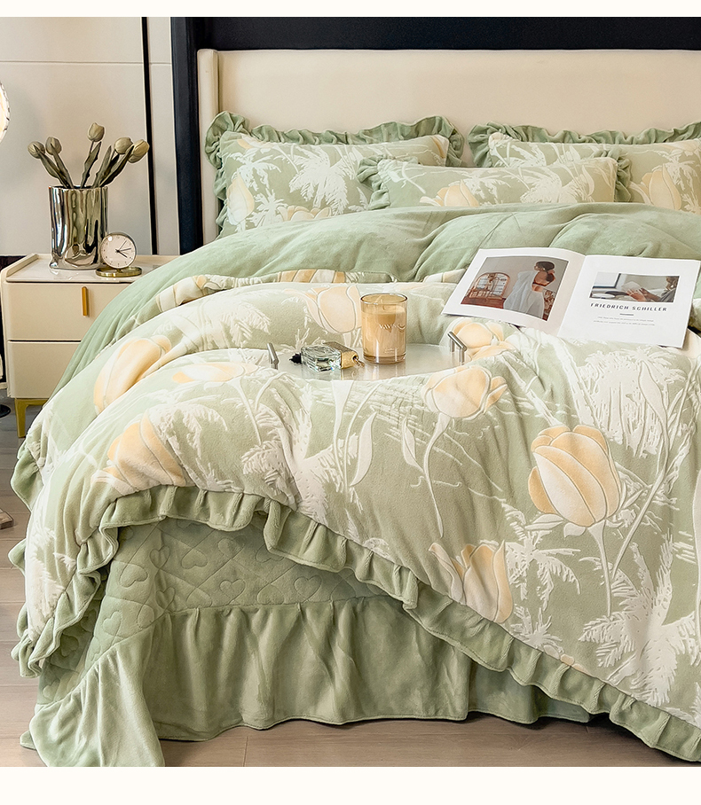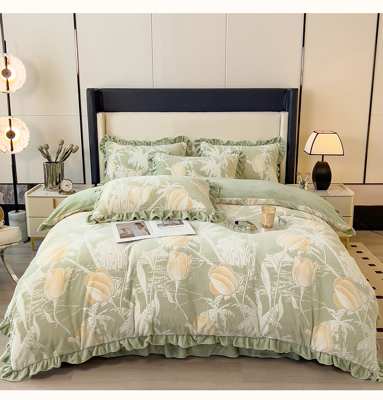2024新品A类牛奶绒韩版雕花四件套 郁金香-绿