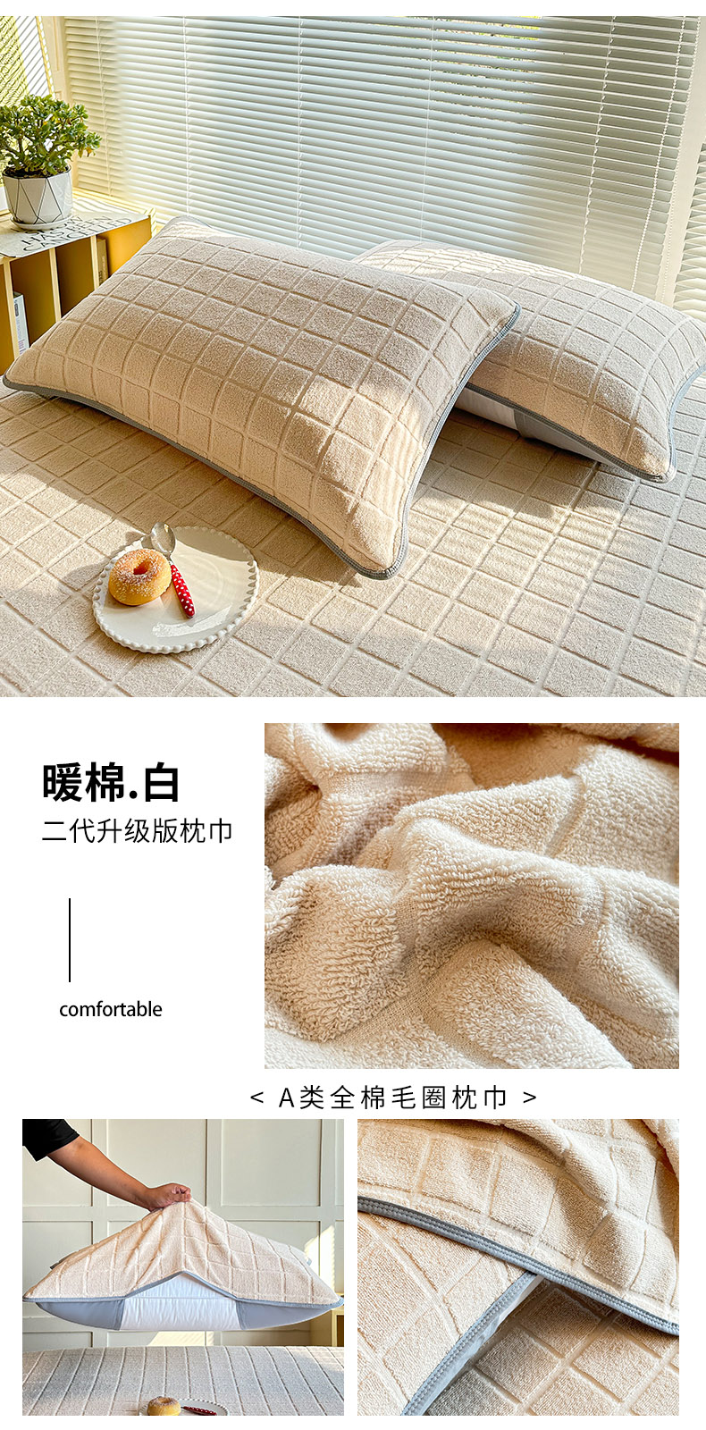爱港家纺 2024新款全棉A类毛巾被升级款单人枕巾枕芯保护套枕套 暖棉-白