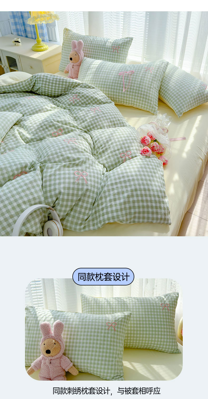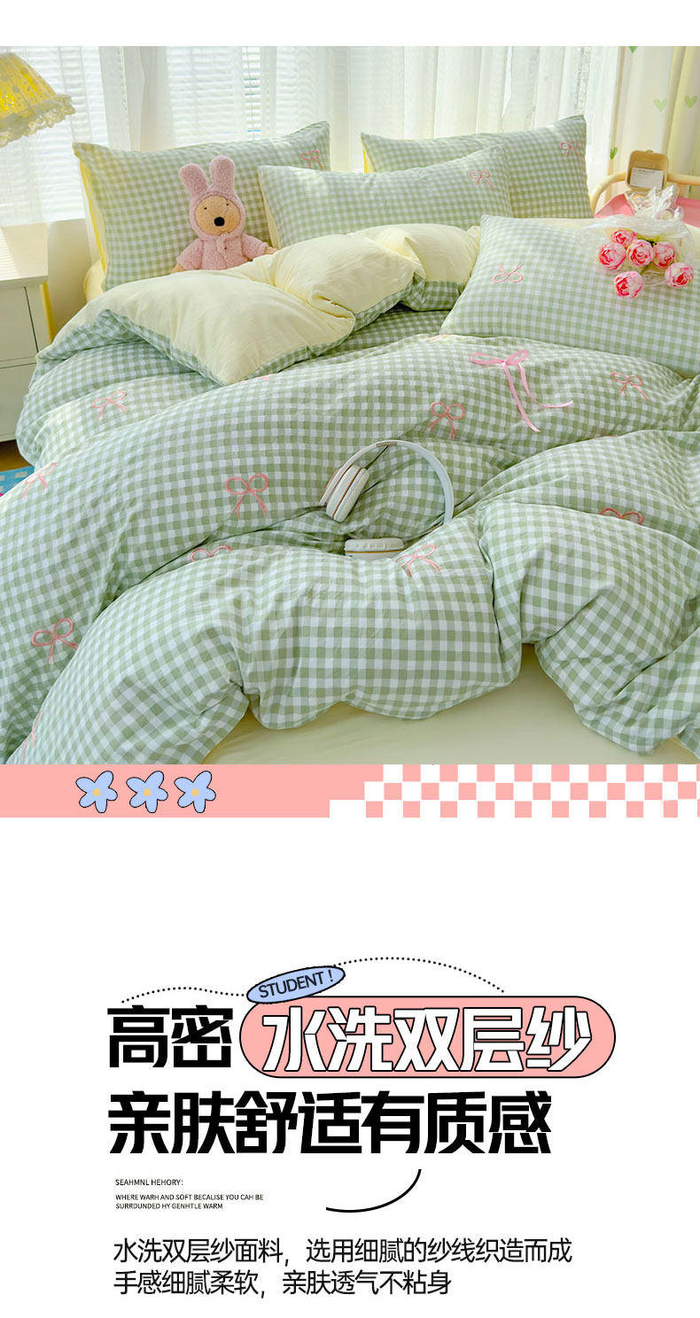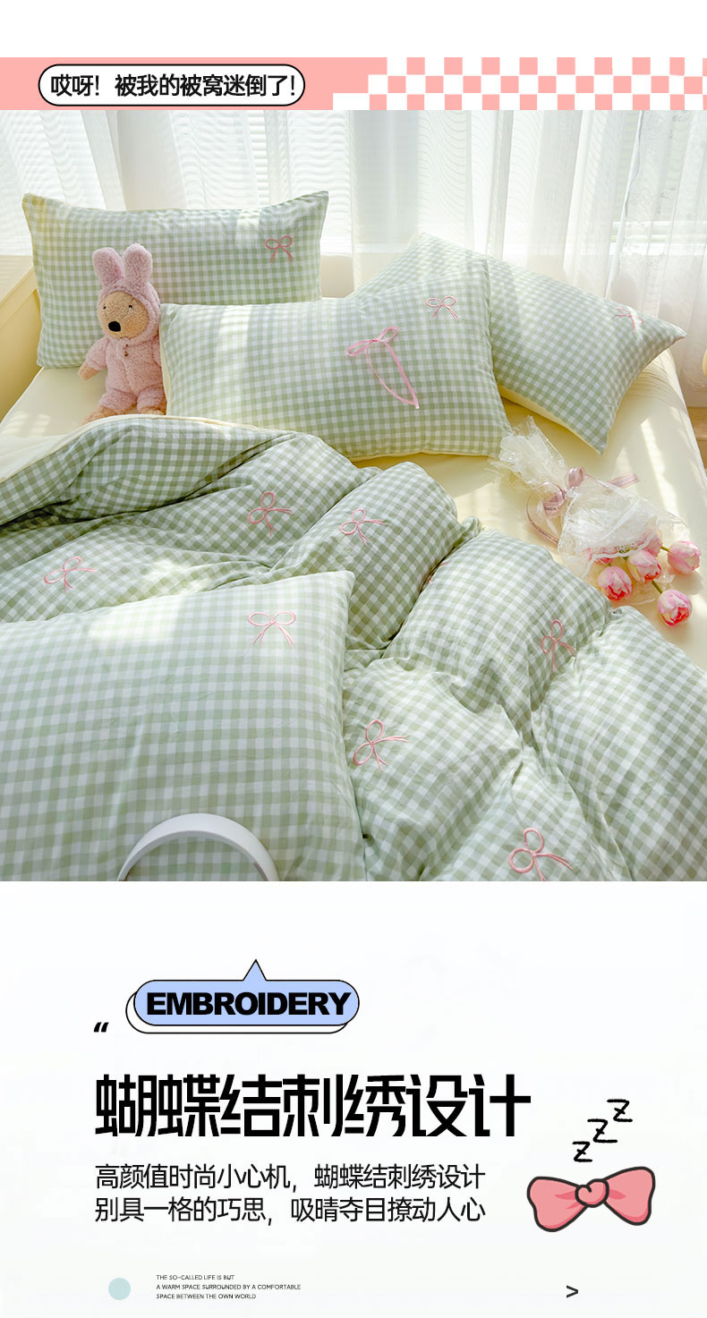 当前位置: 91家纺网 > 商品网购 > 床品套件 > 四件套 > 其它四件套 > 2025新款A类水洗双层纱蝴蝶结刺绣三件套四件套-成人床 蝴蝶结刺绣-薄荷绿格拼奶油黄