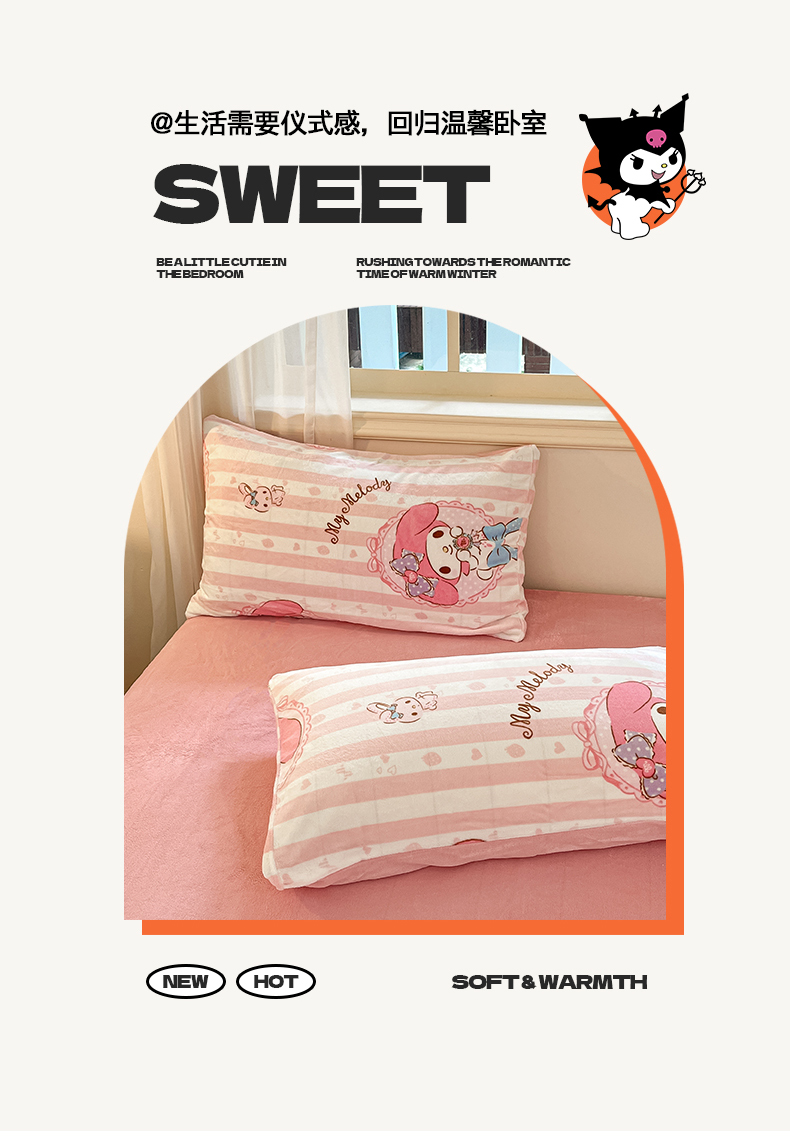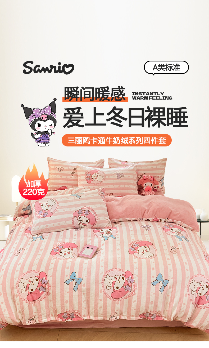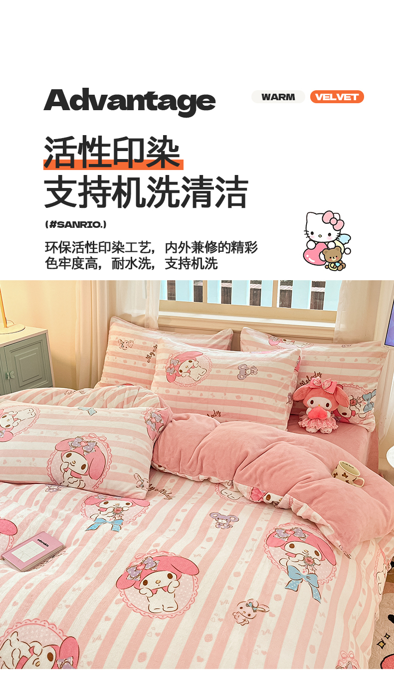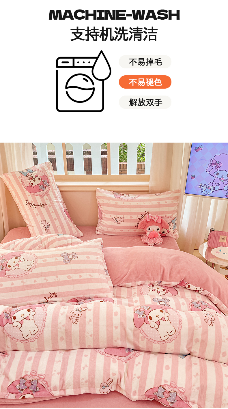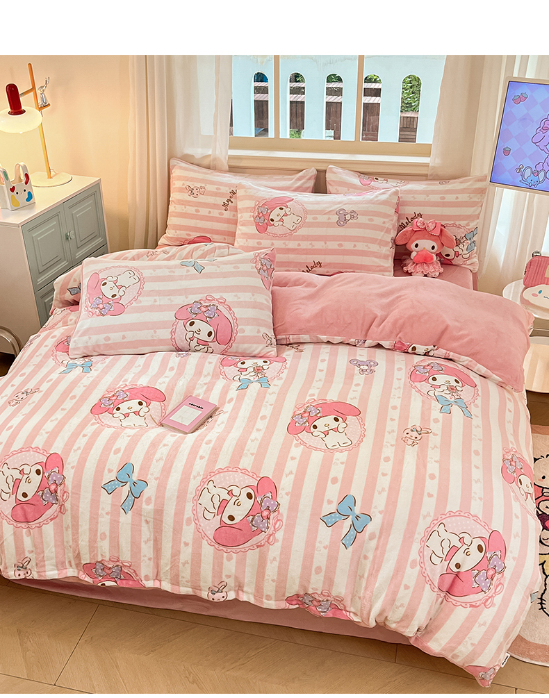 当前位置: 91家纺网 > 商品网购 > 床品套件 > 四件套 > 牛奶绒四件套 > 桃子家居 2024新款三丽鸥卡通加厚高克重200克牛奶绒系列四件套 绒三丽鸥-粉梦美乐蒂