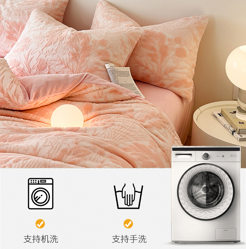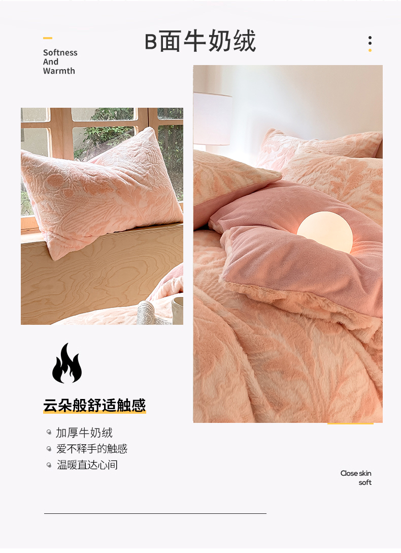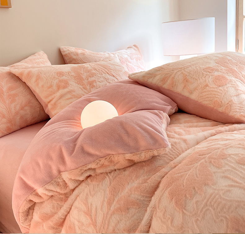 金爱家 2024新品全消光A类纯色獭兔毛绒立体牛奶绒兔毛雕花350克四件套 兔毛罗蒂曼玉色