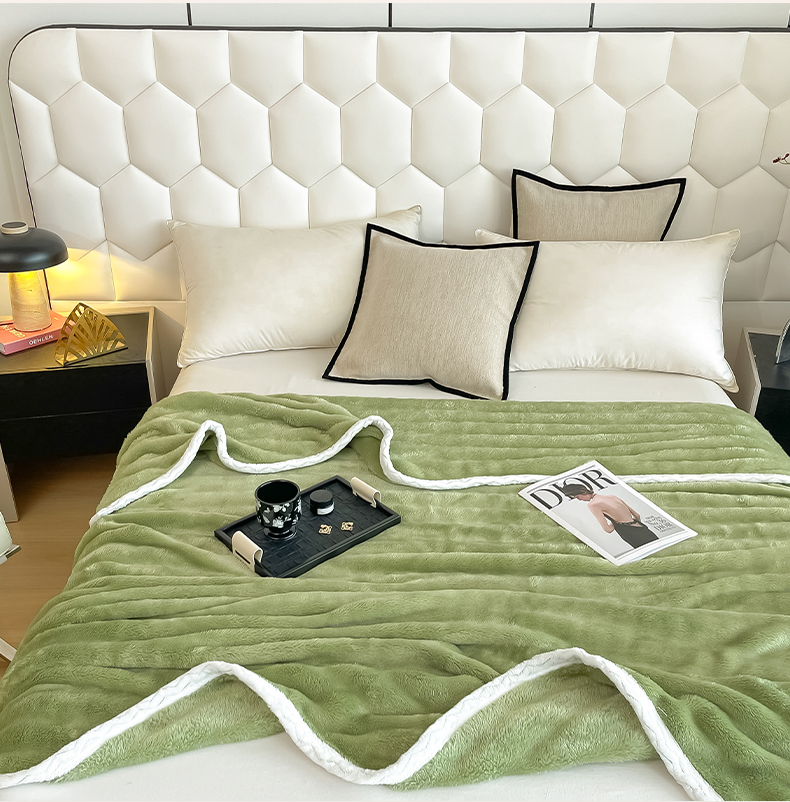 丹本家纺 2025新款仿兔毛泡泡绒牛奶绒毛毯盖毯包边毛毯 奶绿