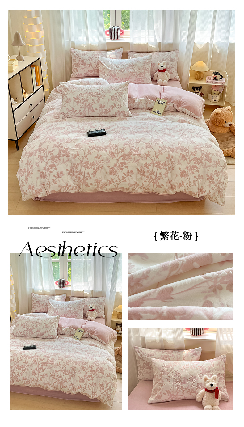 商品名称:莱茵家居 2024新款a类加厚立体雕花牛奶绒四件套 繁花-粉