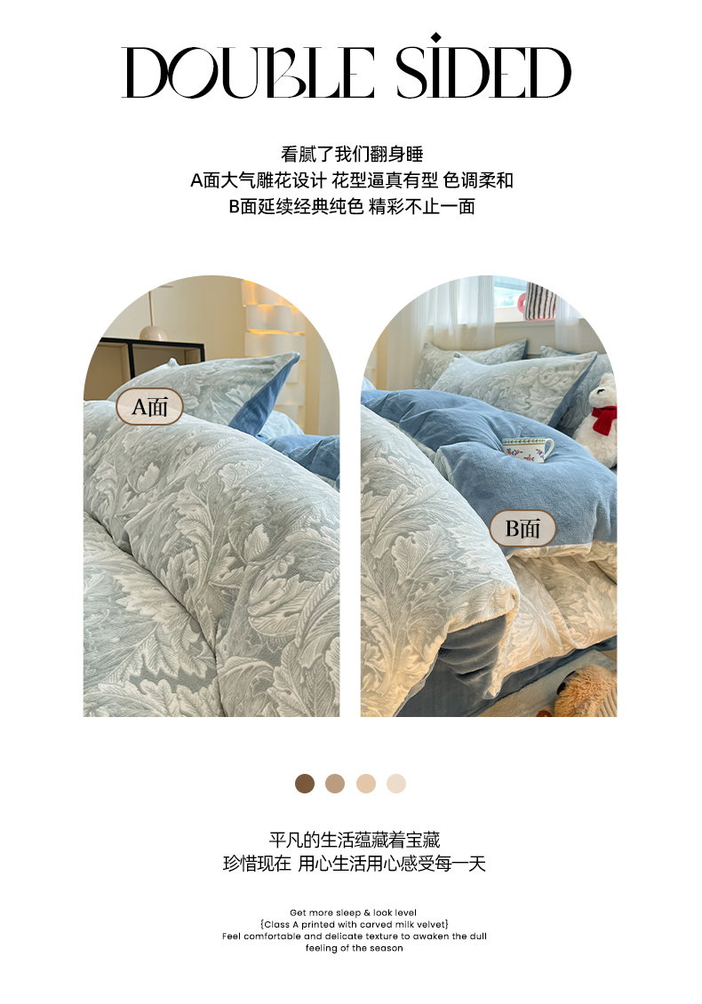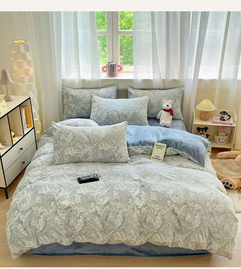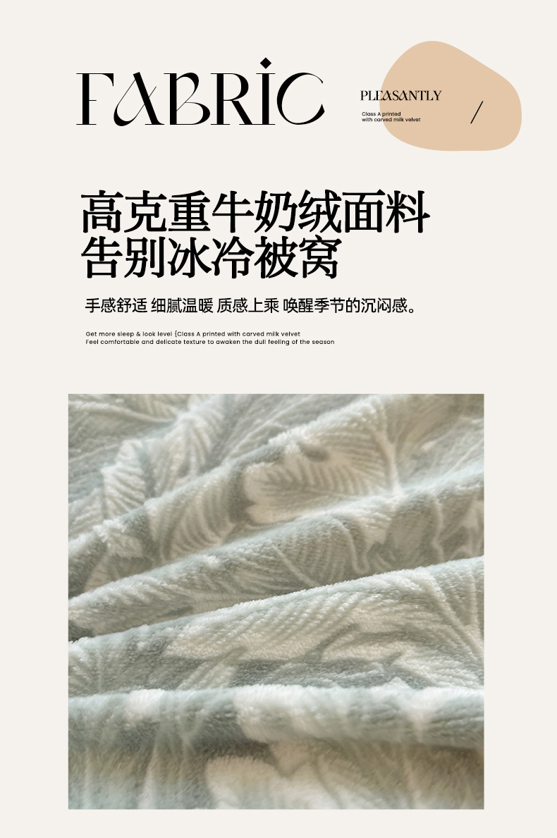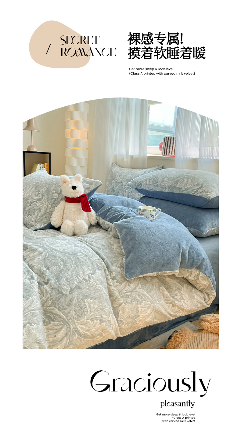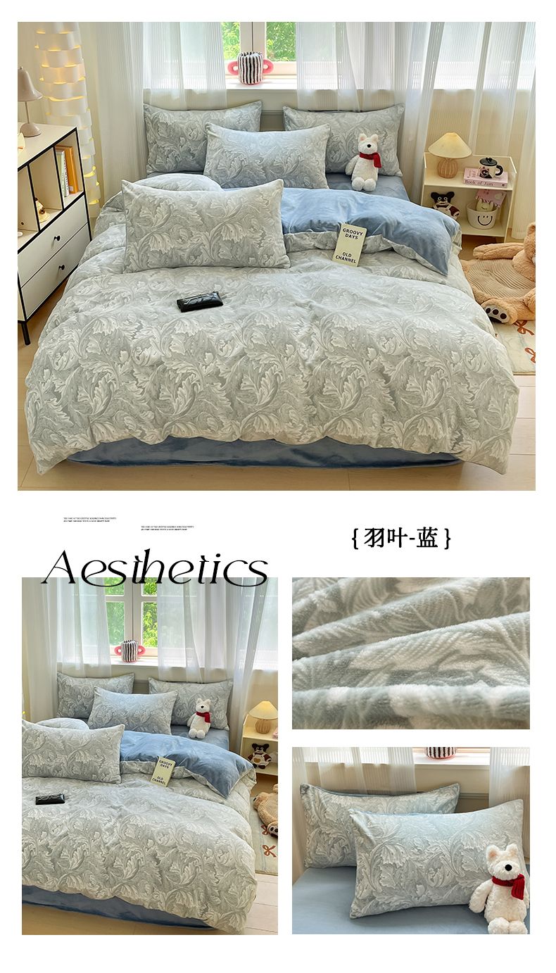 莱茵家居 2024新款a类加厚立体雕花牛奶绒四件套 羽叶-蓝