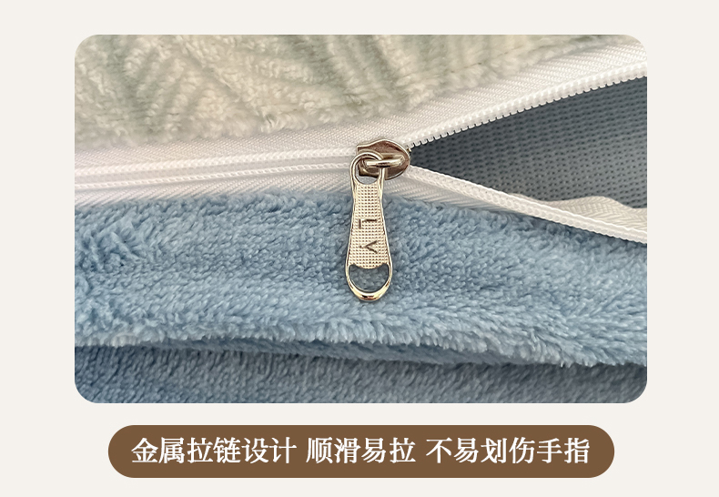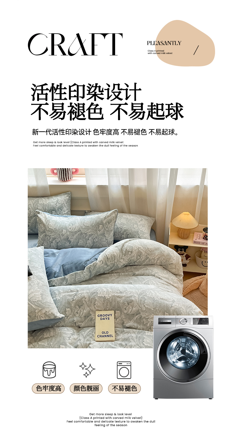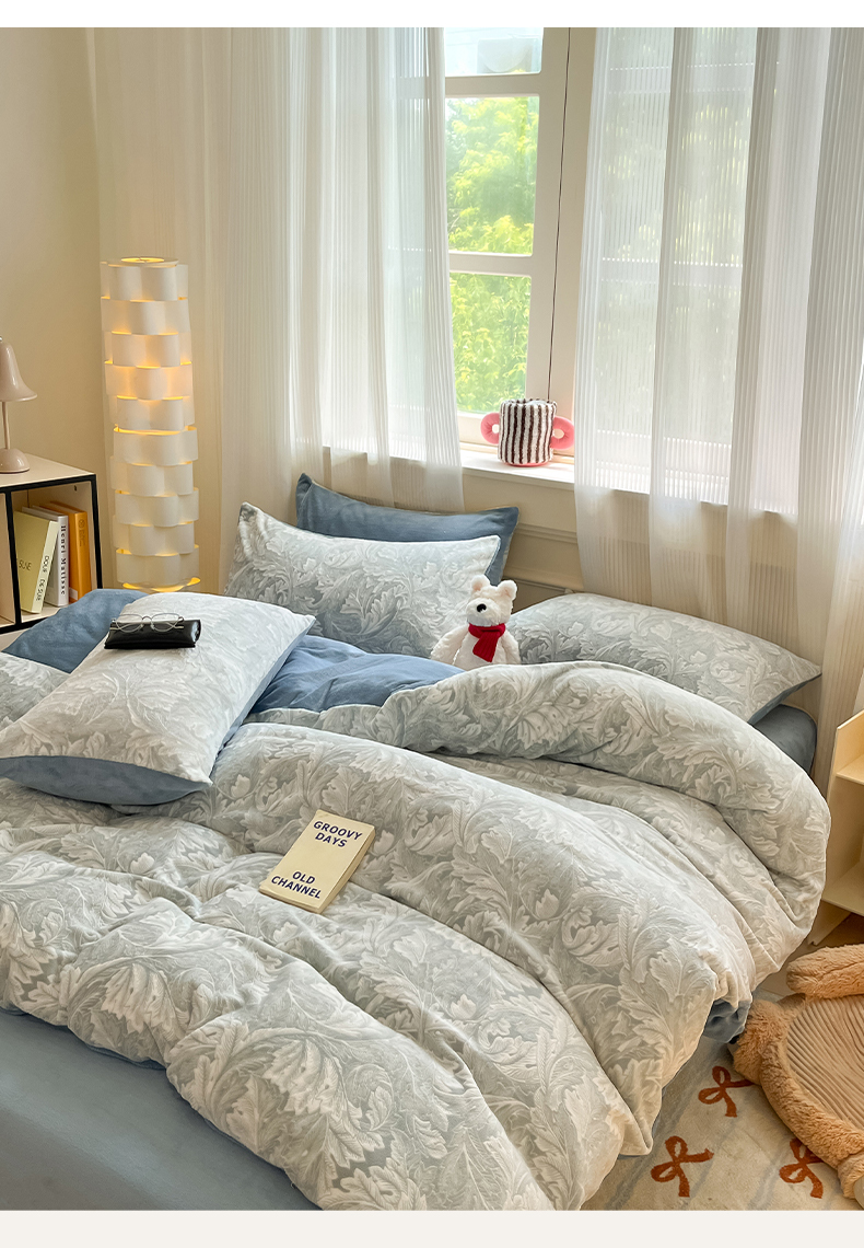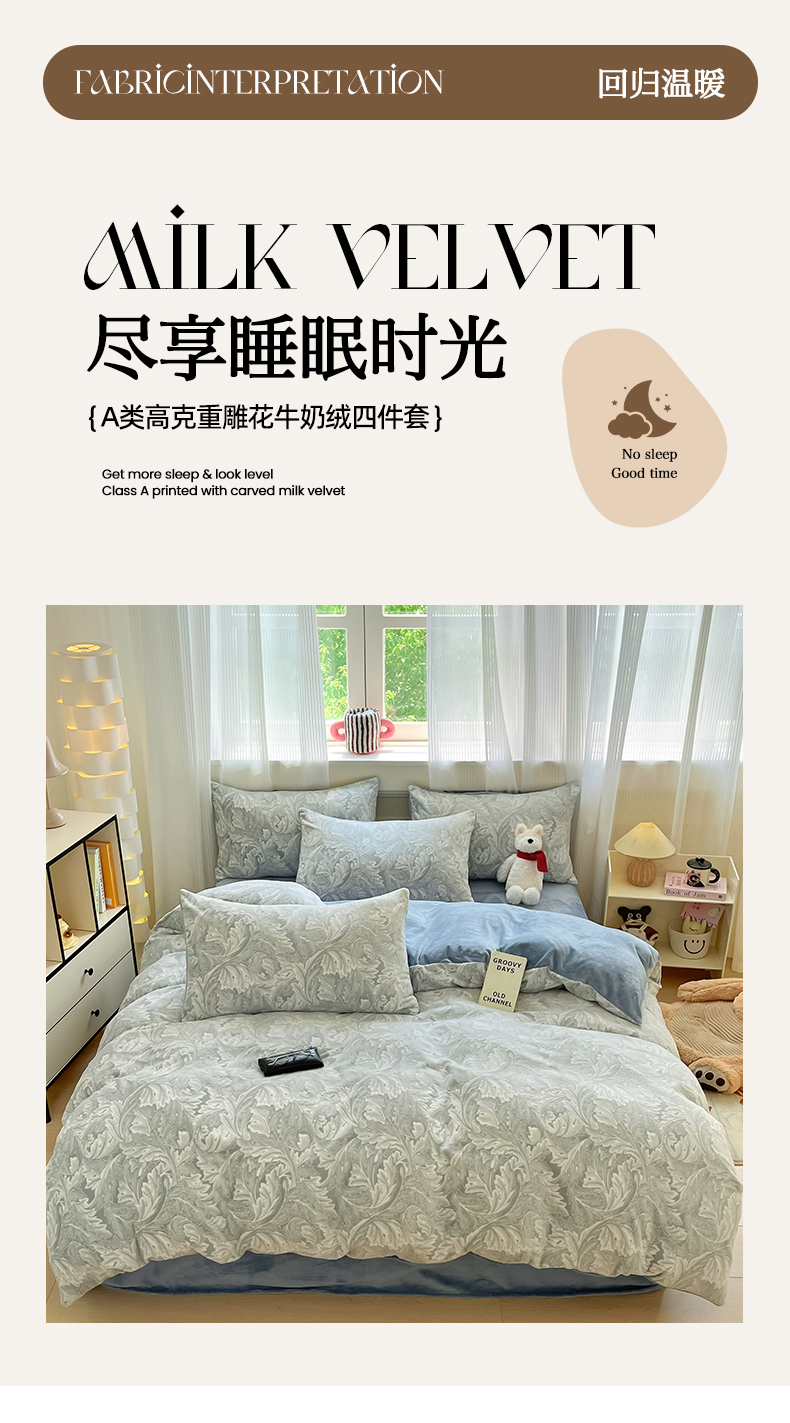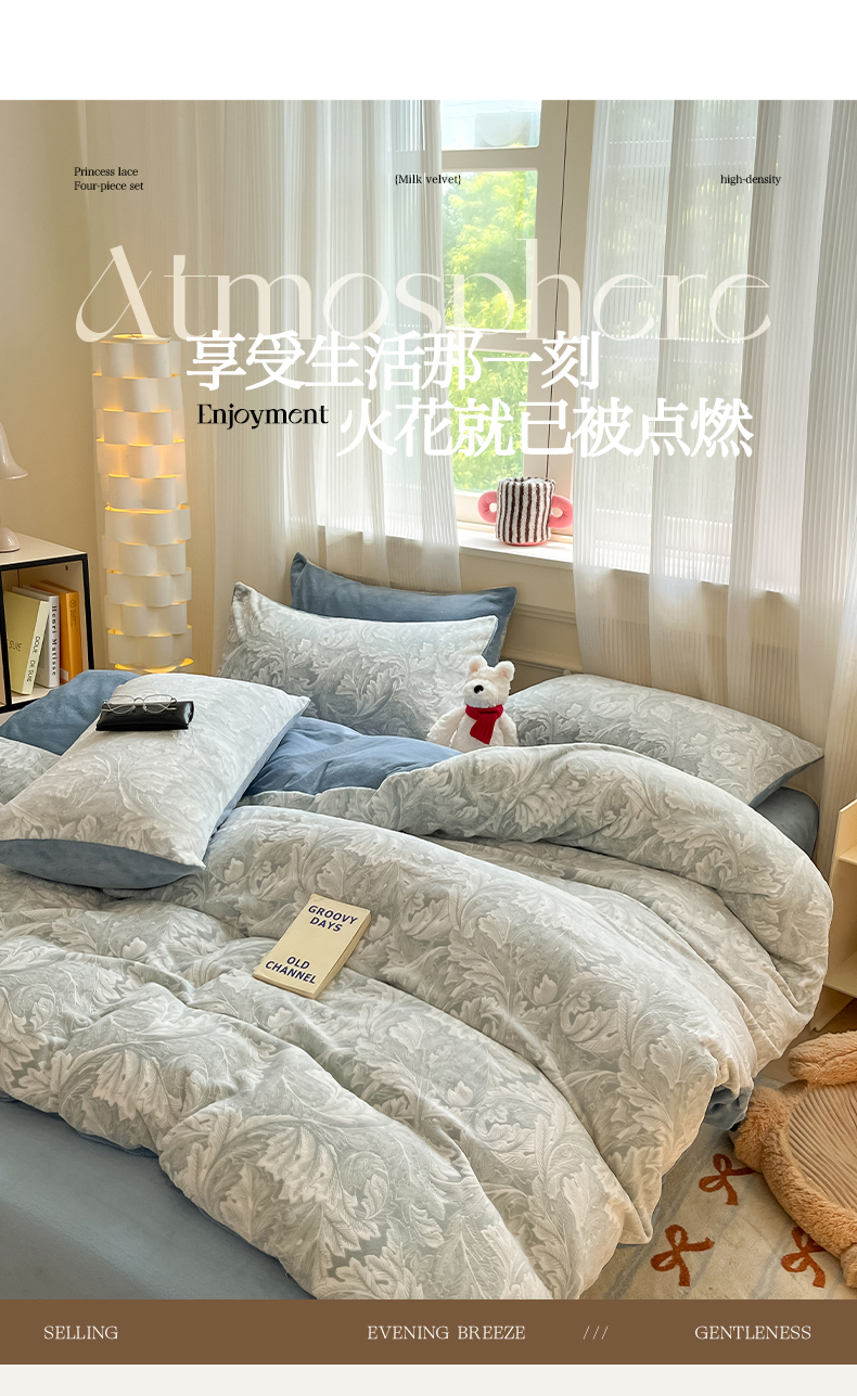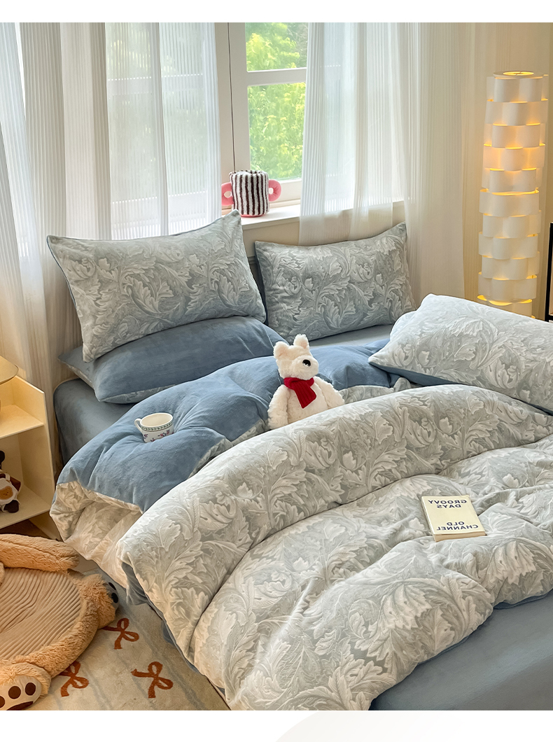 莱茵家居 2024新款a类加厚立体雕花牛奶绒四件套 羽叶-蓝