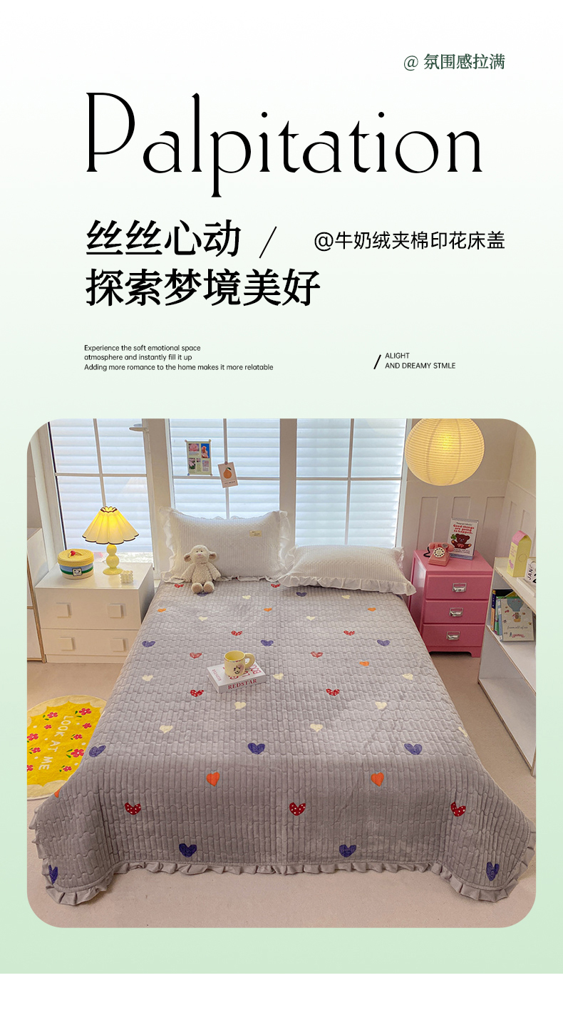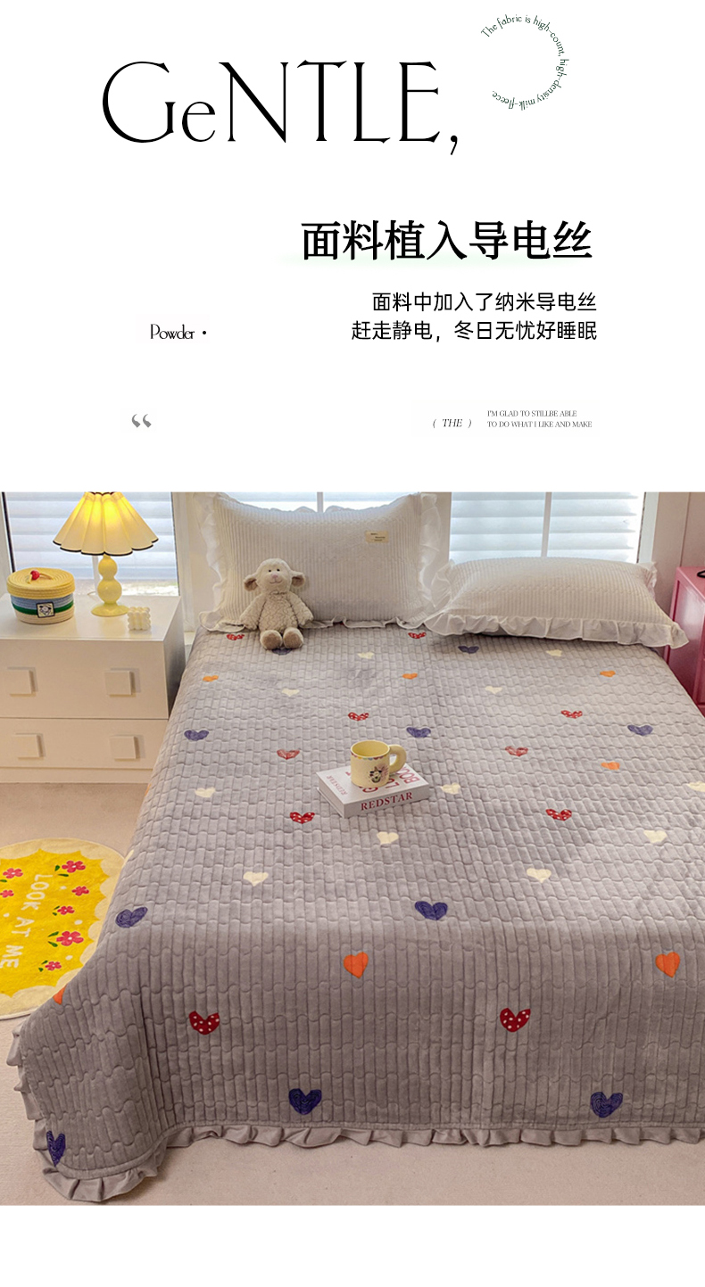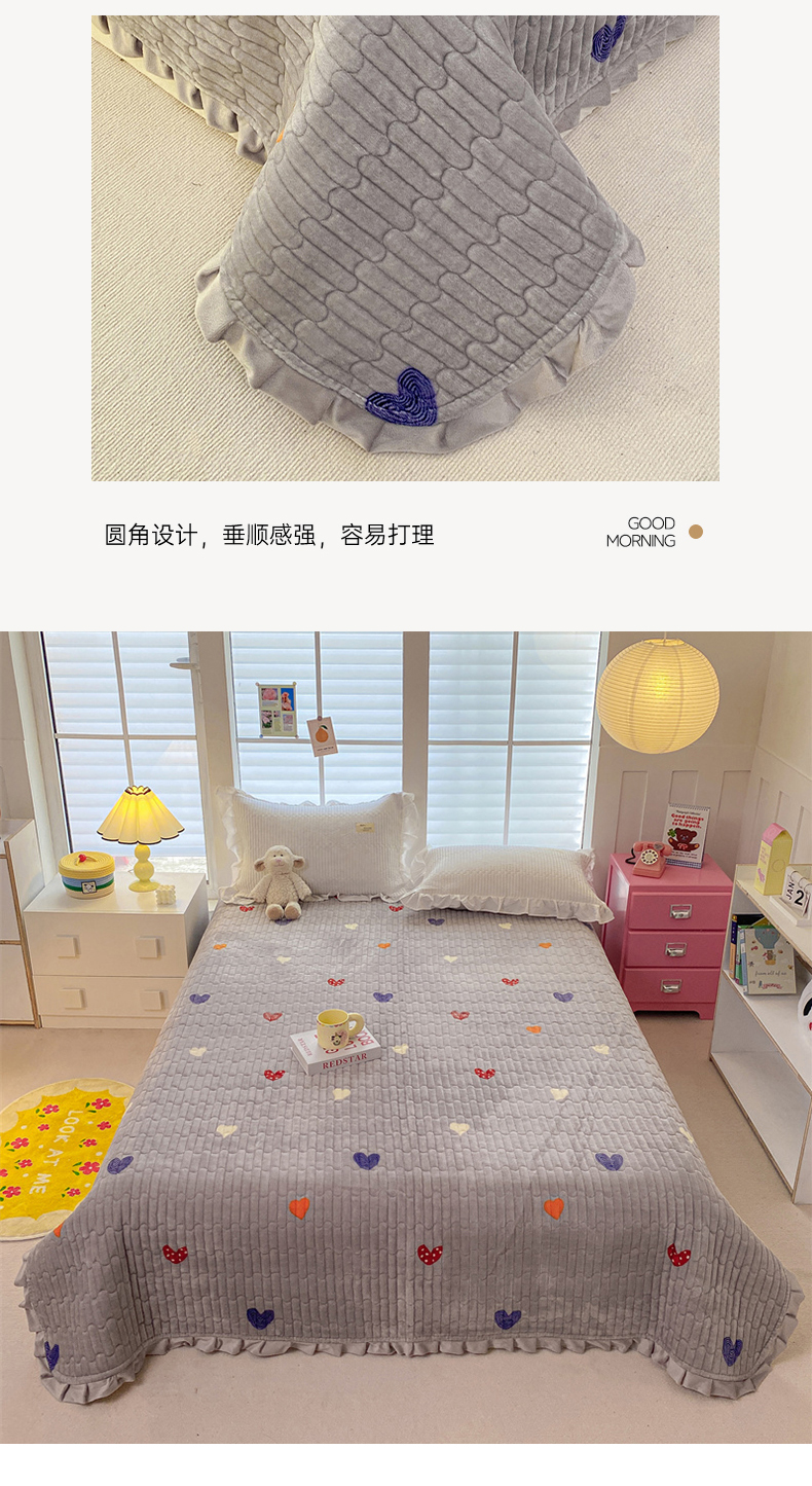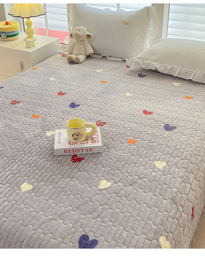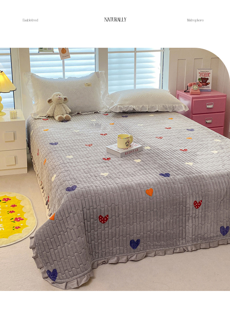 商品名称:胜权家纺 2024秋冬新款印花牛奶绒加厚保暖圆角花边夹棉床盖 多彩爱心灰