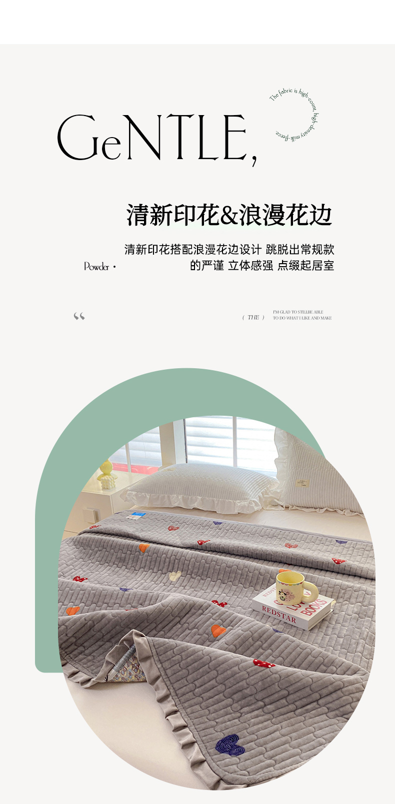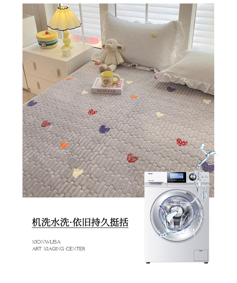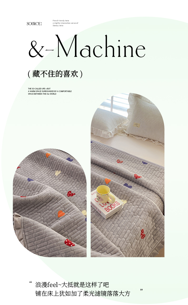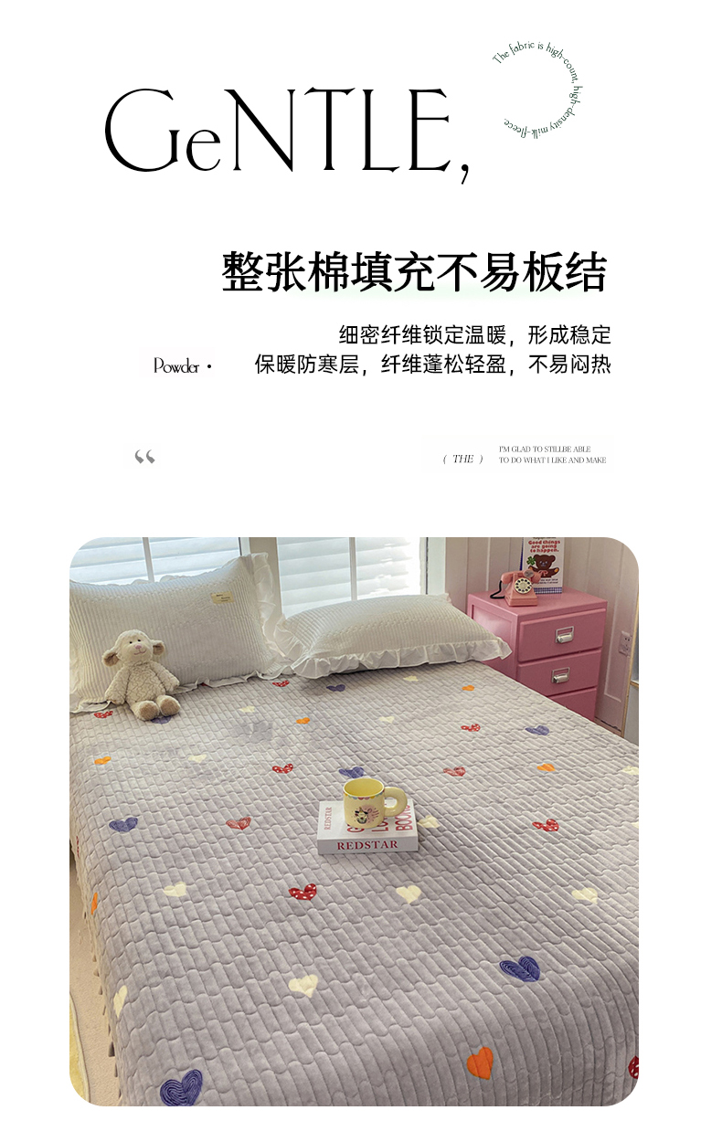 商品名称:胜权家纺 2024秋冬新款印花牛奶绒加厚保暖圆角花边夹棉床盖 多彩爱心灰