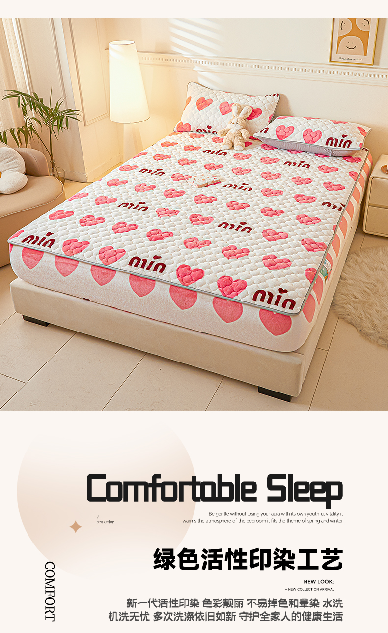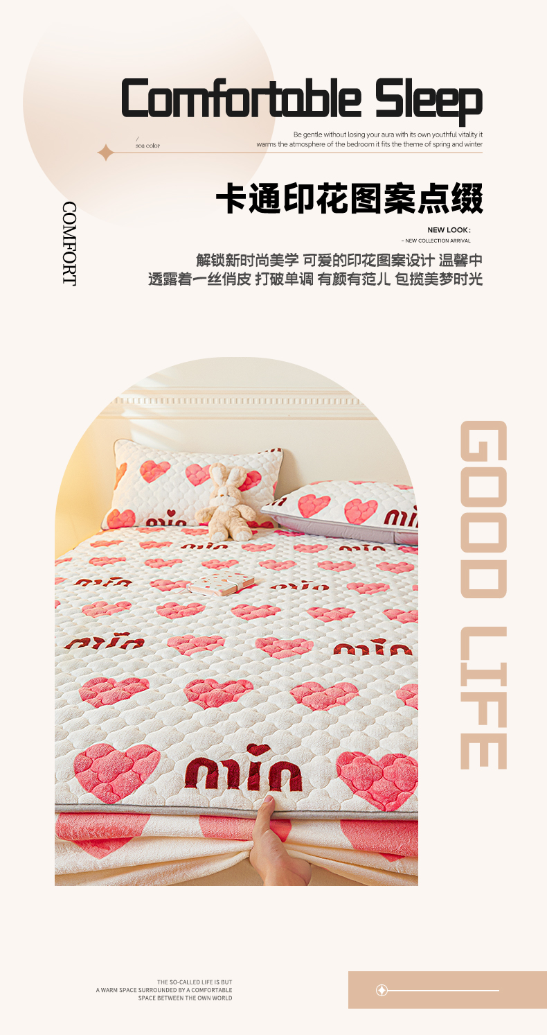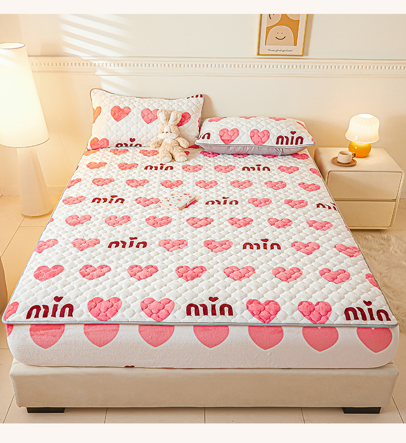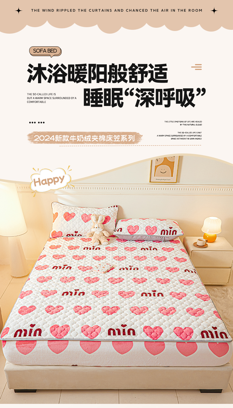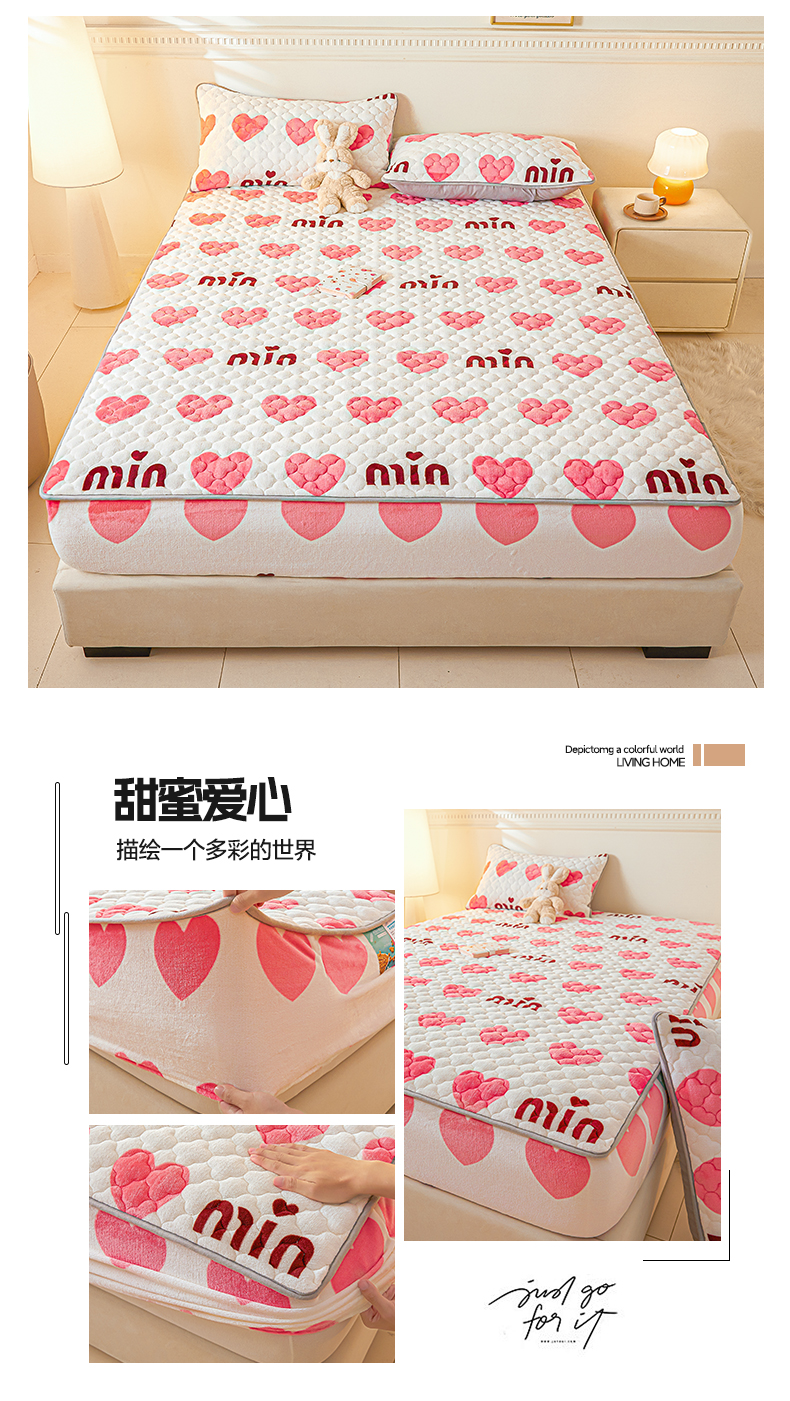 商品名称:卡伦家纺 2025新款A类牛奶绒大豆纤维抗菌夹棉床笠 甜蜜爱心