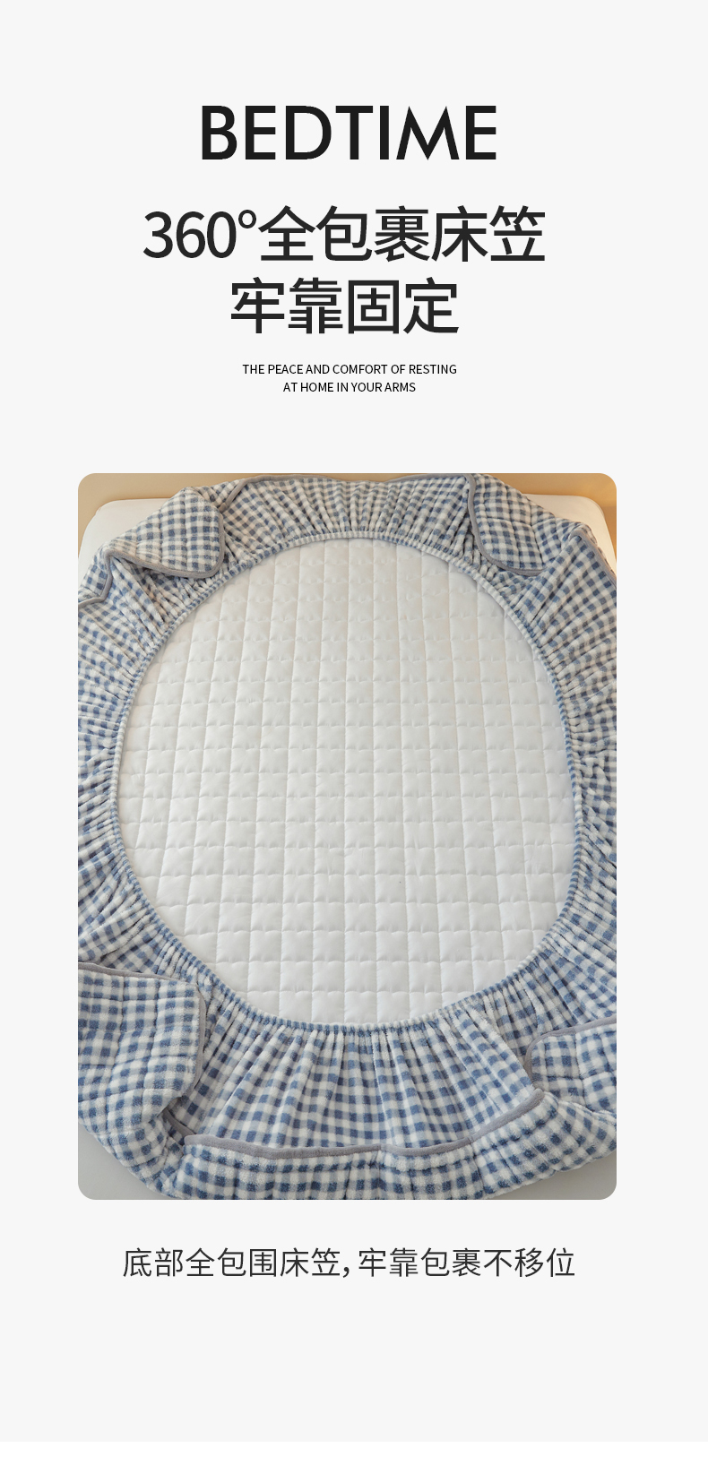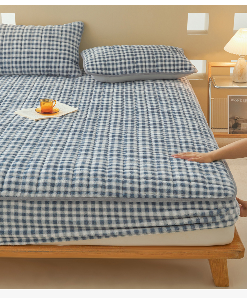 2024秋冬北极绒加厚夹棉床笠三件套印花泰迪绒床垫保护套罩-无印风系列 蓝小格
