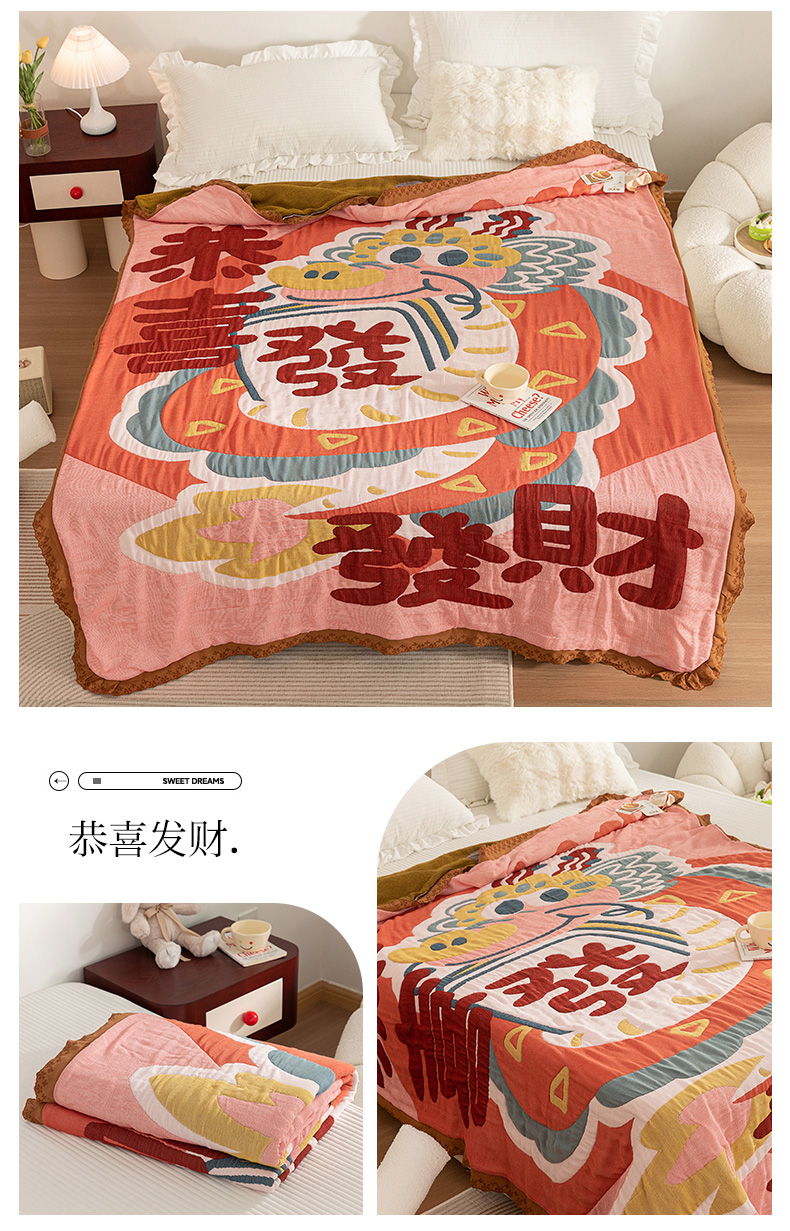 乐家毛巾被 2024新款十层纱布泡芙被 恭喜发财