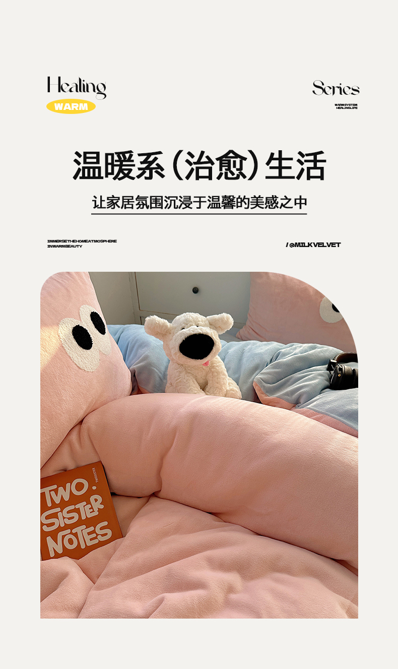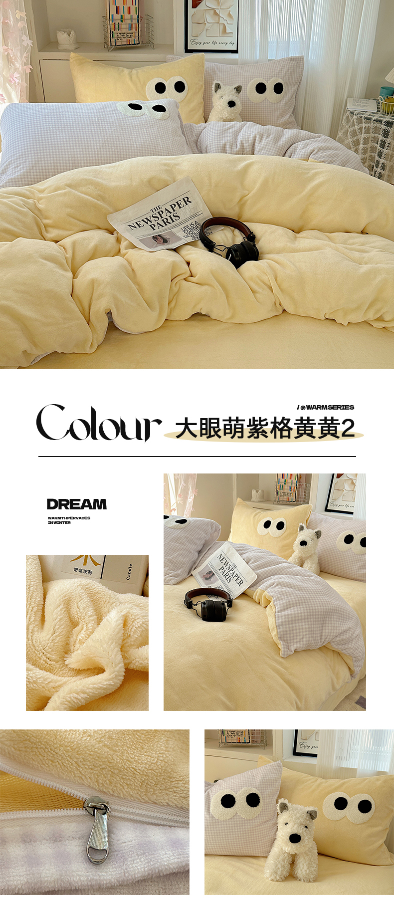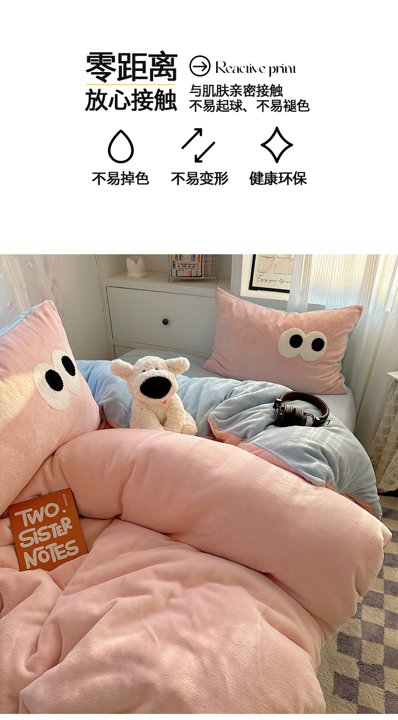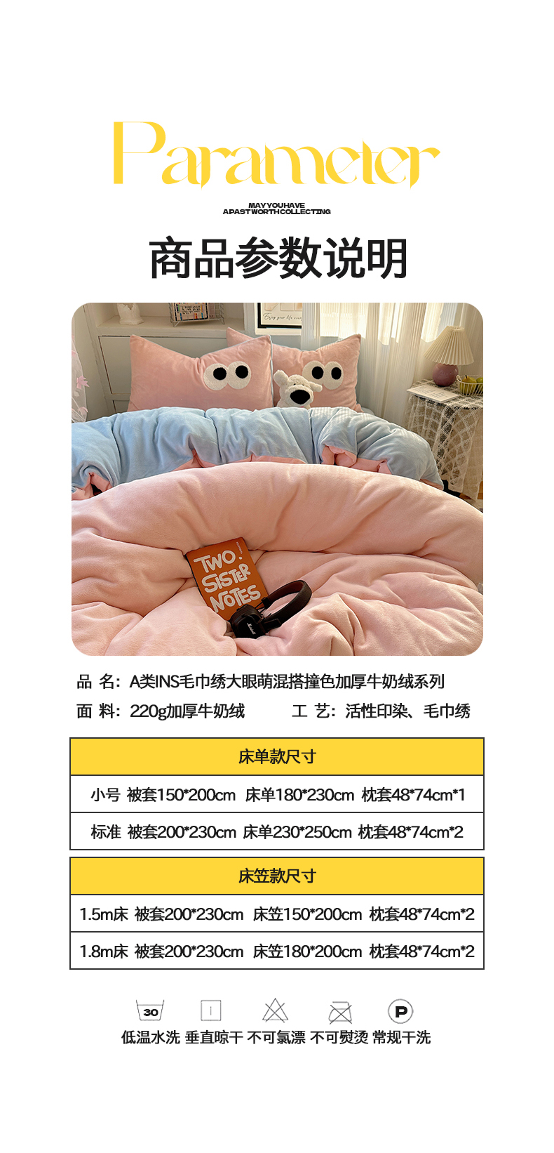 商品名称:(总)桃子家居 2024新款A类ins加厚毛巾绣大眼萌混搭撞色牛奶绒系列四件套