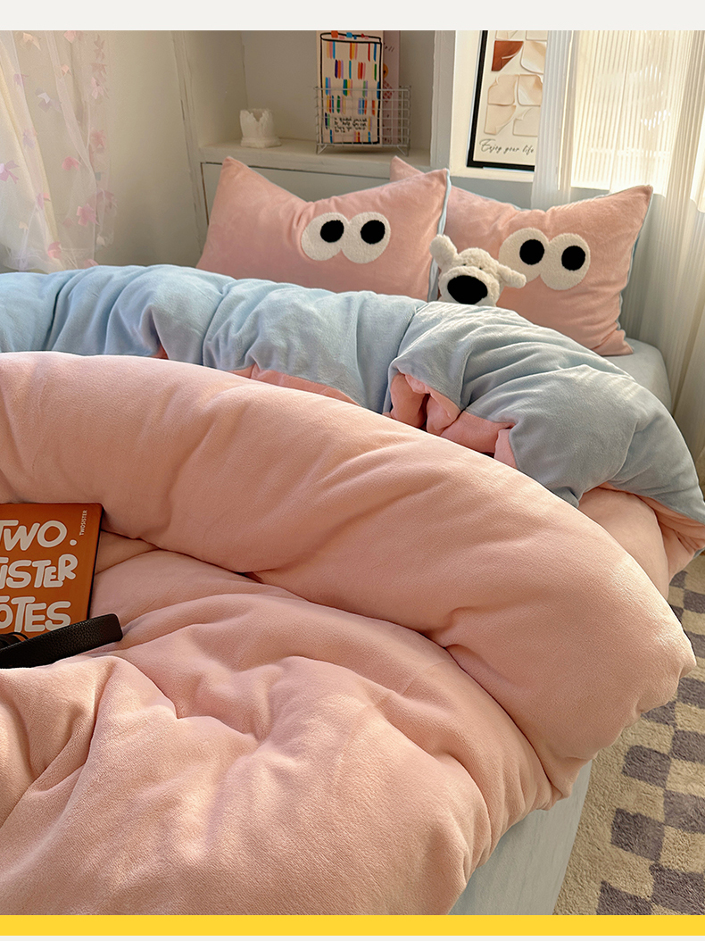 (总)桃子家居 2024新款A类ins加厚毛巾绣大眼萌混搭撞色牛奶绒系列四件套