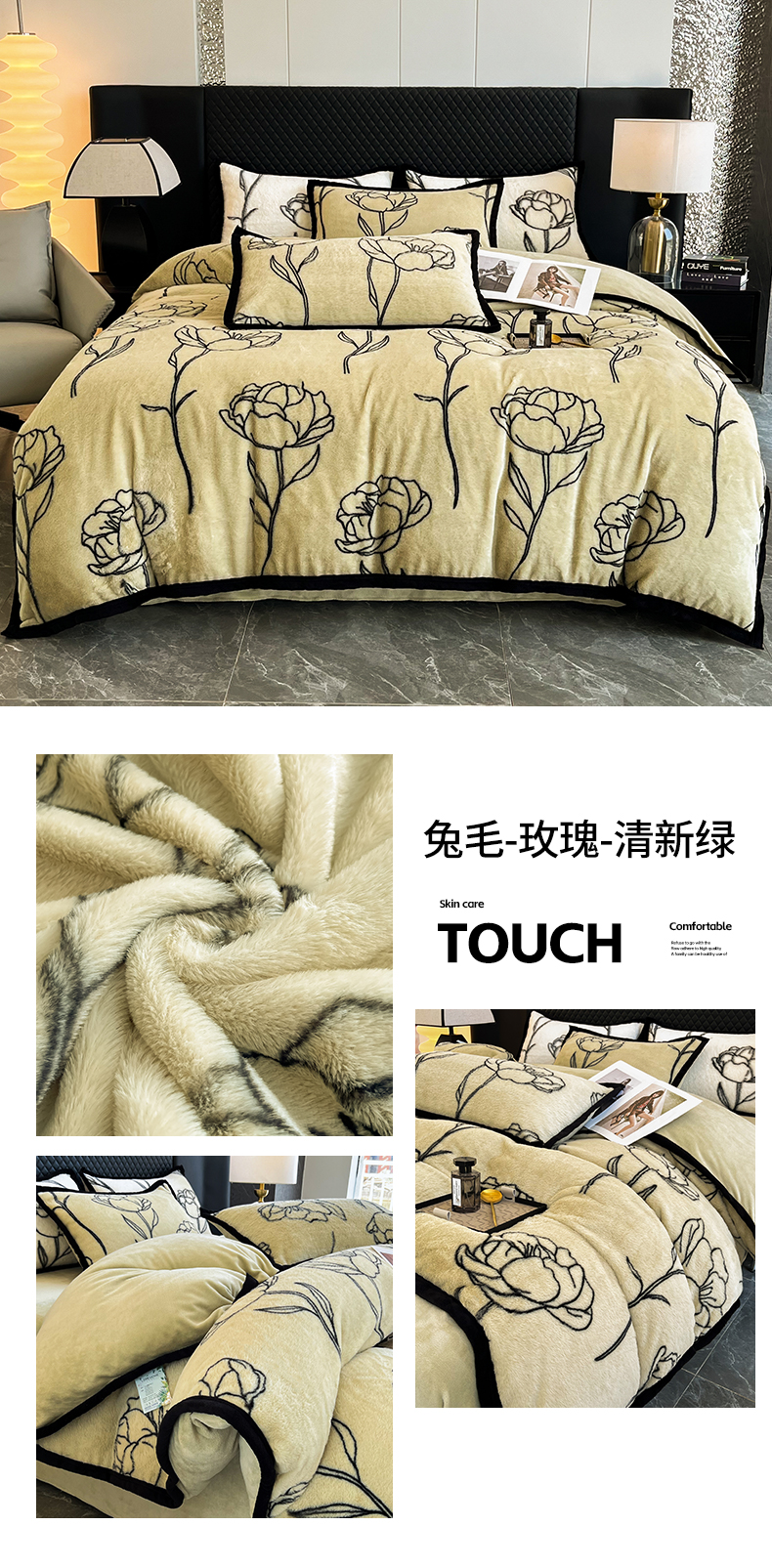 商品名称:慕尚家纺 2025新款宽包边高克重兔兔绒牛奶绒加厚保暖法式系列四件套 兔毛-玫瑰-清新绿