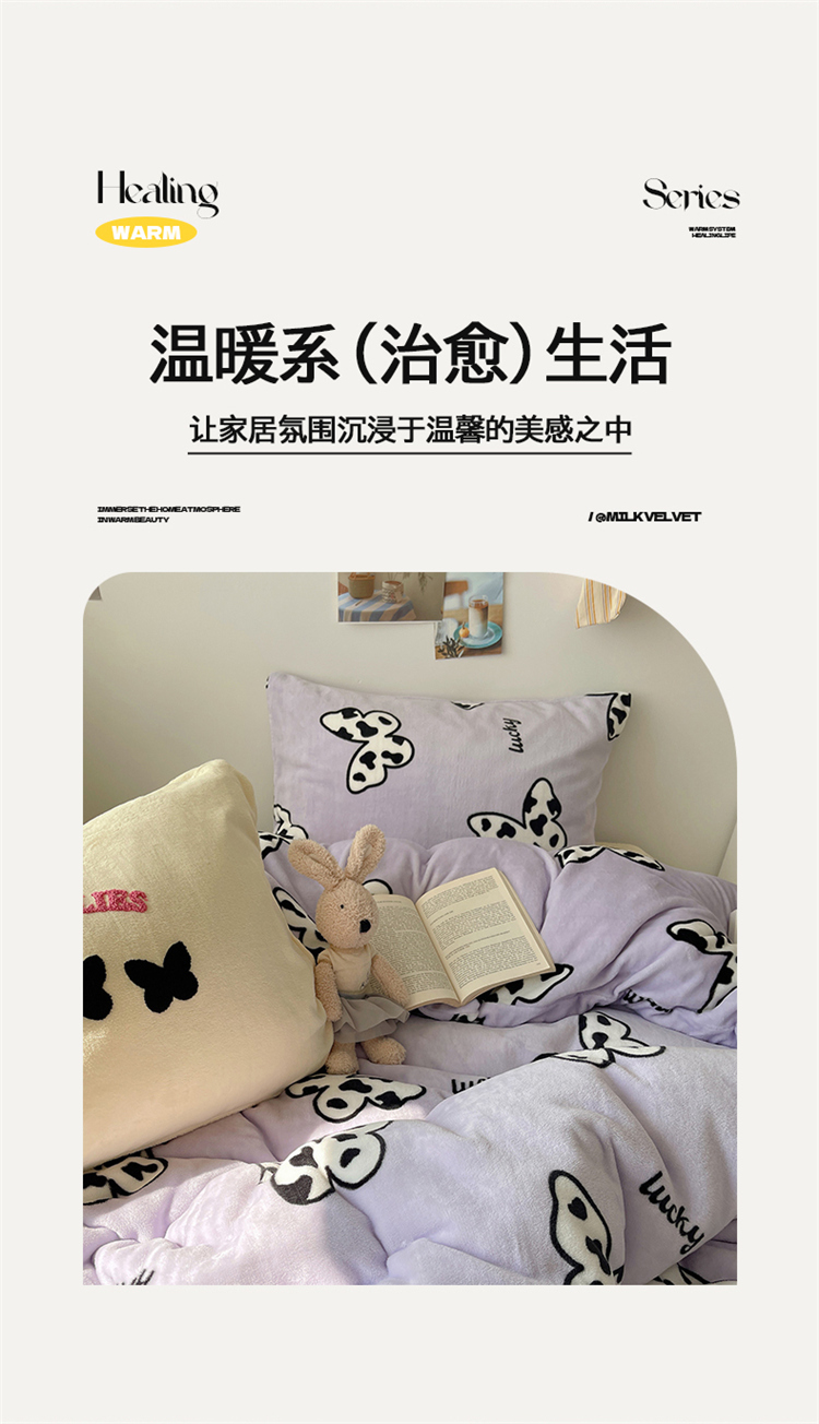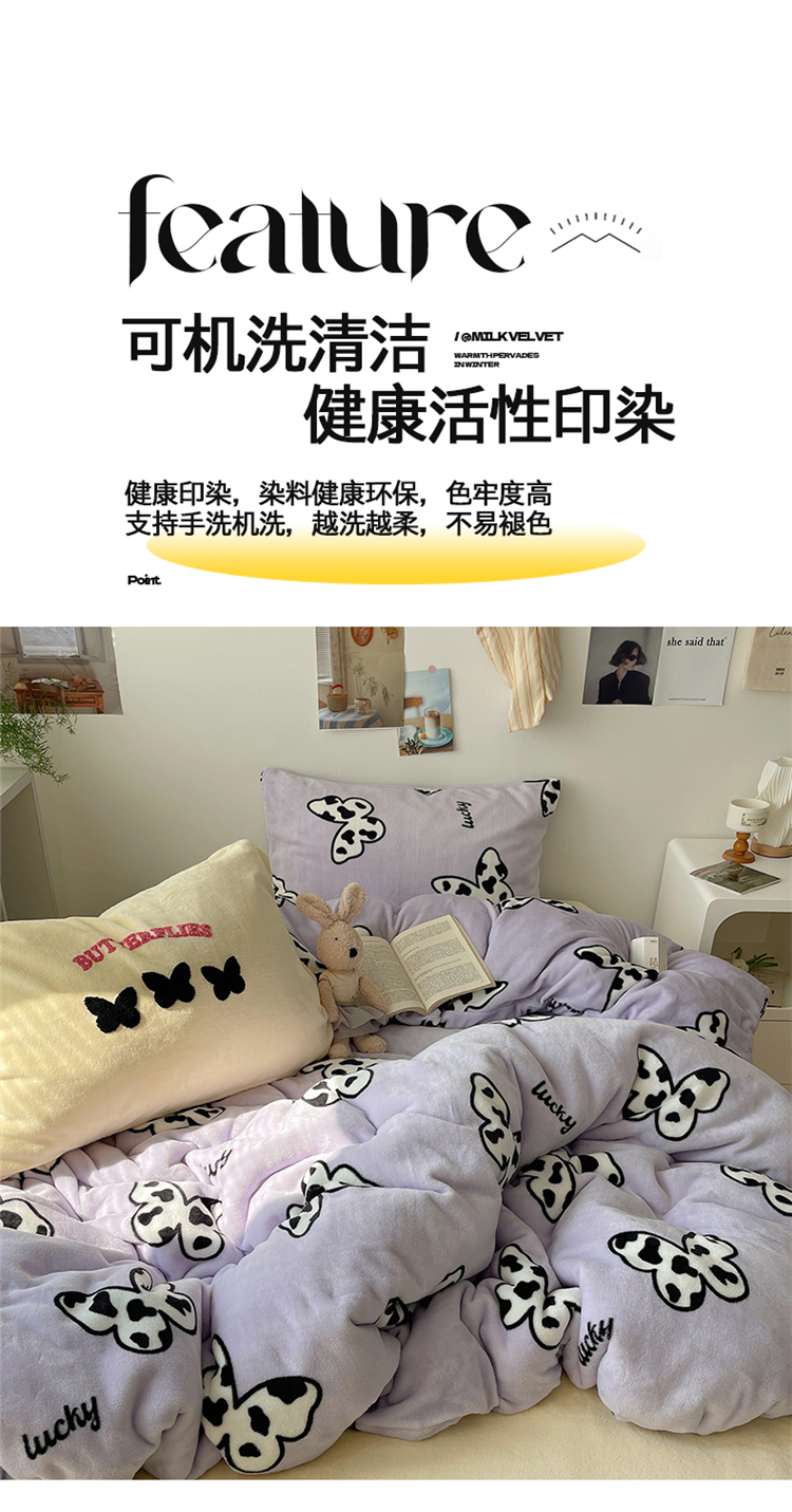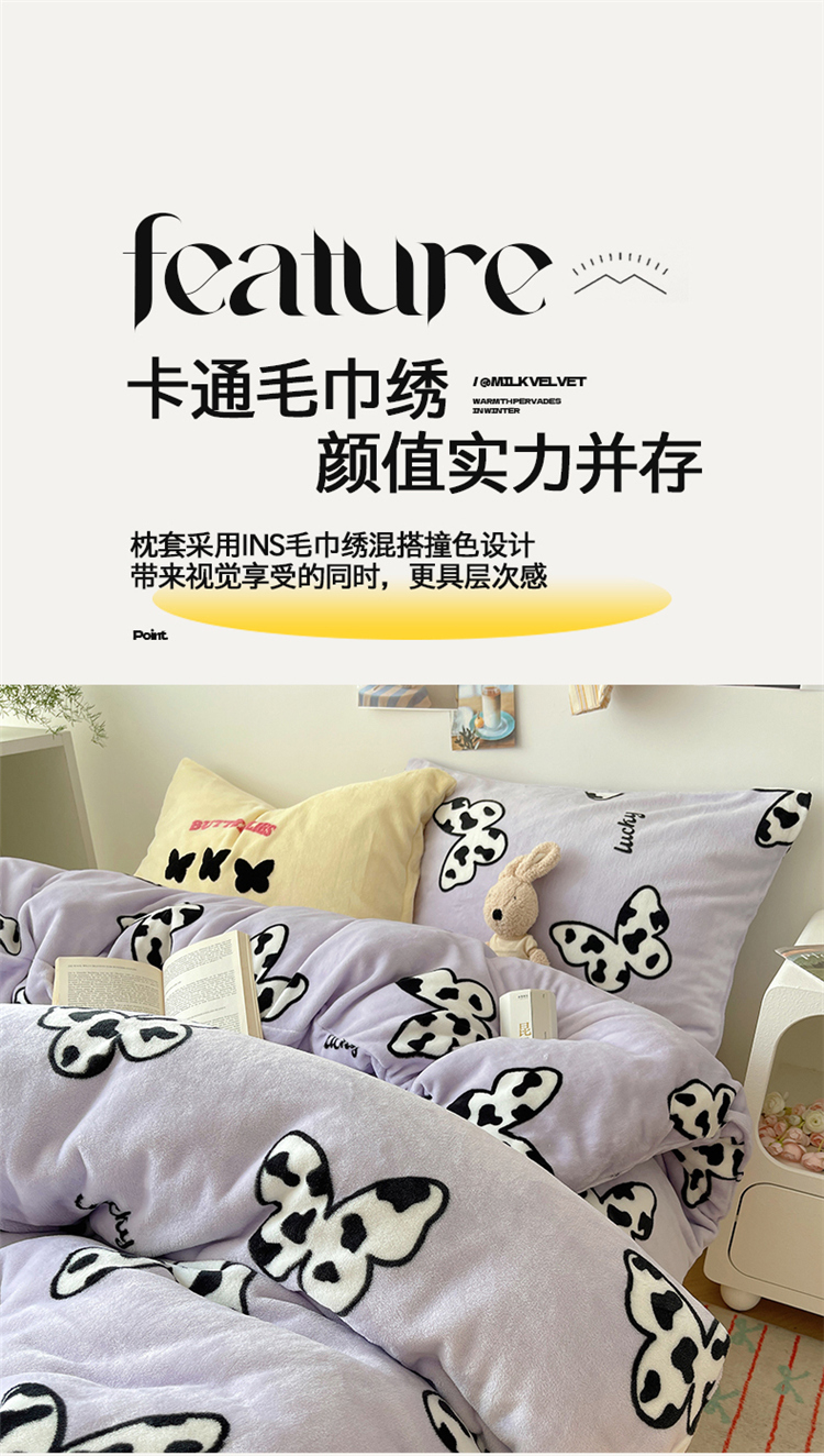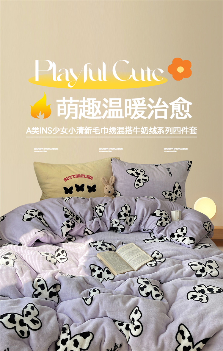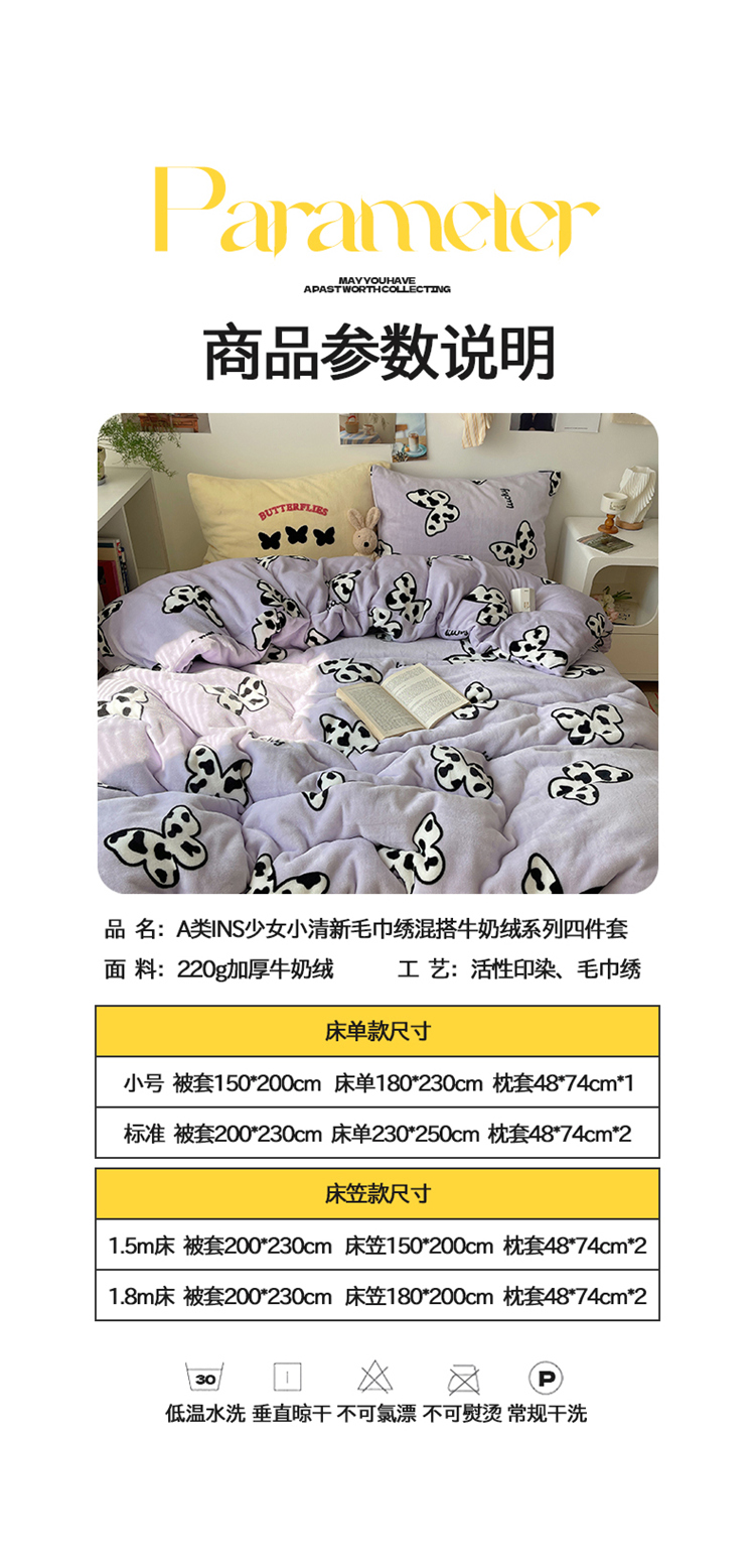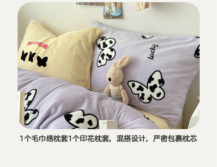 当前位置: 91家纺网 > 商品网购 > 床品套件 > 四件套 > 牛奶绒四件套 > 2024新款A类ins少女小清新蝴蝶爱心蝴蝶结毛巾绣混搭牛奶绒系列四件套 绒毛巾绣-奶牛蝴蝶紫